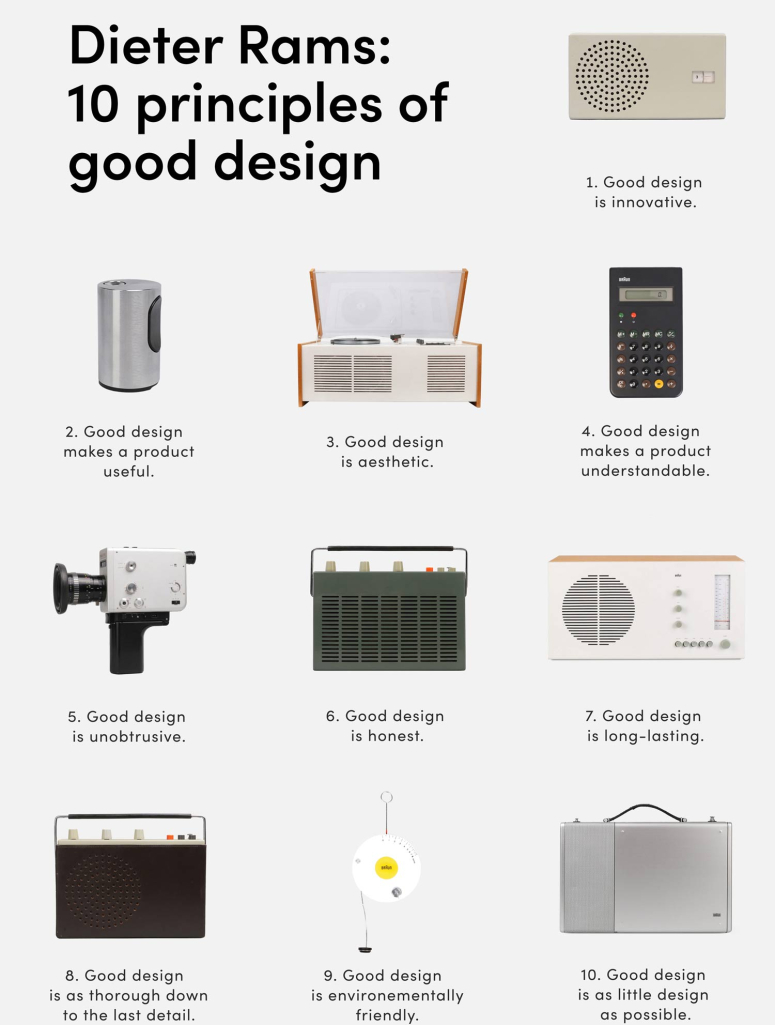In the 1970s, Dieter Rams developed his famous 10 principles of good design which have inspired designers across the world. These are the ten principles: 01. Good Design Is Innovative / 02. Good Design Makes a Product Useful / 03. Good Design Is Aesthetic / 04. Good Design Makes A Product Understandable / 05. Good Design Is Unobtrusive / 06. Good design is honest / 07. Good design is durable / 08. Good design is consequent to the last detail / 09. Good design is eco-friendly / 10. Good design is as little design as possible