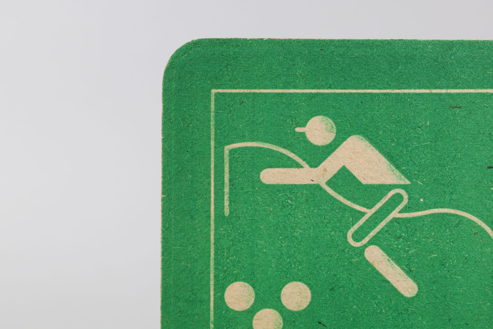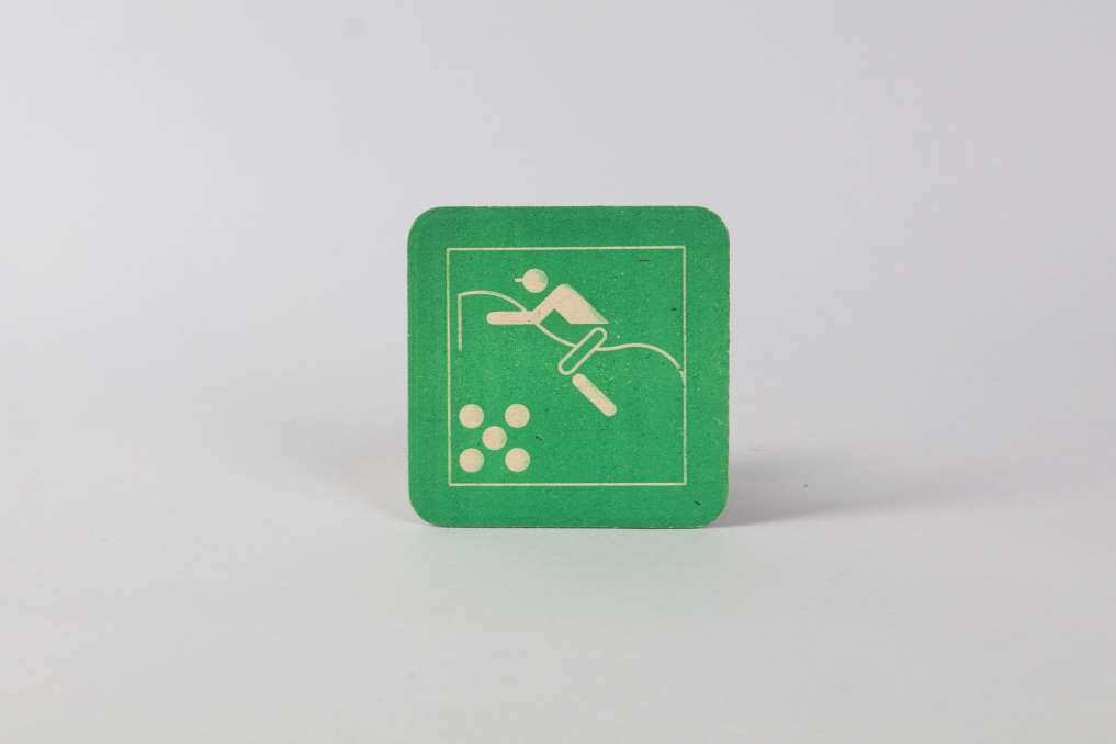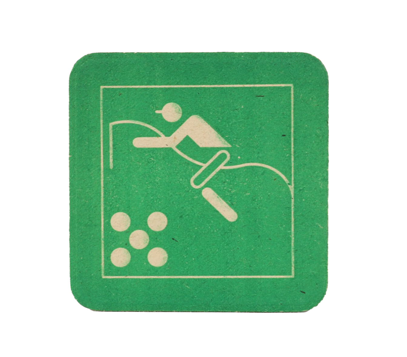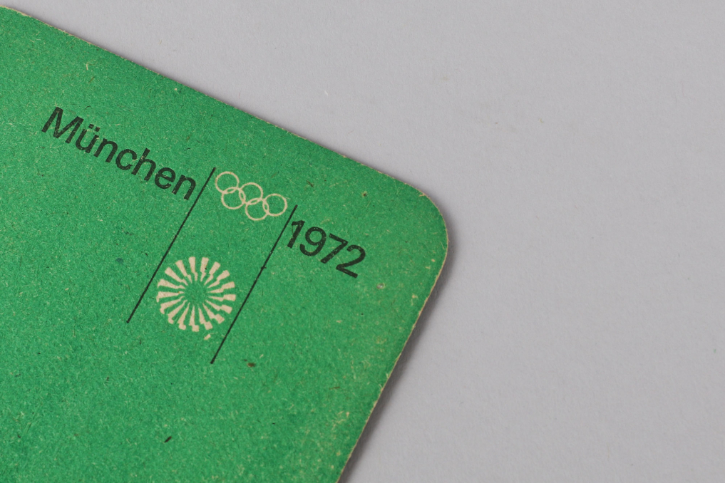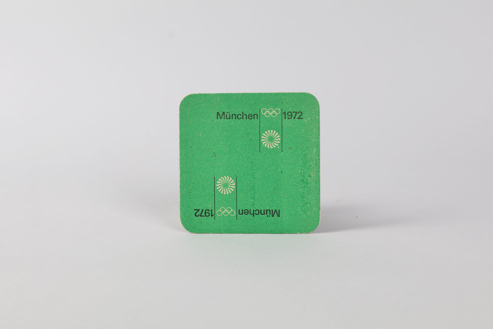 A unique piece of sports history with this rare collectible beer mat, designed by the renowned designer Otl Aicher for the 1972 Munich Olympic Games. Crafted from paper cardboard, this beer mat features a horse rider iconography on the front side, set against a vibrant green backdrop. On the backside you will find the 1972 Olympic Games logo. A must-have for collectors and sports enthusiasts alike, this beer mat not only celebrates a pivotal event in Olympic history but also showcases Aicher's iconic and legendary brand identity.
