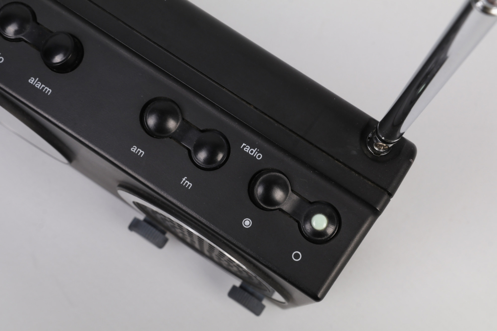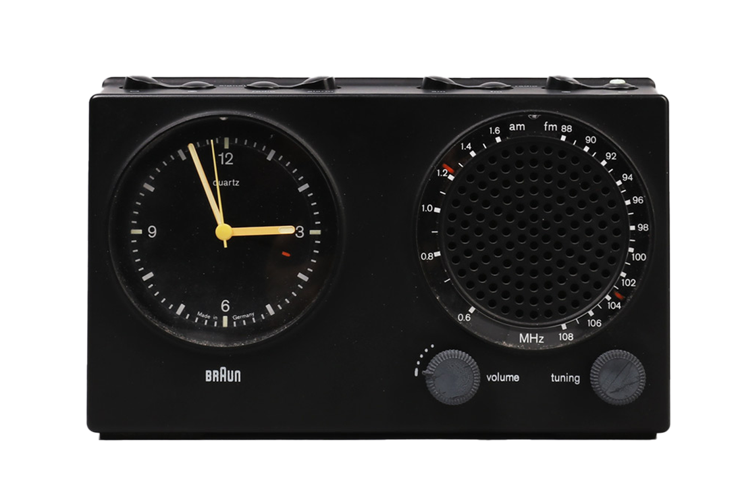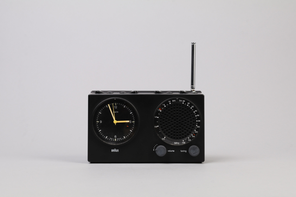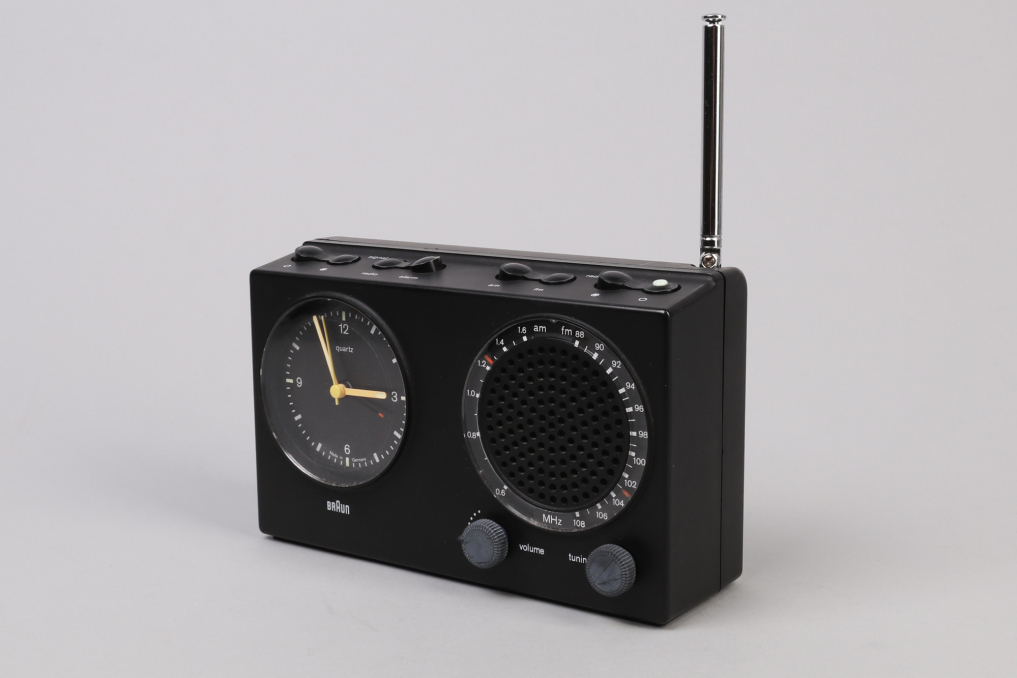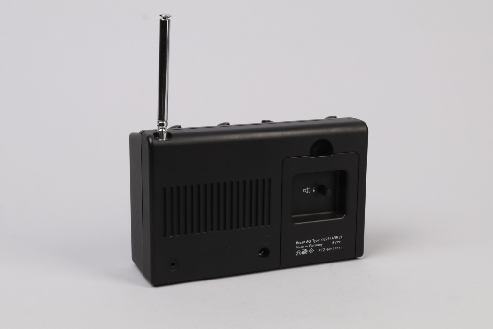 Beautiful design classic radio with integrated alarm clock by Braun - ABR 21. Designed in Germany by Dieter Rams in 1979. The iconic radio is made of black plastic and the clock runs with a silent precise quartz mechanic. The radio includes 4 main switches on the top and 2 rotating knobs on the front. The antenna can be pull out of the radio with adjustable size and possibility to rotate. Excellent working condition. The clock runs on a battery. The retaining tabs on the battery cover are broken, so the radio cannot be operated on battery power because the cover cannot be closed (a common problem with this series). The radio can however be operated at 6V using the universal power supply included.