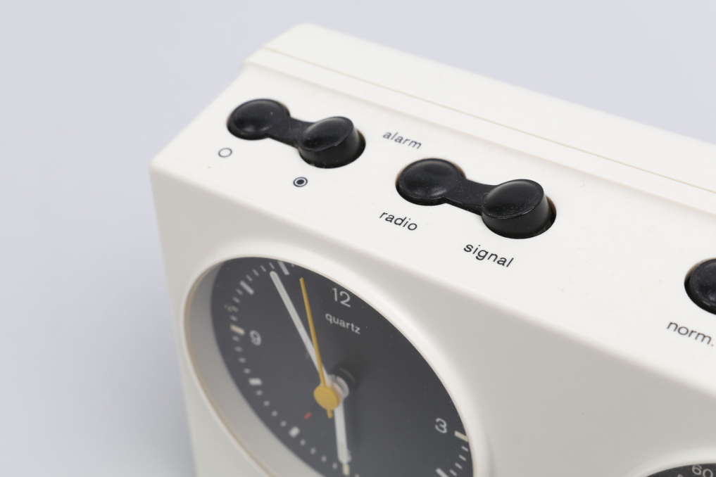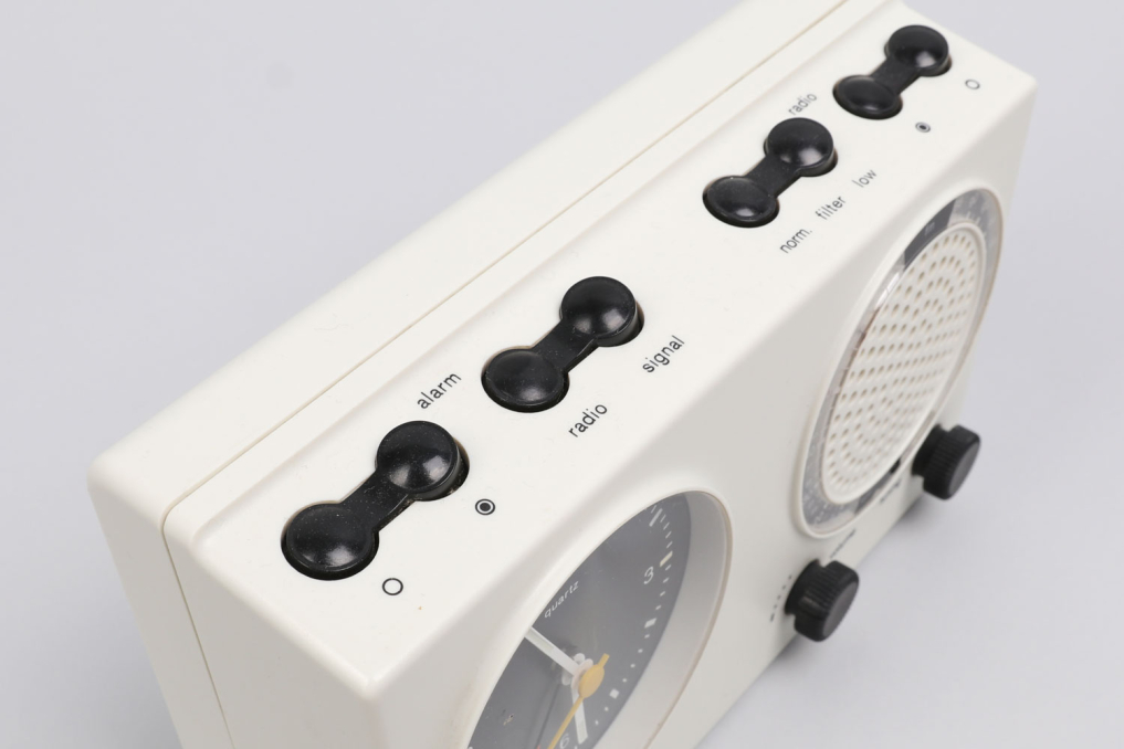 Beautiful and very rare design classic radio with integrated alarm clock by Braun - ABR 21 / Typ 4840 in white color. Designed in Germany by Dietrich Lubs (& Dieter Rams) in 1979. The iconic radio is made of plastic and the clock runs with a silent precise quartz mechanic. The radio includes 4 main switches on the top and 2 rotating knobs on the front. The antenna can be pull out of the radio with adjustable size and possibility to rotate.