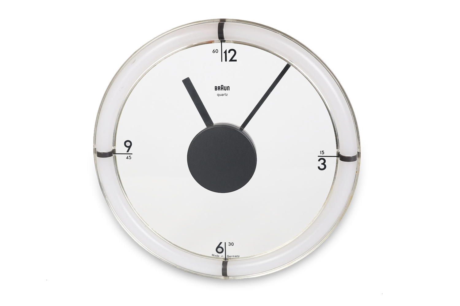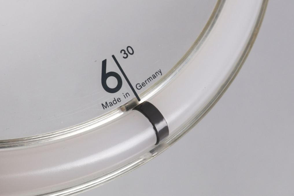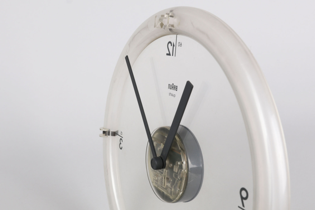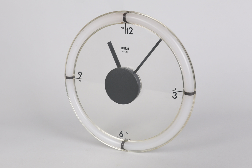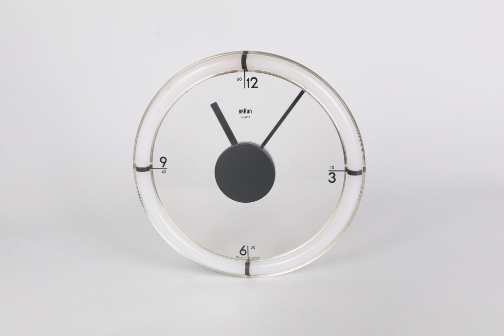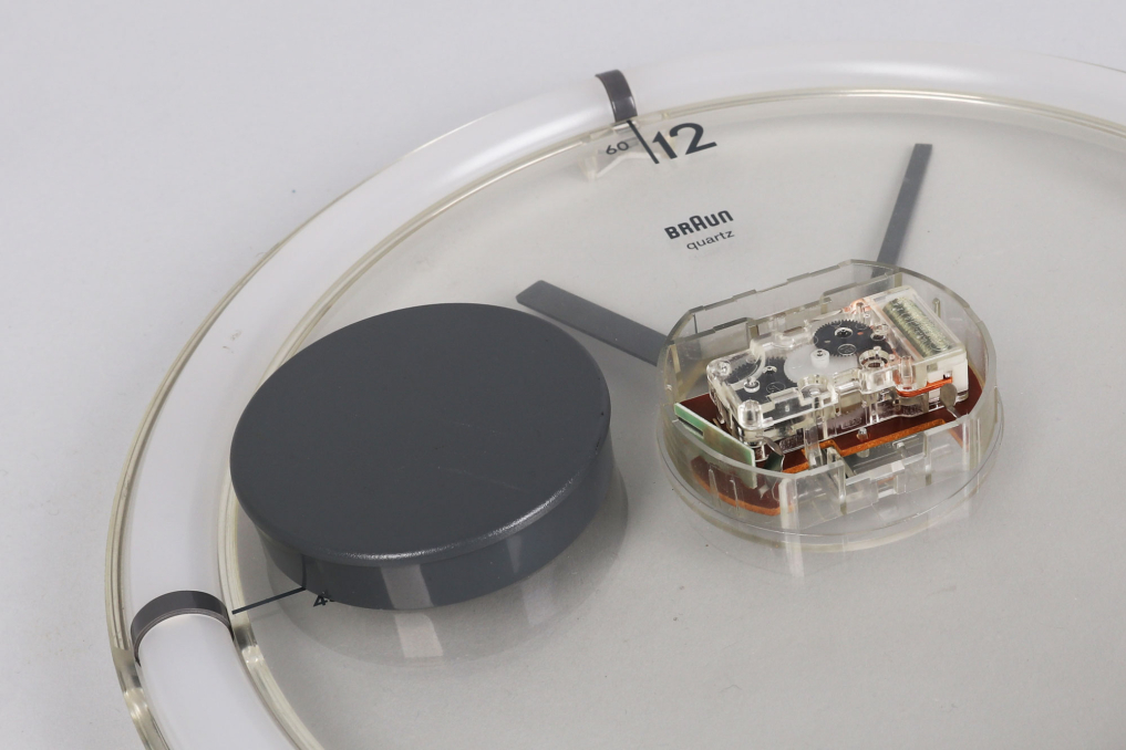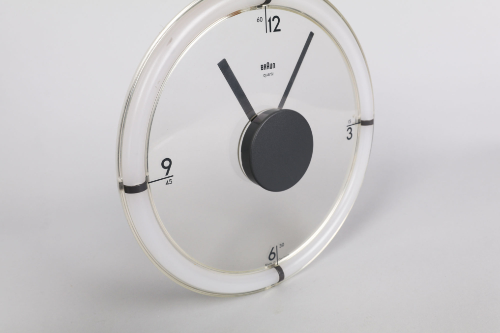 The Braun ABW 35 wall clock, designed by Dietrich Lubs in 1988, is a really rare and iconic example of minimalist design. Its standout feature is the transparent dial, which makes the numbers and hands appear to float over the background. The anthracite-colored plastic frame complements the engraved numbers, which elegantly pair hours and minutes at the quarter-hour points. The clock mechanism is uniquely positioned at the front, while a clear plastic hook on the back allows for seamless wall mounting. Fully functional in excellent condition. This clock is a timeless masterpiece of industrial design.
