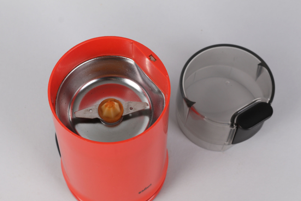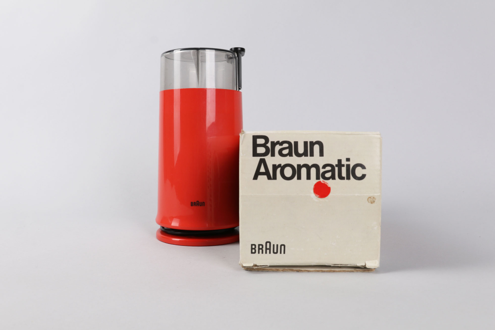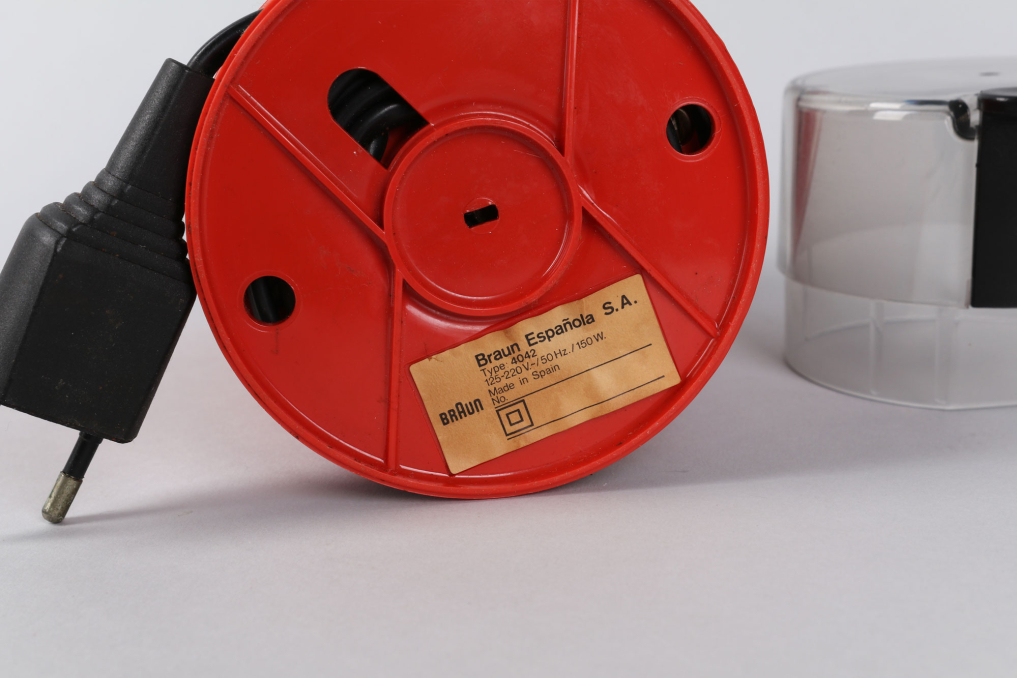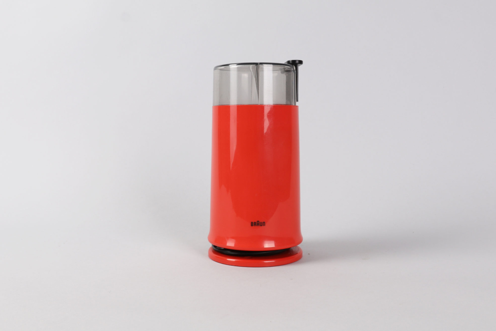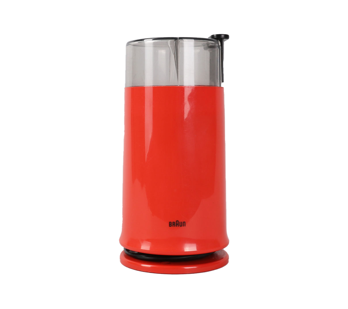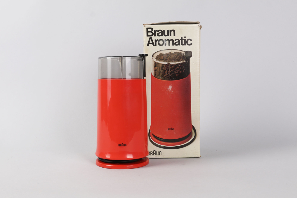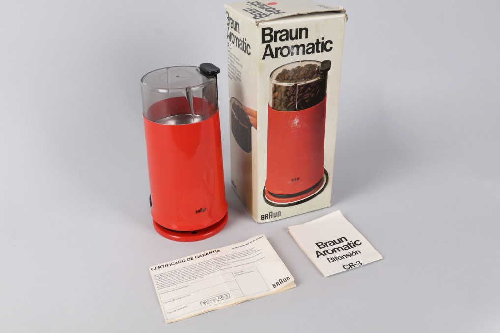 Enhance your coffee experience with the rare Braun Aromatic KSM 2 / CR 3 coffee grinder, designed in 1979 by Reinhold Weiss and Hartwig Kahlcke. Available in vibrant red and including the original packaging, this CR 3 model was sold exclusively in Spain. It combines sleek design with efficient functionality for the perfect coffee every time. Its superb condition makes it a coveted piece for both enthusiasts and collectors.