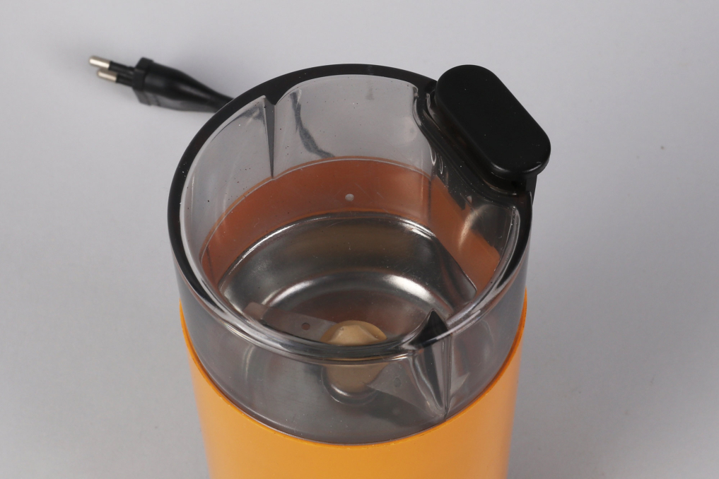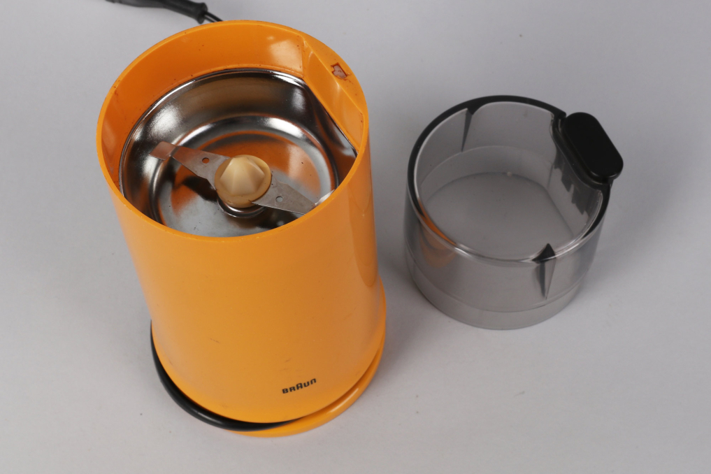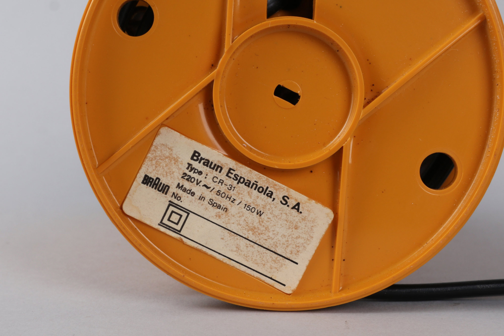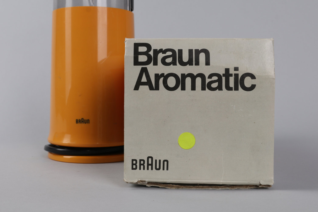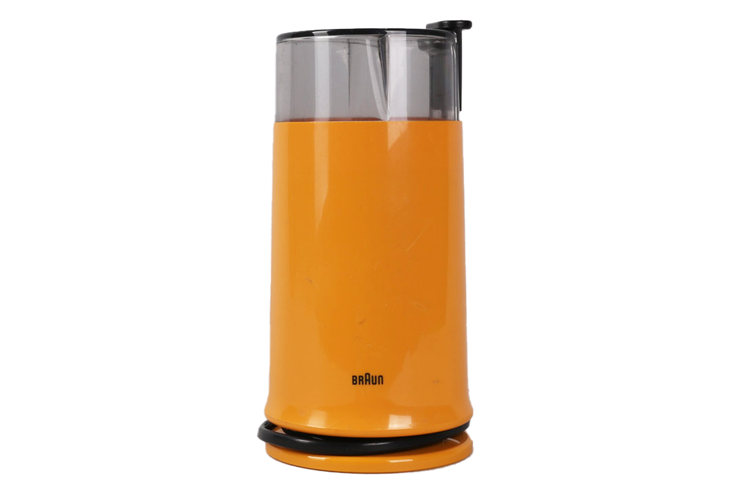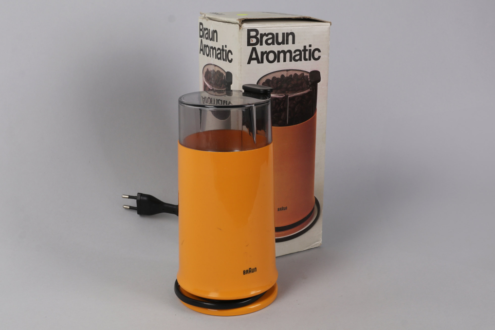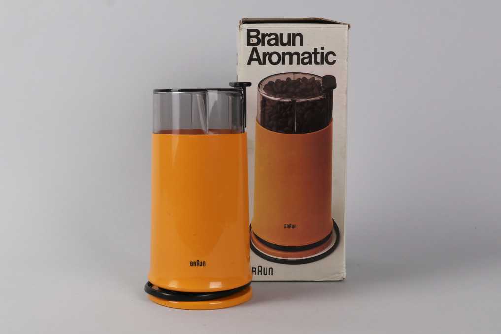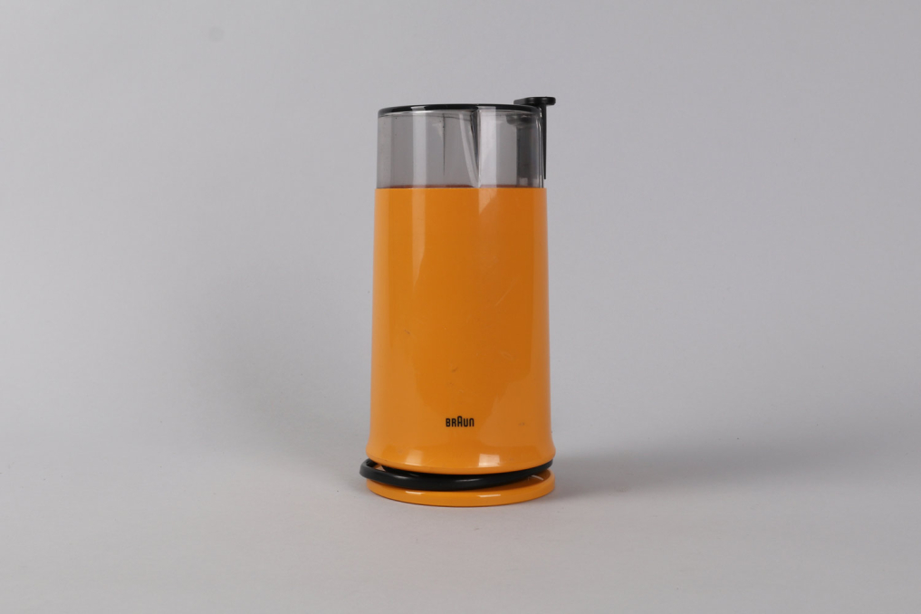 Enhance your coffee experience with the rare Braun Aromatic KSM 2 / CR 3 coffee grinder, designed in 1979 by Reinhold Weiss and Hartwig Kahlcke. Available in vibrant yellow and including the beautiful original packaging, this CR 3 model was sold exclusively in Spain. It combines sleek design with efficient functionality for the perfect coffee every time. Its superb condition makes it a coveted piece for both enthusiasts and collectors.