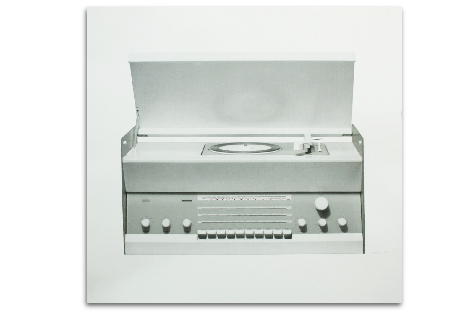 Original vintage Braun Phono Atelier 1 Print art print. Photography printed in black & red color on white thicker paper. Ideal for decoration purposes (ie. in frame). Excellent, almost new condition given its age.