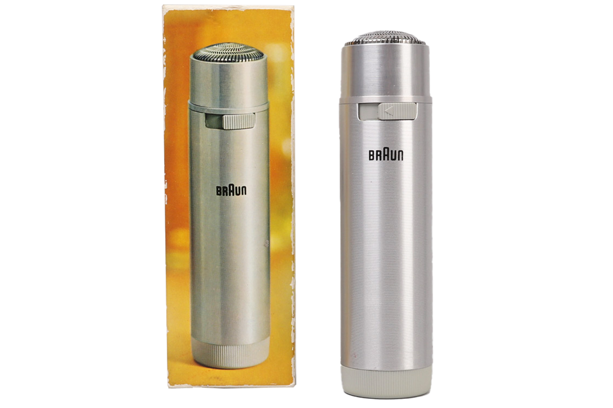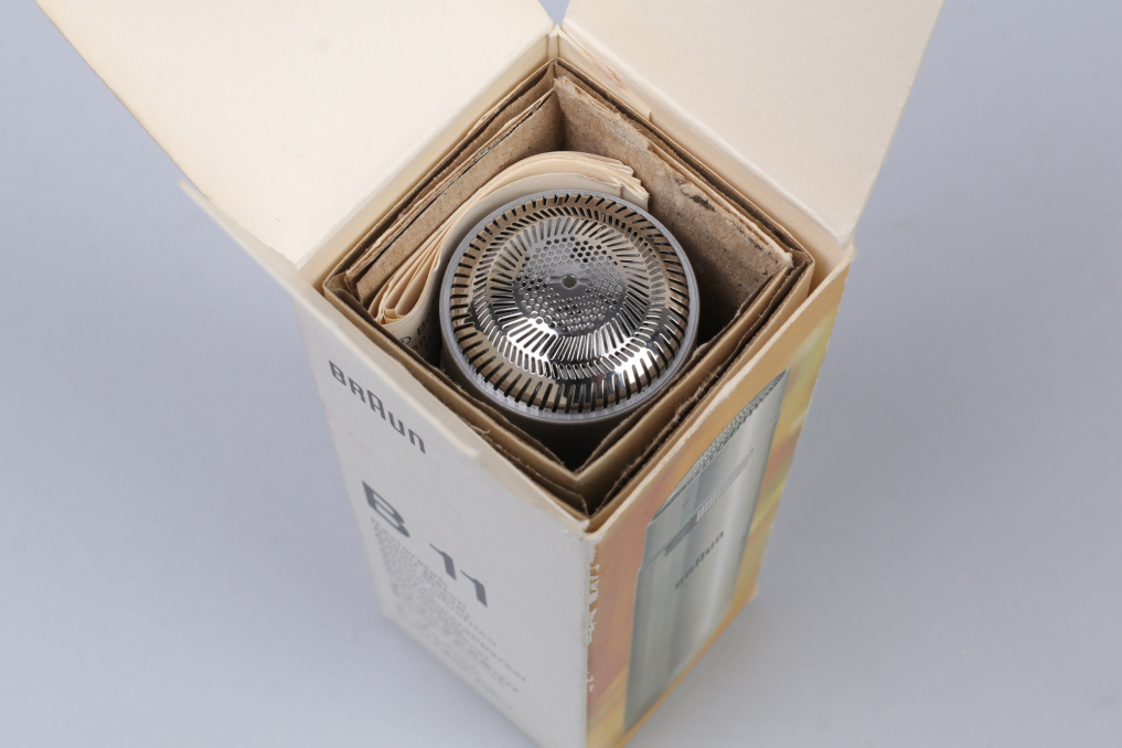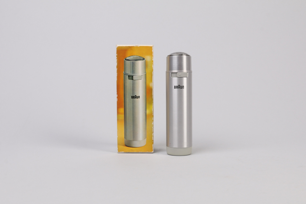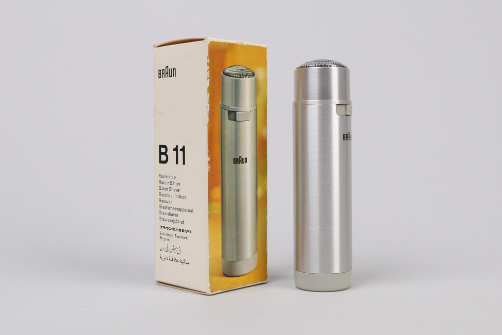 Original BRAUN Stab B11 Shaver! This sleekly shaver has been designed by Richard Fischer and comes with its original box. The cylindrical brushed aluminium body is battery operated (battery not included). Condition: Excellent, as new and fully operational. Original design icon made in Germany, collectors item for BRAUN friends!