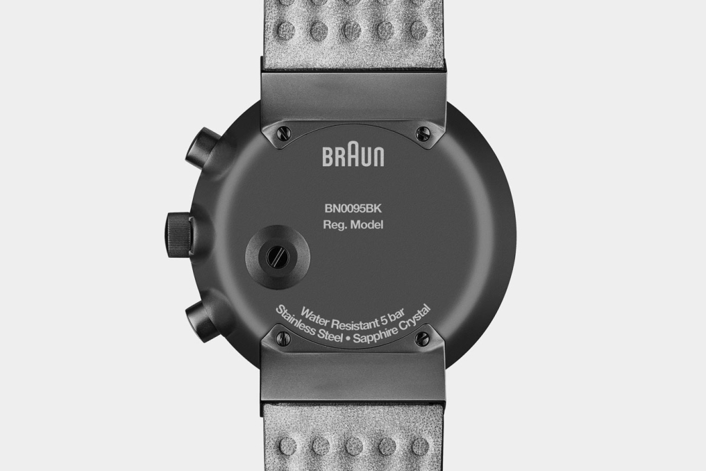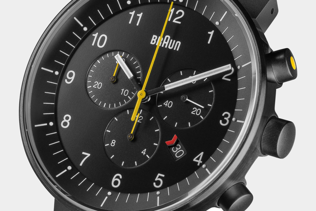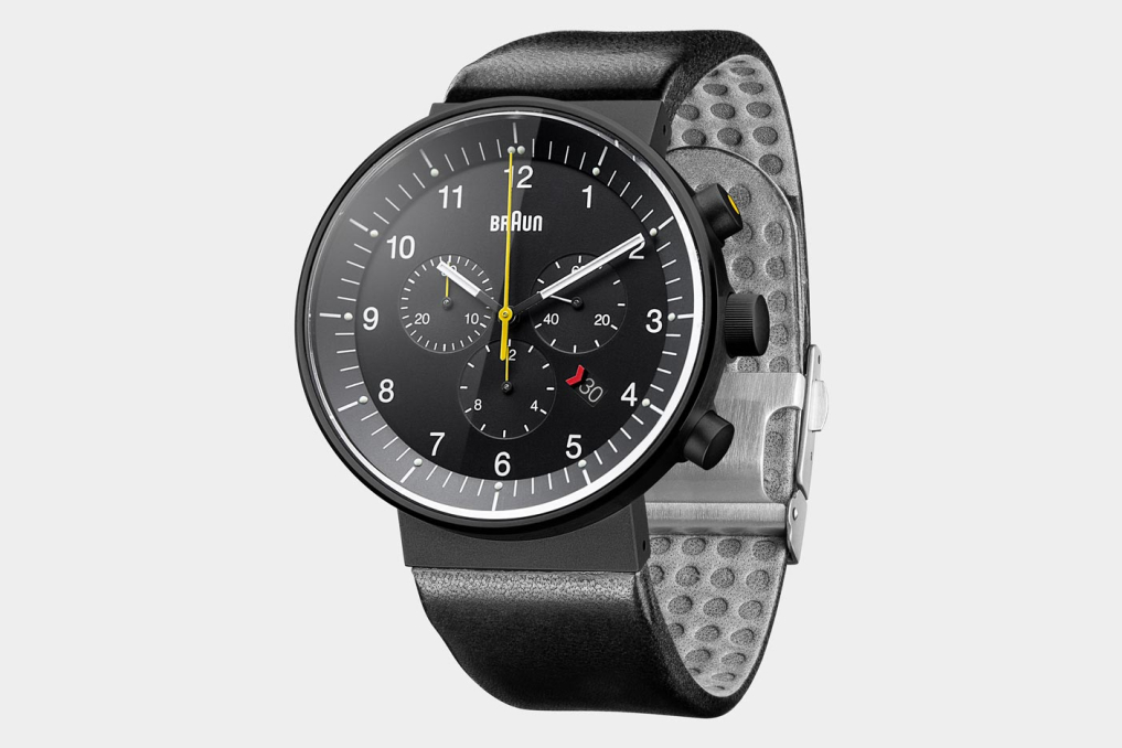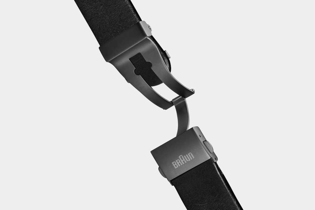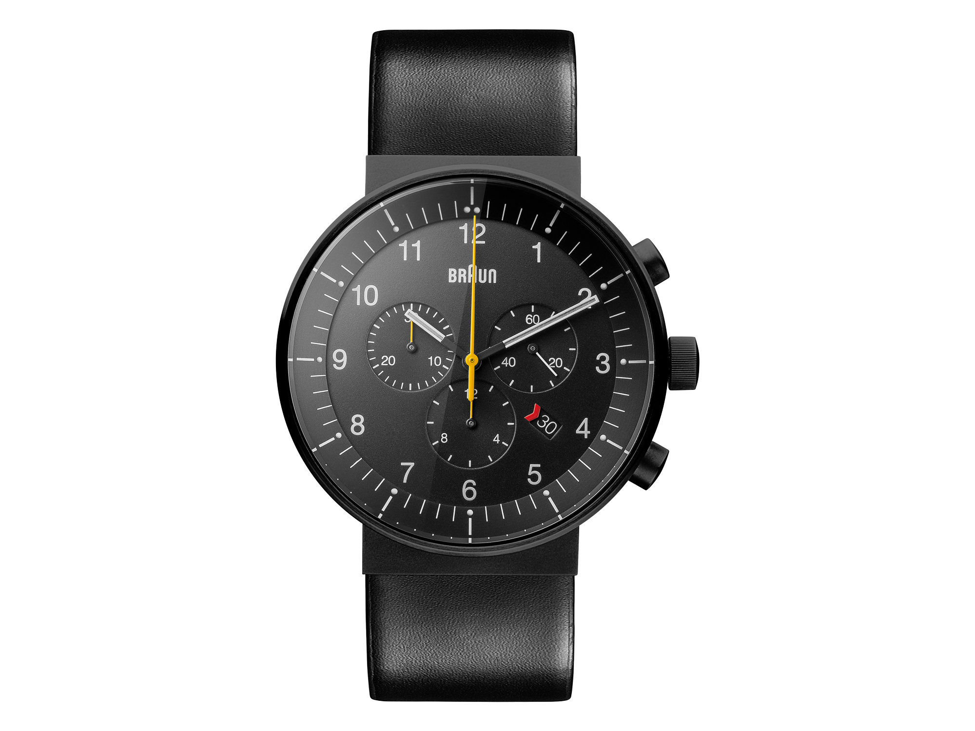 This Braun Prestige analogue watch measures 43mm diameter x D11 thick case. Available in stainless steel or black plated stainless steel. Both versions come with either stainless steel bracelet or rubber strap. The case of this Braun analogue watch is carved of one single block of steel. This one-piece’ construction eliminates the need for a case-back and in turn removes the element of potential leakage. The Swiss movement is mounted into the case from the top before being covered and sealed by the sapphire crystal. This allowed the Braun designers to taper the bottom part of the watch more elegantly and attach the band lugs in such a way that would not be possible with conventional watch construction. Implementing new technical solutions for the benefit of functionality has always been an important part of the Braun design tradition. The result is not only striking in appearance but moreover the elimination of a case back gives the watch an added structural advantage as there is a better protection against water. 2 year warranty. Watch case material: Stainless steel, Housing colour: Black, Band material: Rubber. Case diameter: 4.3 cm, Case thickness: 1.1 cm