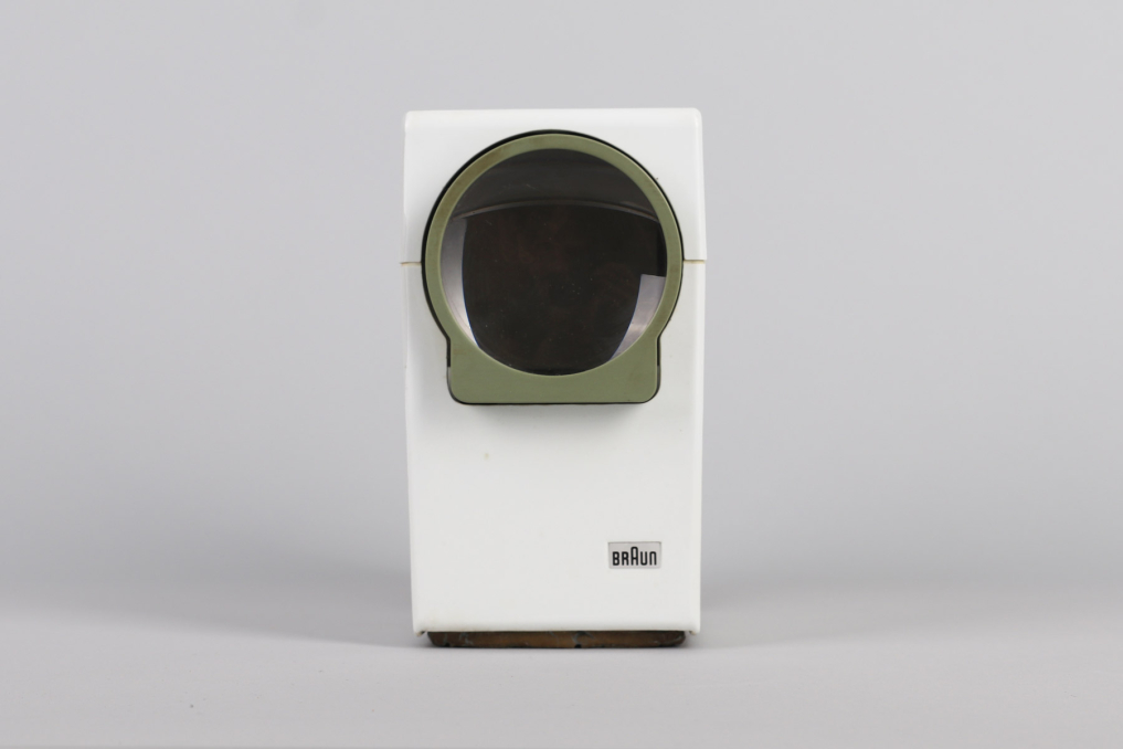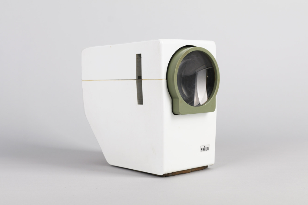 Designed by Dieter Rams at 30 for BRAUN in Kronberg, the Typ D5 Combiscope is a compact slide projector with a second, simple function: its pull-out lens focuses light to create room reflections, even illuminating higher areas thanks to its beveled housing. Matte light-gray melamine, an integrated cooling fan, and meticulous detailing — down to the custom Braun typeface — reflect the radical, reduced design philosophy of the era. Please note that this items is not functional and purely for collectors and for display purposes only. It comes with a cut cable (from the previous owner) and is missing the Dia slider. It is yet a beautiful product design collectible designed by Dieter Rams for your shelve.
