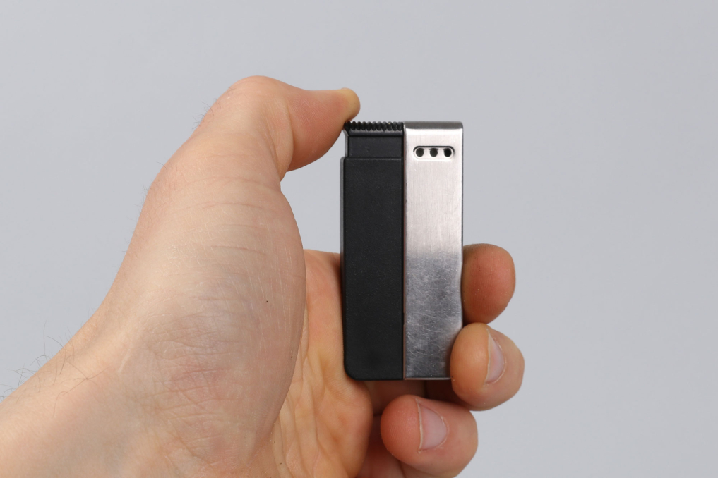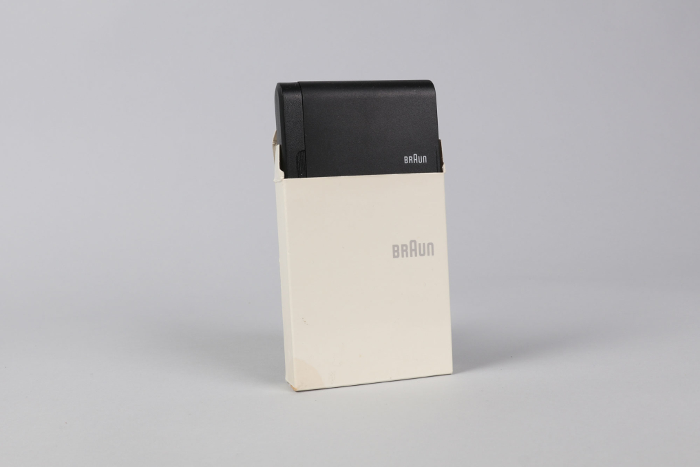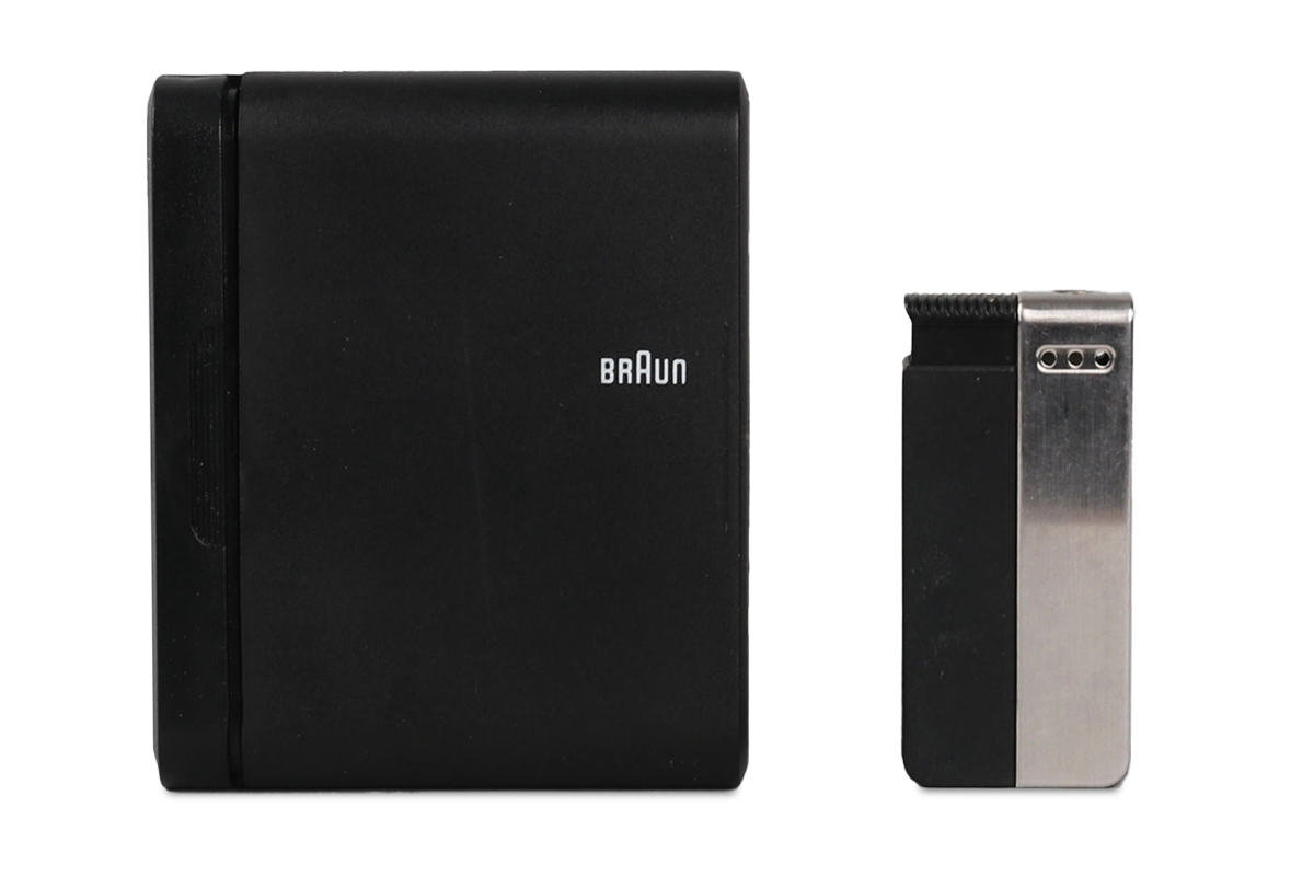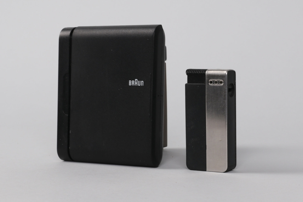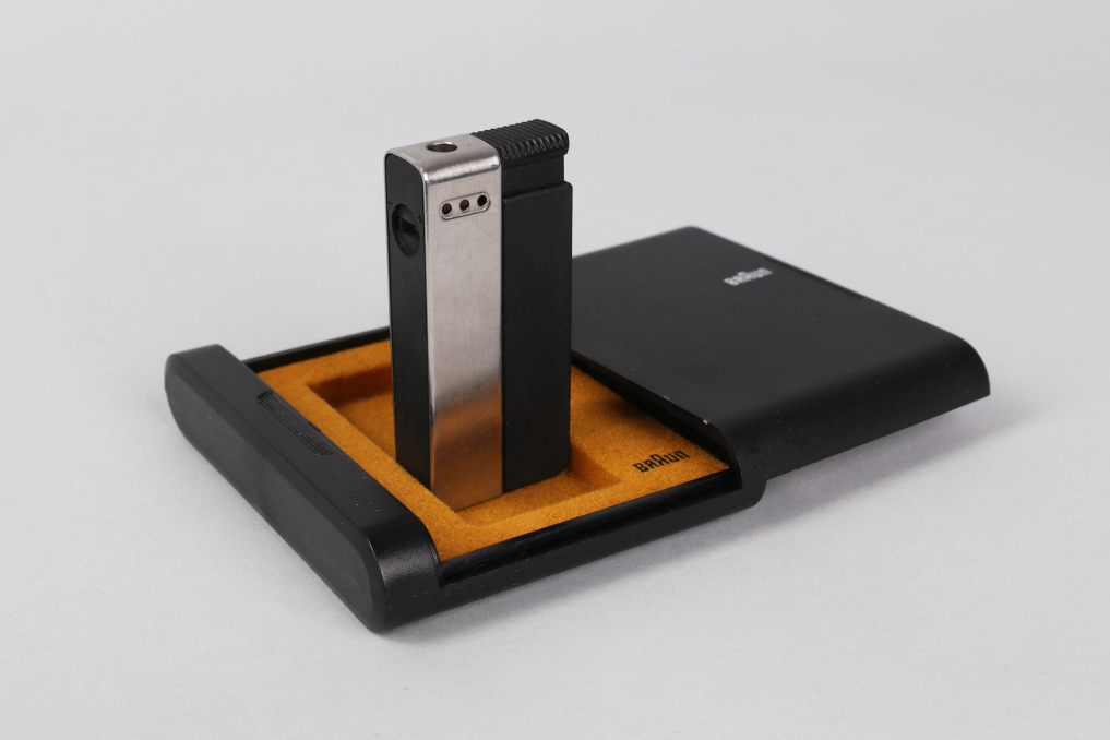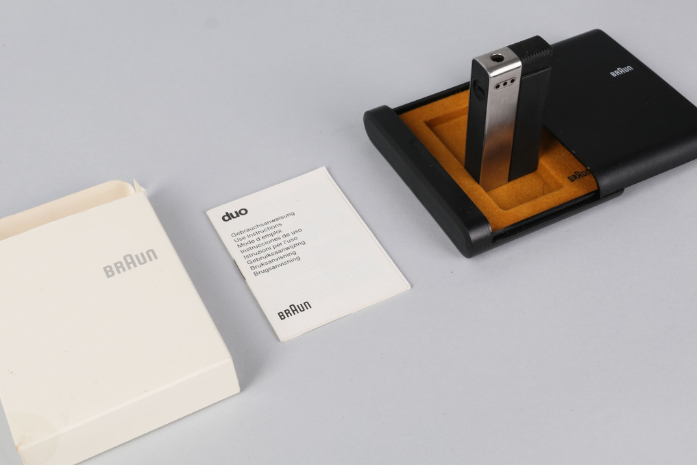 Original classic pocket lighter BRAUN DUO (Taschenfeuerzeug) made in Germany. Designed by Rido Busse (Busse design) in 1977 under supervision of Dieter Rams. Material: Black smooth casing and polished steel cover. The lighter comes with in its rare original packaging box, including user manual and outer paper packaging. Functionality not proven, sold as collectible. (size box: W 9 x L7,5 x H 2 cm).