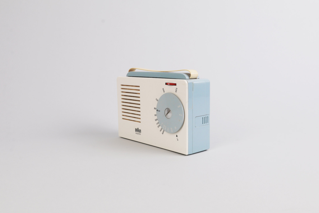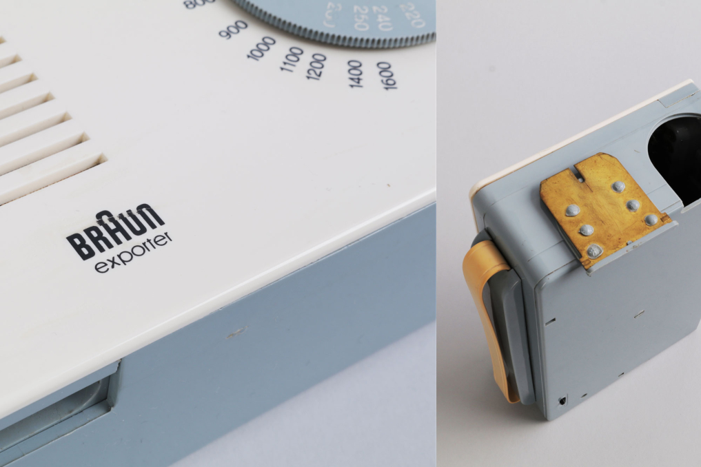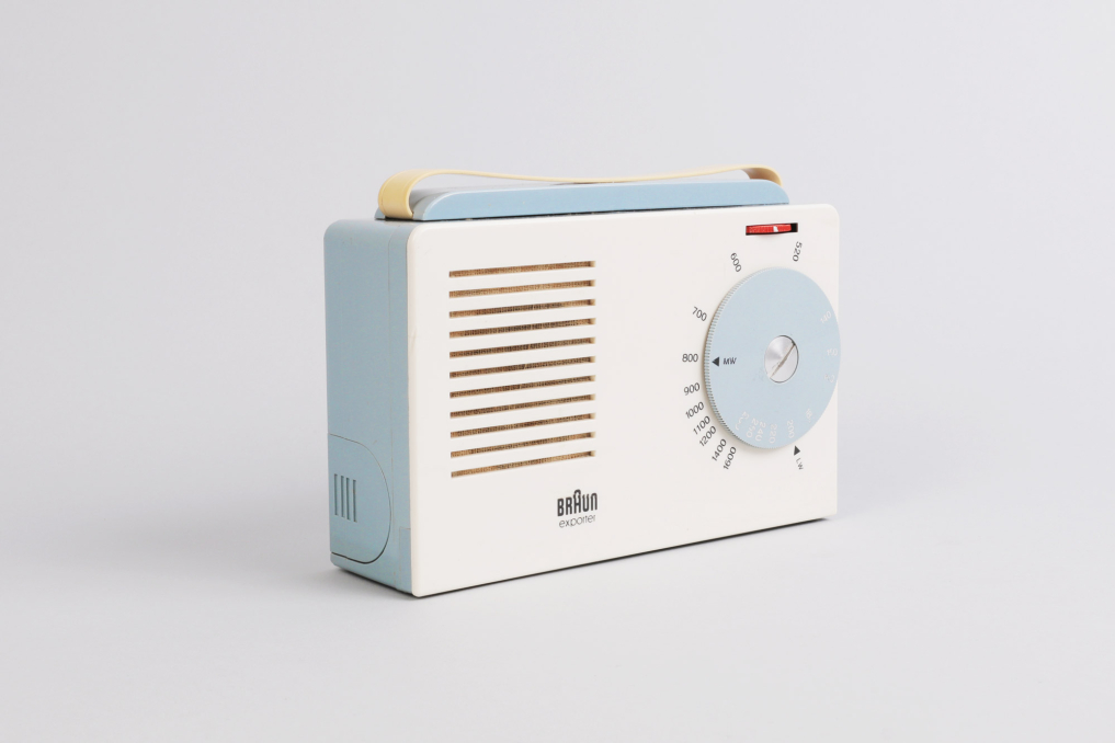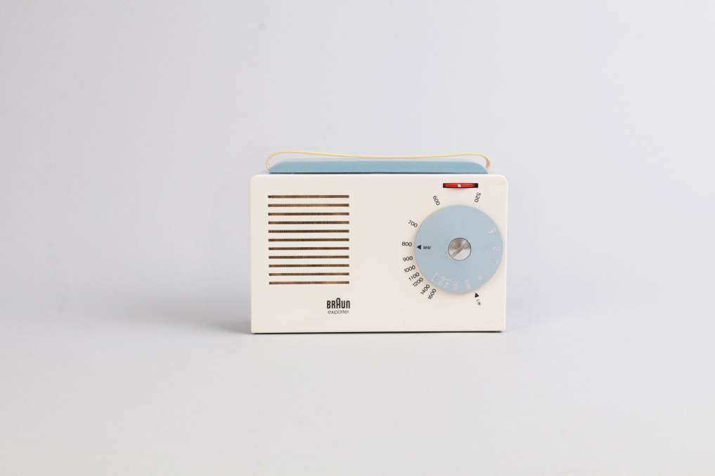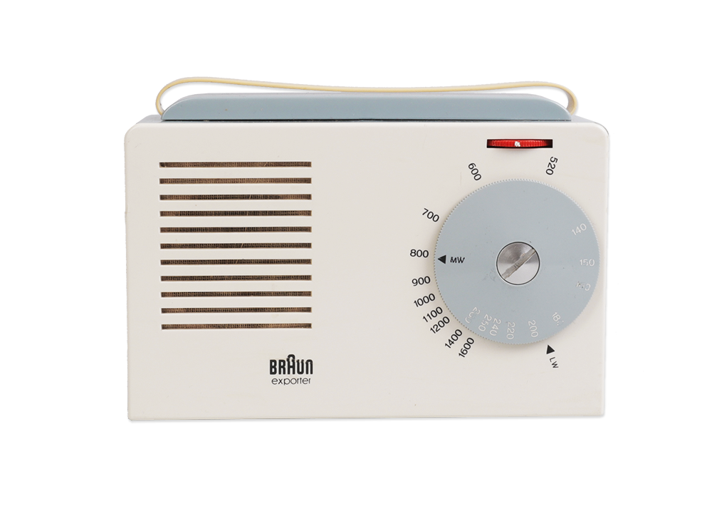 Very rare Braun Exporter 2 Radio / Kofferempfänger designed in 1956. Just a year after the SK 1, Braun was already trying to beat itself in the minimalism department. A partnership with the Ulm Academy of Design yielded their design for the portable exporter 2, which dispensed with the grid of dots and instead instituted a neat row of lines for the speaker grid. The tuning dial resembles what you'd see on another hi-tech item of the era, an SLR camera. Condition: Very good due to age. Rare! Function not proved. Docking station is not included.