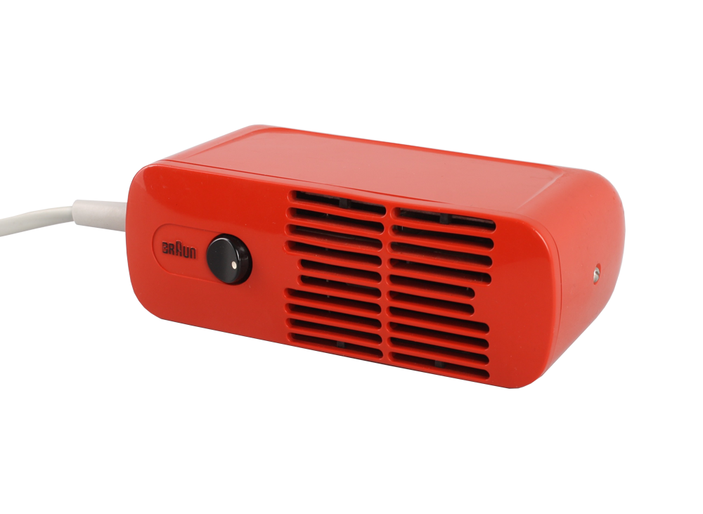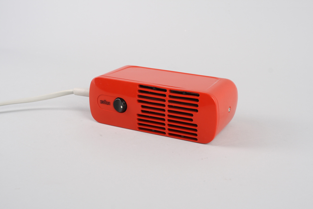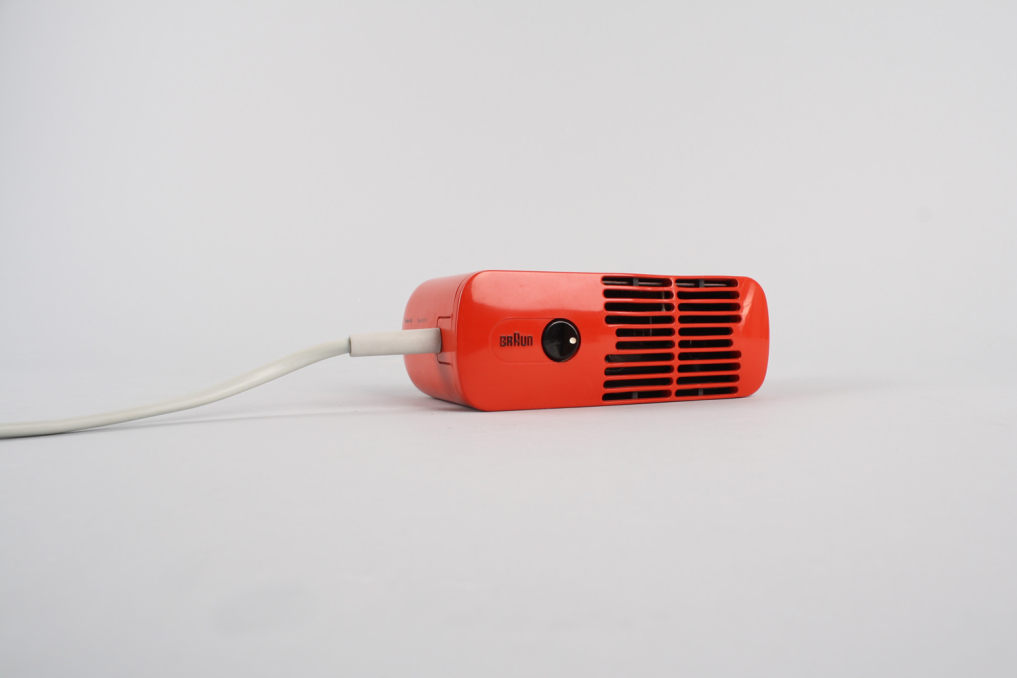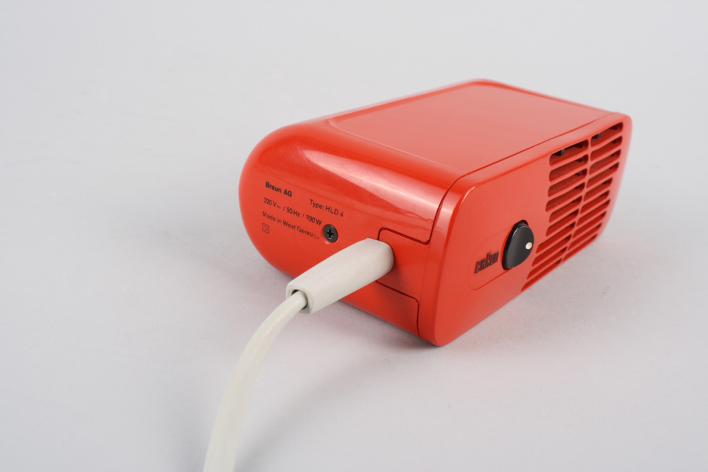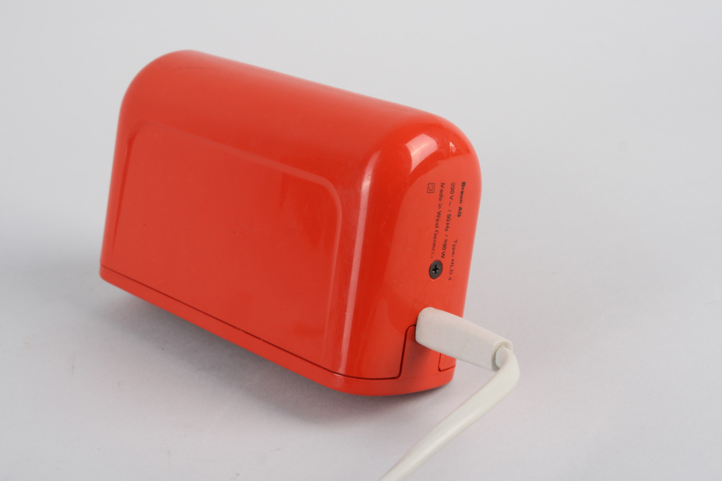 Beautiful design classic hair dryer HLD 4 in red color. Designed by legendary Dieter Rams in 1970s. The foundation for the design was an new reconstructed version of the fan based on the HLD2 fan by Reinhold Weiss in 1963. The housing is made of orange/red plastic a minimal black switch on the front. The white cable wire is original and comes with an EU plug (220V). A must-have for every Braun collector. Excellent original condition with only very few almost invisible signs of use. Functionality: operational. Mainly intended for decoration purposes.