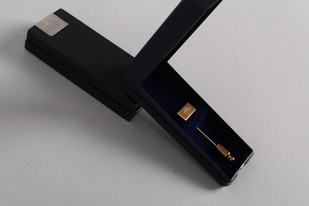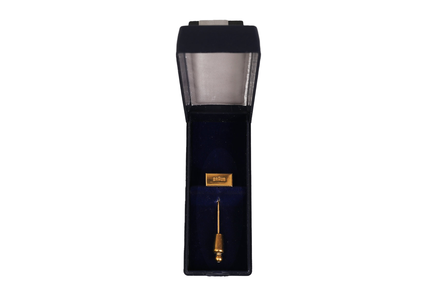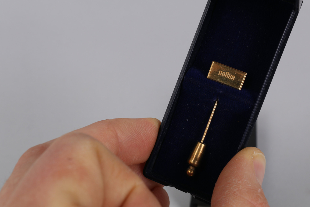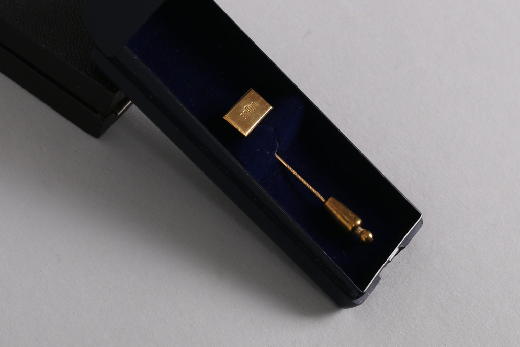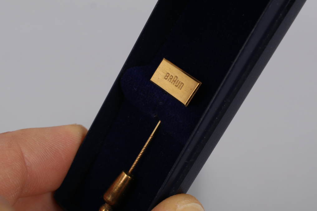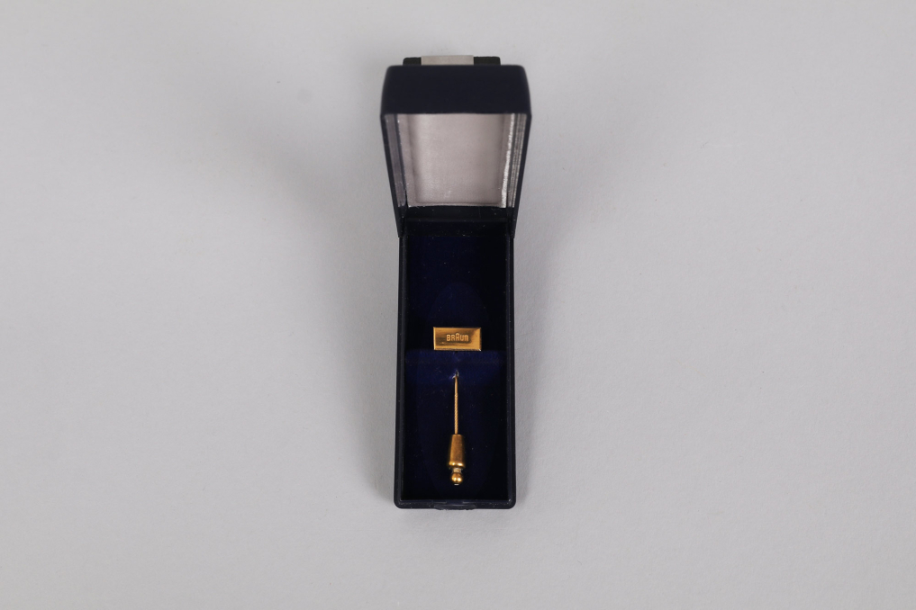 This exclusive honorary pin from Braun is made of 333 gold and was awarded for special achievements, such as a 25-year company anniversary. The total weight, including the clasp, is approximately 5 g, with the pin itself weighing around 2 g. Measuring about 5 cm in length (including the spring clip closure) and featuring a head size of 15 x 7 mm, it is an elegant and valuable collector's item. The pin comes in a luxurious blue velvet-lined case—an absolute must-have for Braun collectors!