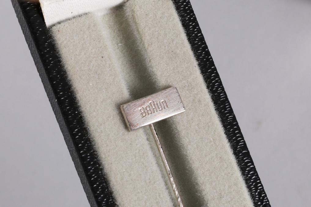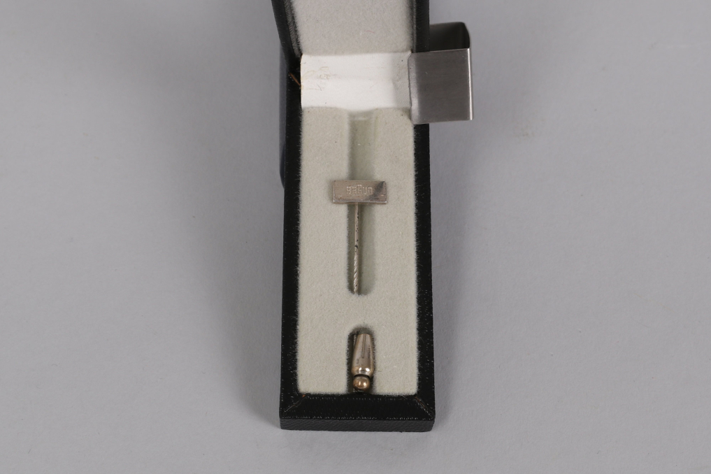 This honorary pin from Braun is crafted from high-quality 925 sterling silver, serving as a prestigious award for long-term employees or outstanding achievements. With dimensions similar to the gold version, it boasts a sleek, timeless elegance. The pin is presented in a matching case, making it a sought-after collector's piece for Braun enthusiasts.