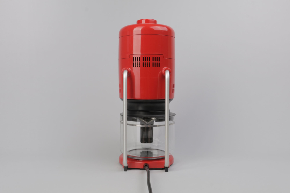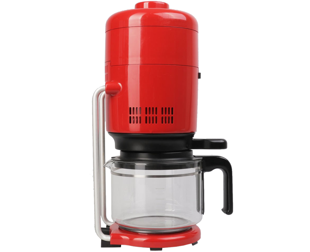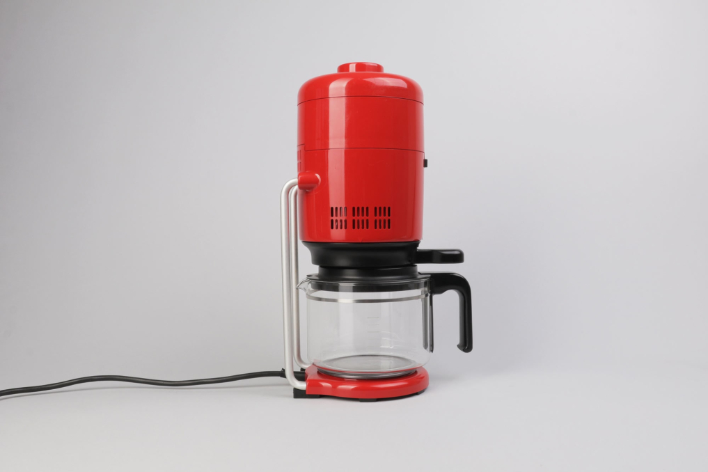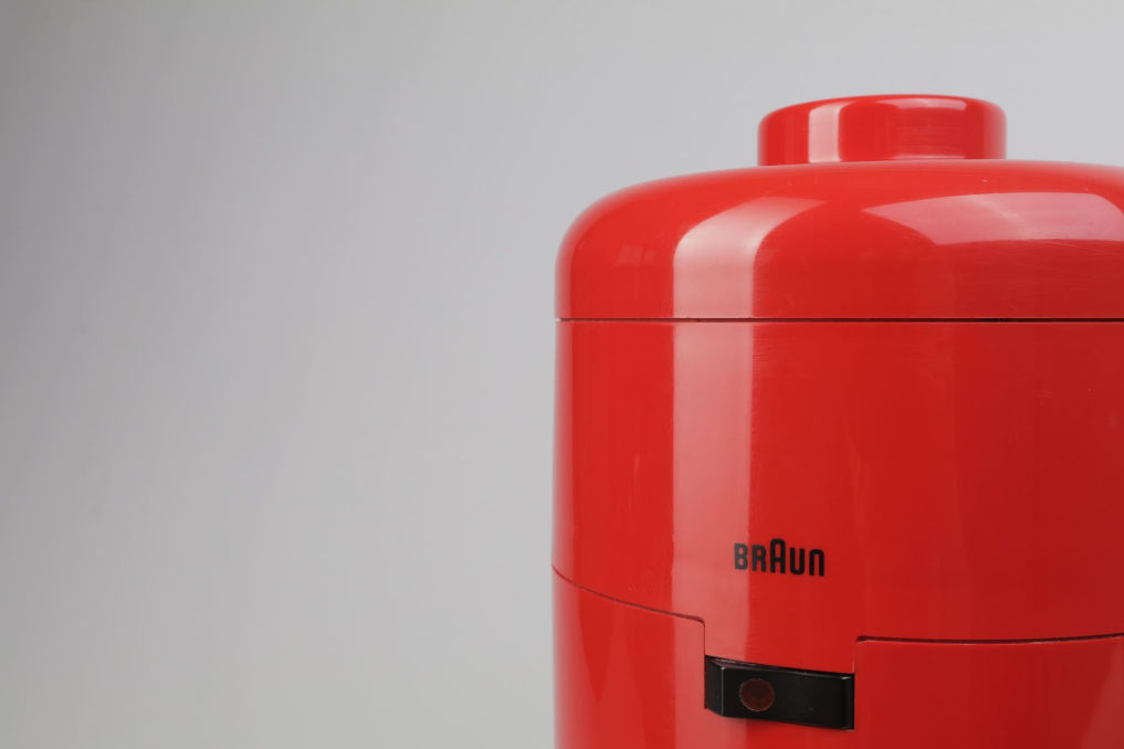 Red Braun Aromaster KF 20. Designed by Florian Seiffert and made in Germany in 1972. The iconic coffee maker is fully functional and operational. The original KF20 is such an icon of 20th-century industrial design that it is featured on the cover of the book Braun: Fifty Years of Design and Innovation. The coffee maker consists of an upper chamber with heating coil that boils water, covered by a smooth plastic cylindrical housing + black plastic band for paper filter below the water chamber. Removable glass carafe with black plastic handle that aligns with the filter handle and a base with a heating pad, connected to the top with two vertical chromed metal tubes. The KF 20 is a sensual timeless coffee maker. Condition: Excellent (polished and cleaned). Sold as decoration collectable for Braun collectors.