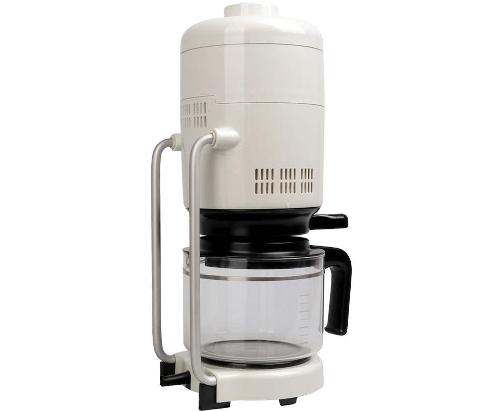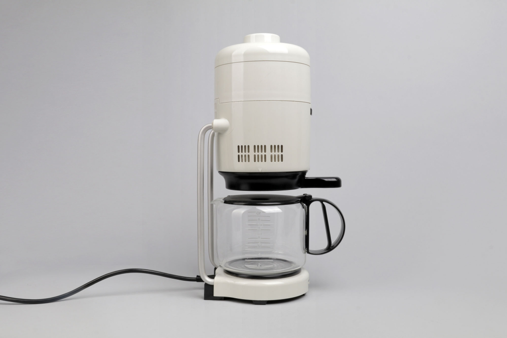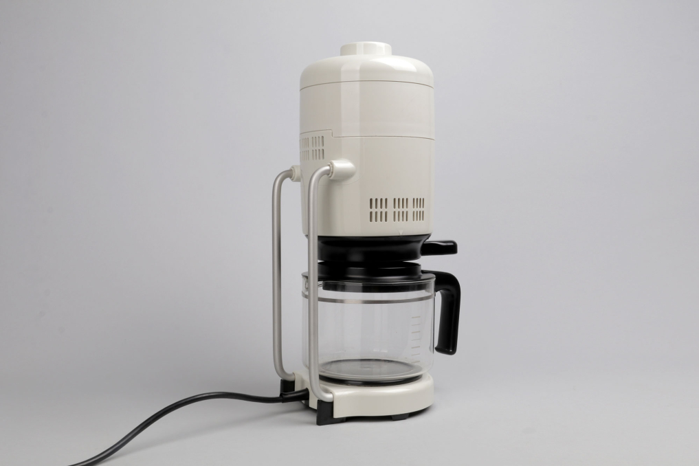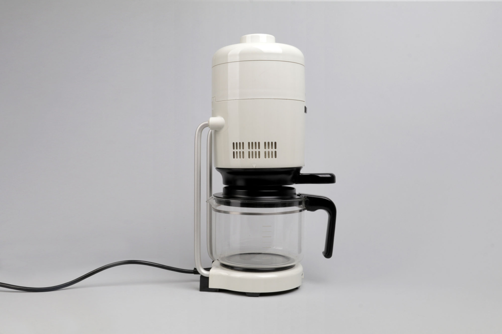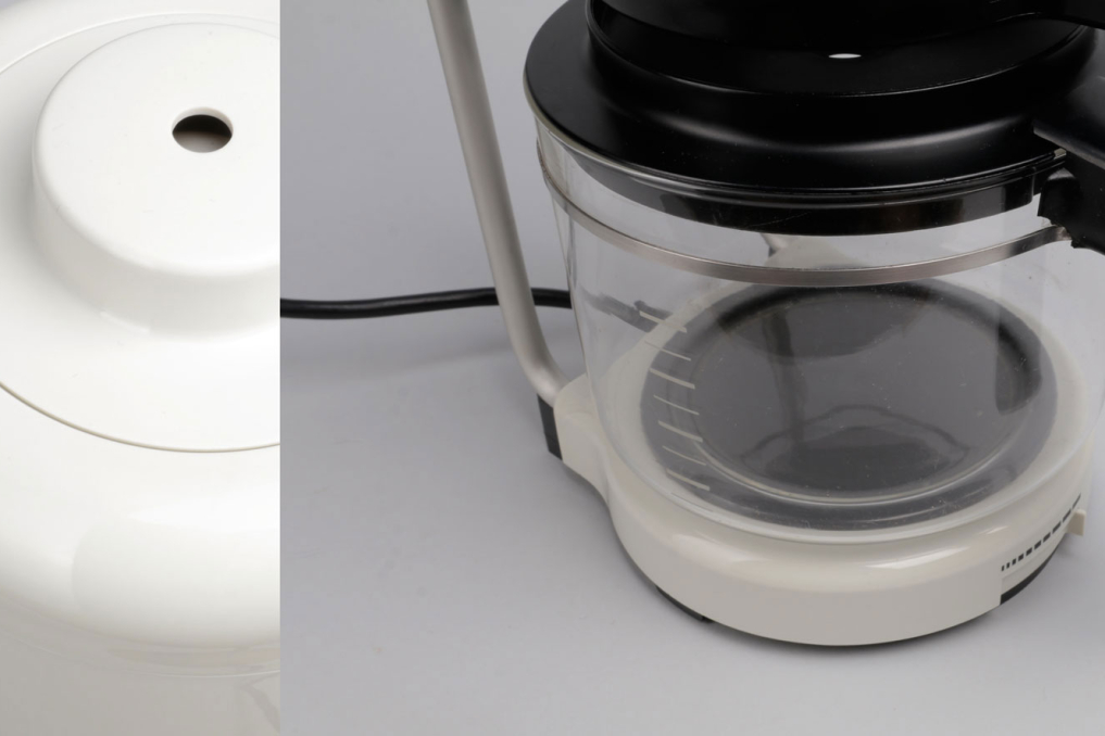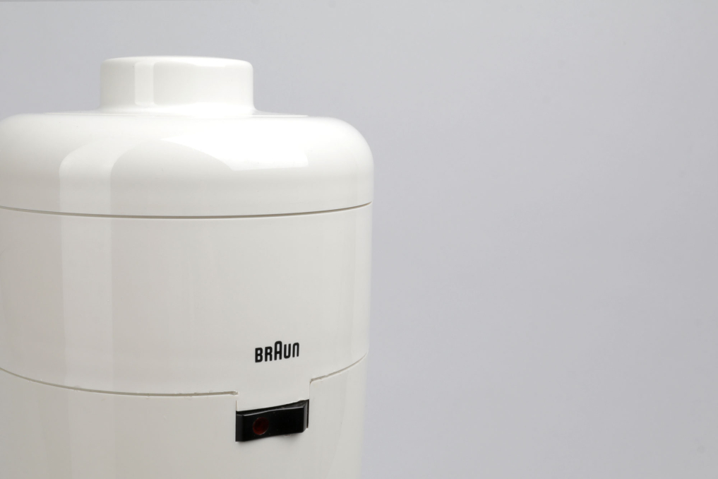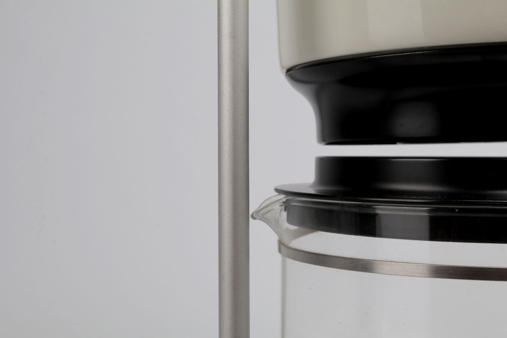 The Braun Aromaster KF 21 Type 4050 in white color has been designed by Florian Seiffert and made in Germany in 1972. The iconic coffee maker is fully functional and operational. The original KF 20 is an icon of 20th-century industrial design and has been featured on the cover of the book Braun: Fifty Years of Design and Innovation. The coffee maker consists of an upper chamber with heating coil that boils water, covered by a smooth plastic cylindrical housing + black plastic band for paper filter below the water chamber. Removable glass carafe with black plastic handle that aligns with the filter handle and a base with a heating pad, connected to the top with two vertical chromed metal tubes. The KF21 is one sensual timeless coffee maker. Great condition, cleaned & polished. Original glass carafe is missing the vertical bottom plastic holder. Second non-original glass carafe included (see last image). Sold as decoration collectable for Braun collectors.
