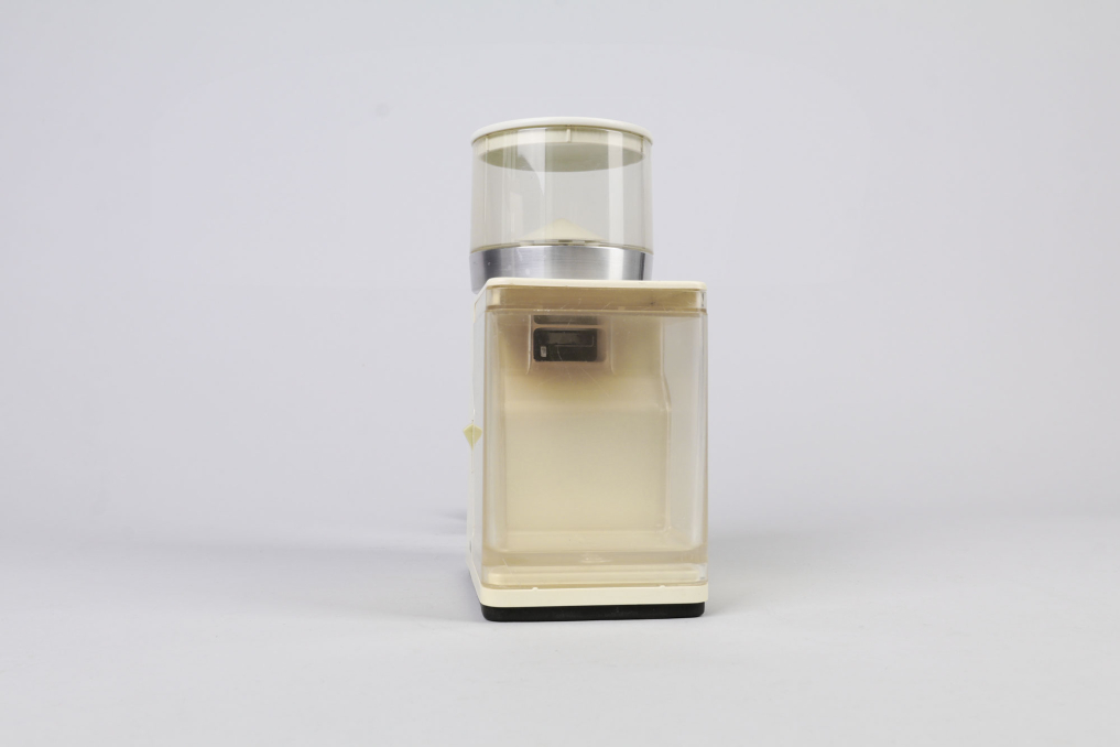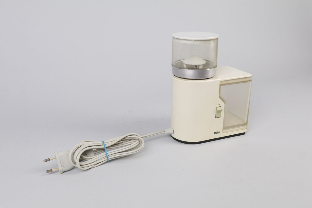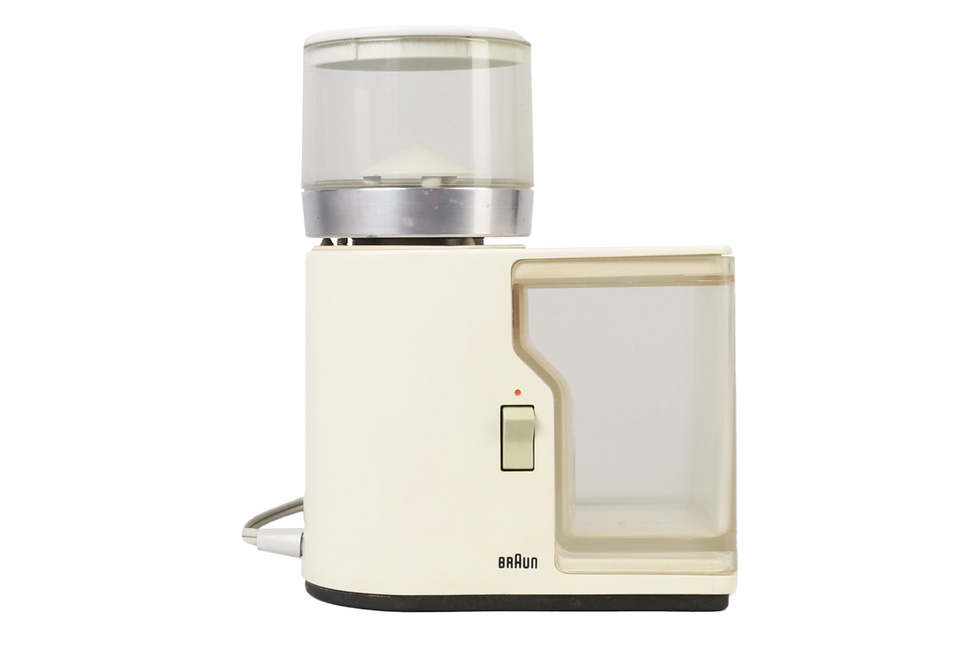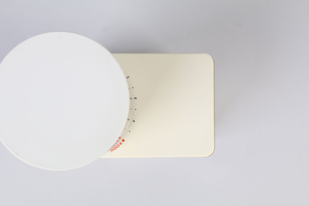 Iconic Braun Aromatic KMM 1 coffee grinder, designed by Reinhold Weiss between 1964 to 1975. White plastic housing with red power button, acrylic glass and anodized aluminum container. The grinder has an aroma-preserving grinder and separate containers for the unground and ground coffee. Nine grinder levels can be set by turning the upper container. The status of the switch button can be read without explanation with the red reference point on the housing. This may sound trivial today, but was not a matter of course at the time. The all-round black rubber foot gives the coffee grinder a defined end and lifts the device off the base. Condition: Good original working condition.