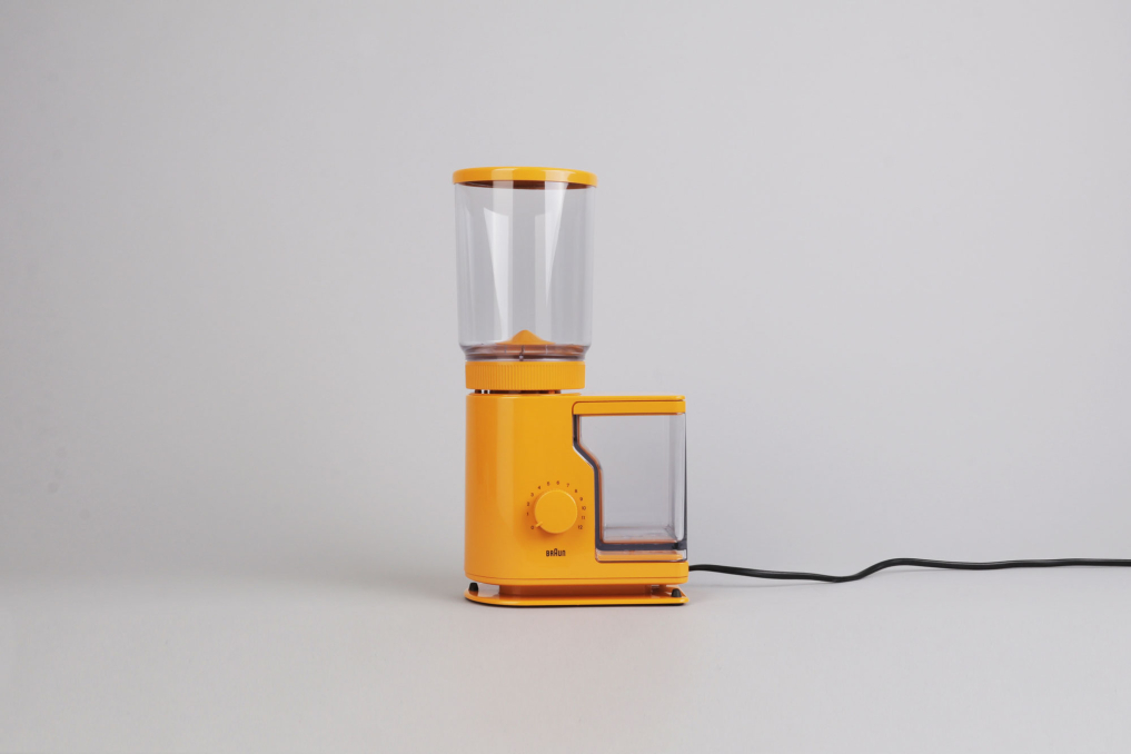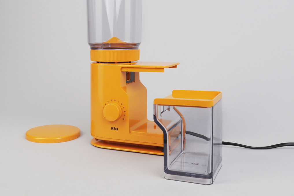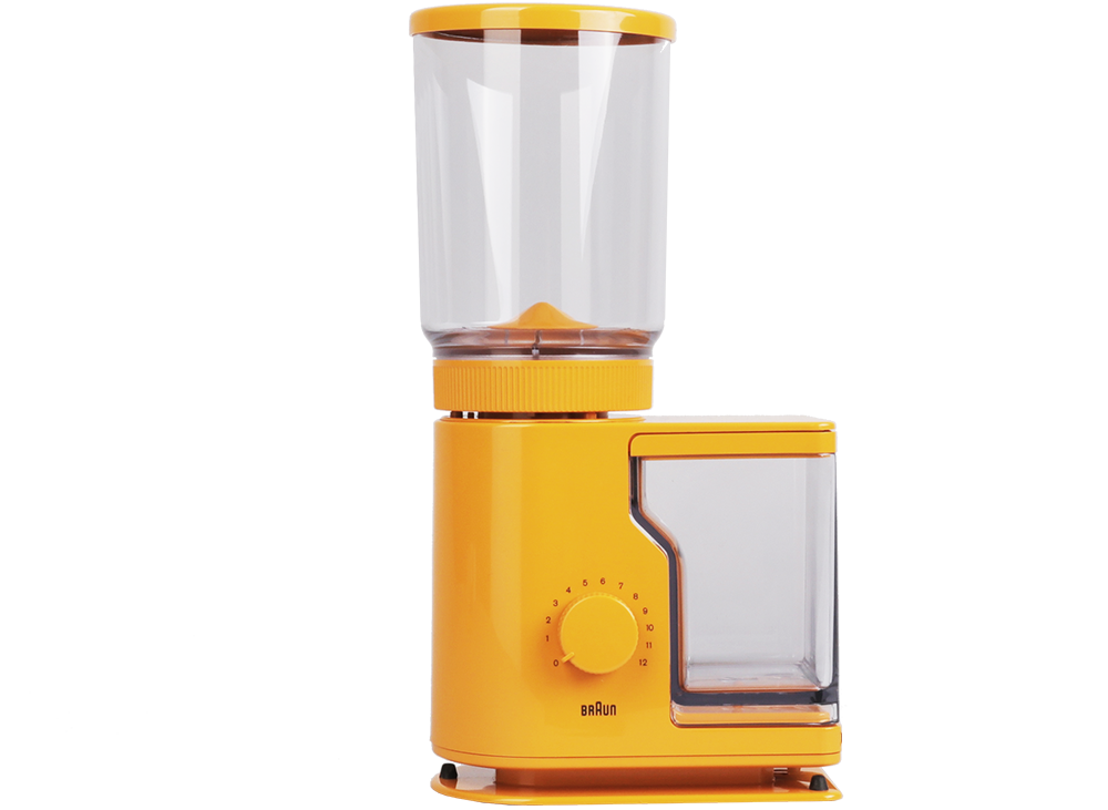 Original Braun Aromatic Coffee Grinder Grinder 4045 (model KMM20). This modernist designed coffee mill designed by Reinhold Weiss features sleek design, a dial to choose the amount of coffee to grind, and a rotating hopper that determines coarseness of the coffee grind. This vintage Braun coffee grinder is in great working condition.