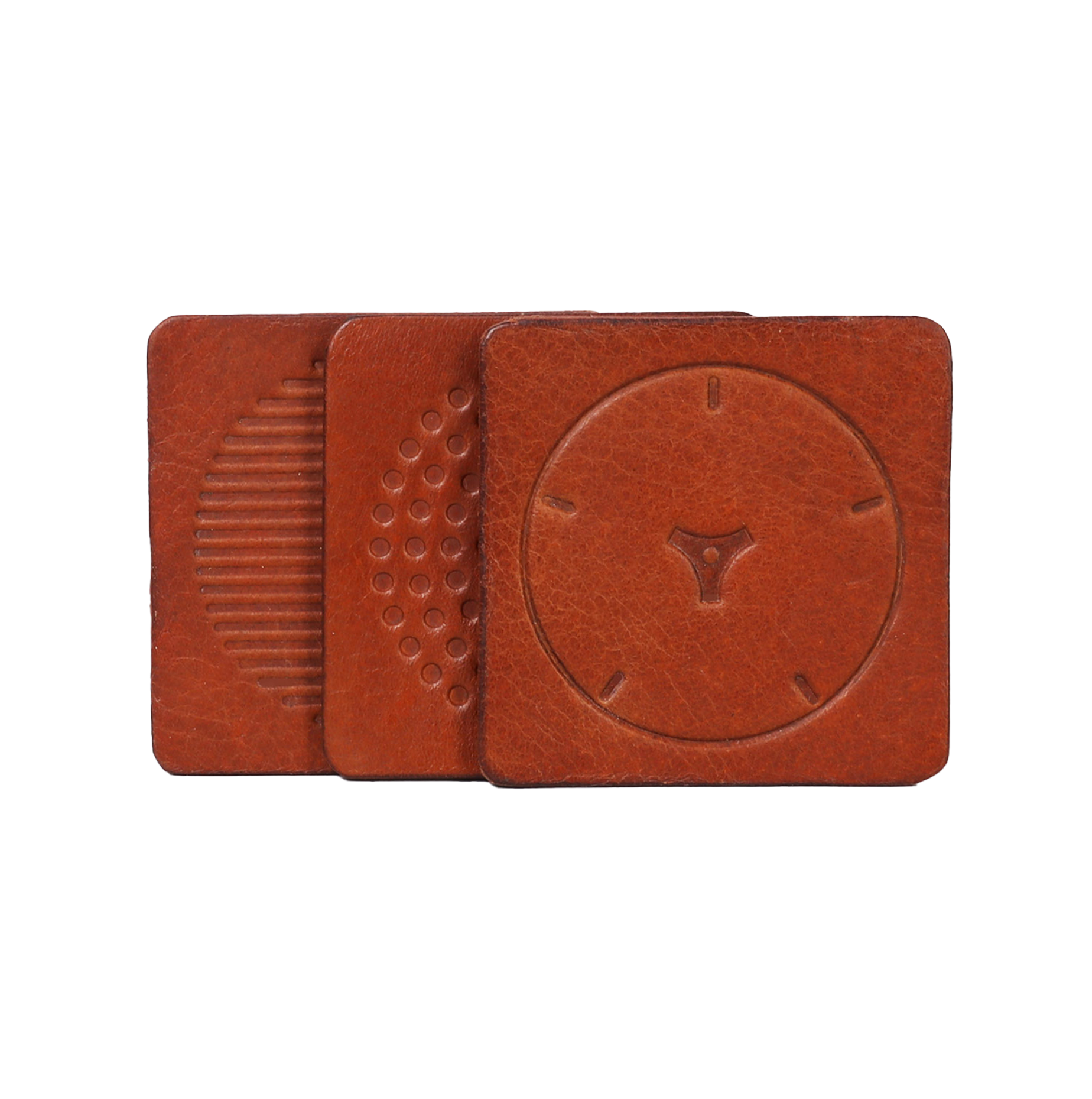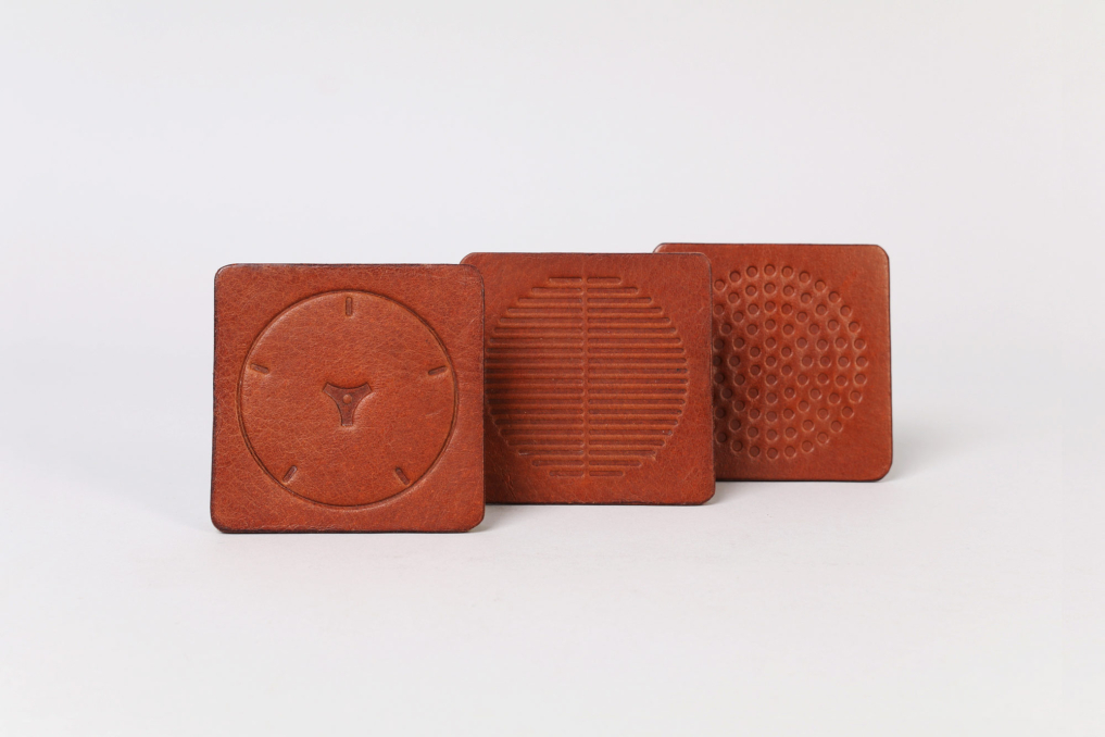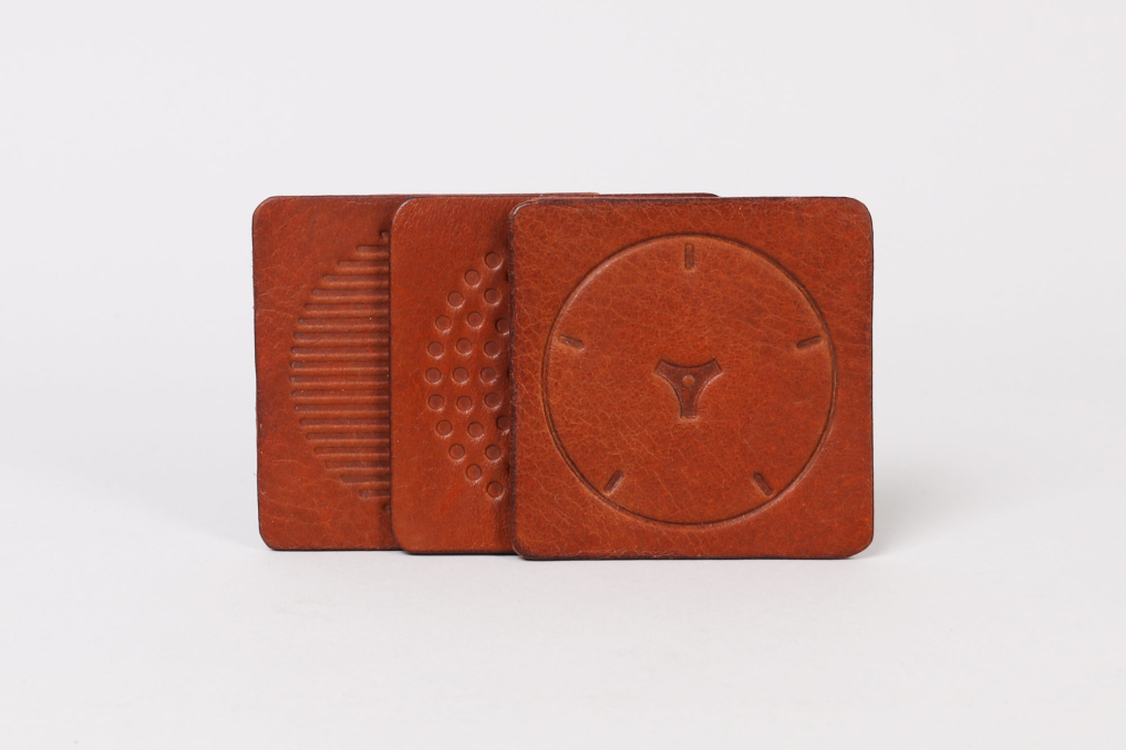Exclusive Only / Once original leather coaster inspired by the iconic patterns of Dieter Rams' Braun audio products such as the T4, RT 20 or SK 5. Each coaster is unique and handcrafted from thick full-grain leather and will age beautifully over time with use. A great addition to any Braun collection designed and created in house for enthusiasts only. Protect your table or desk in style. Exclusively available at Only / Once shop. → Price per set of 3 pieces (ie. If you wish to buy 6 leather coaster add 2 to cart).