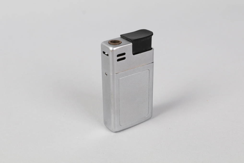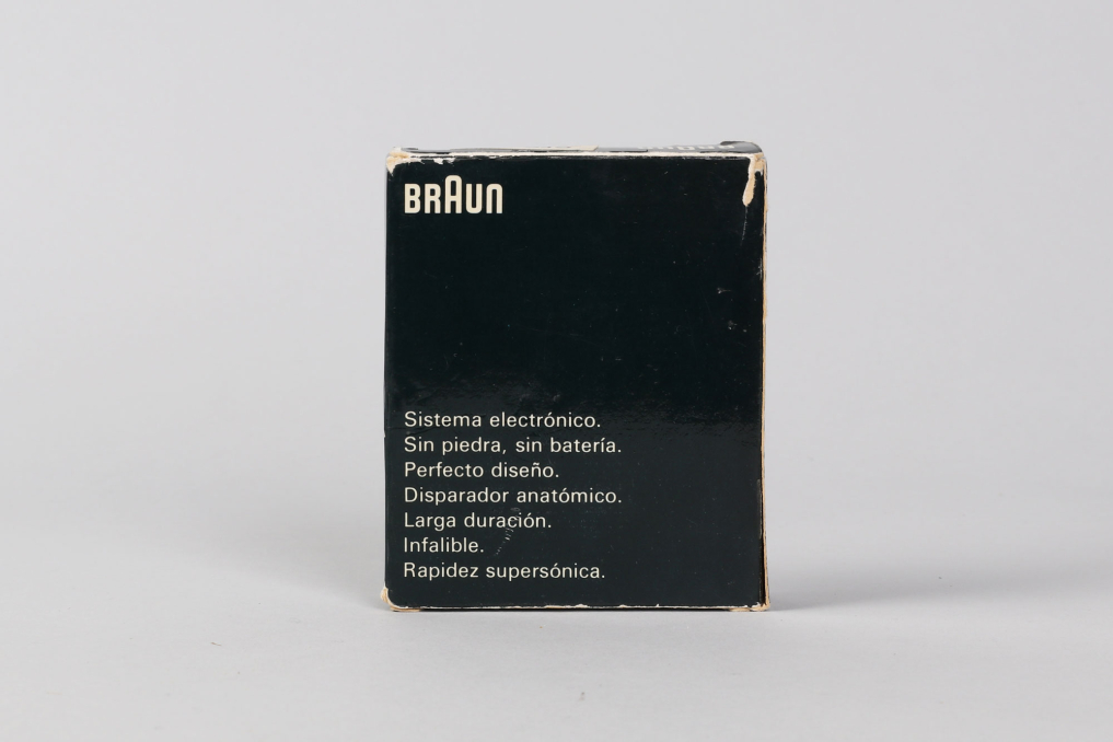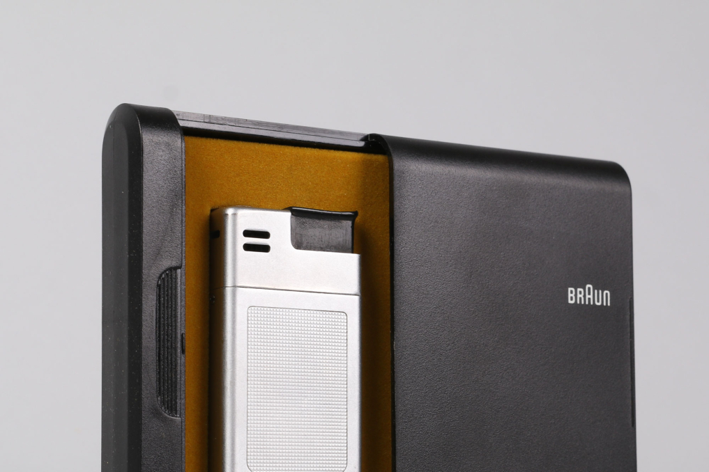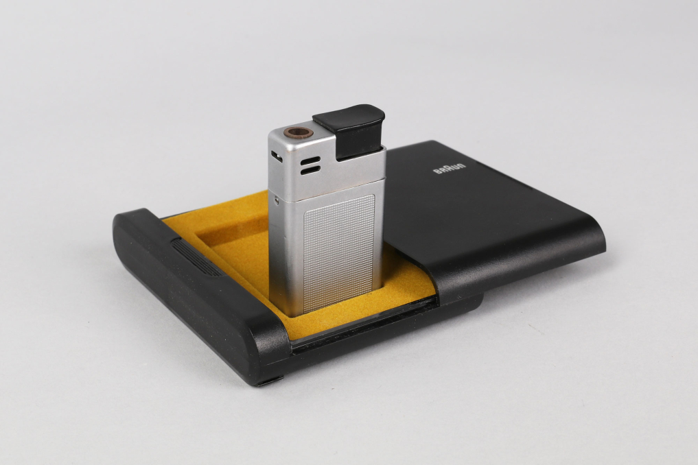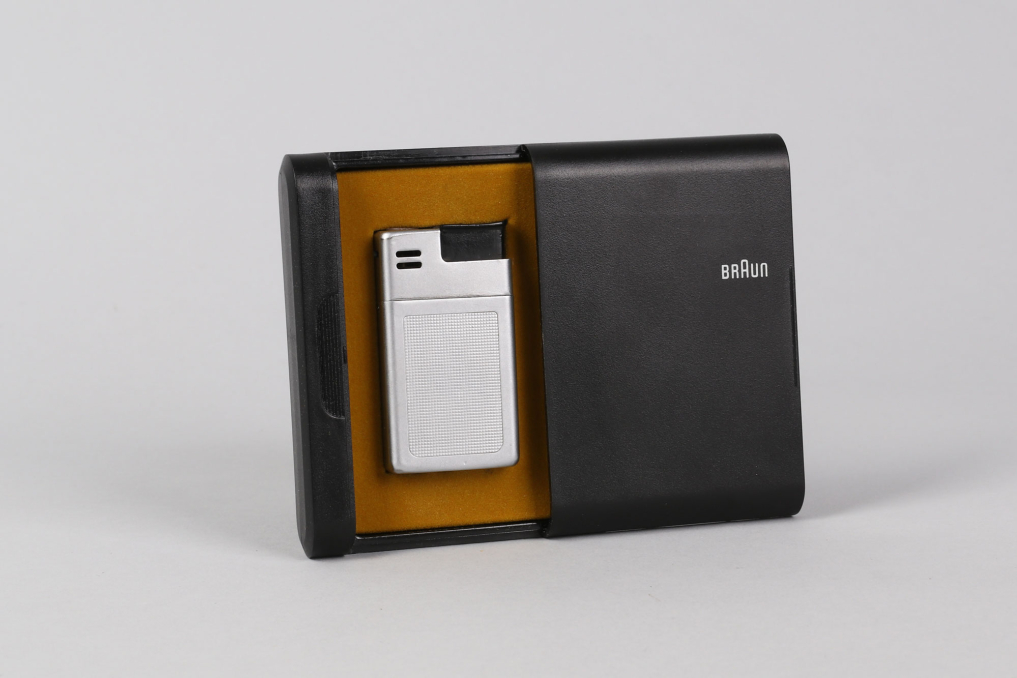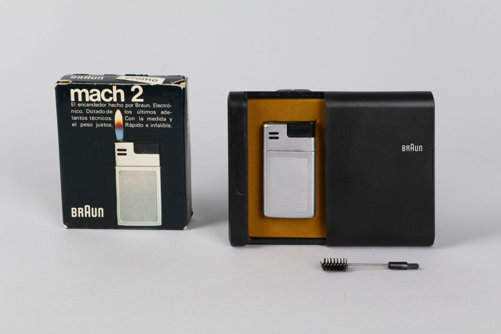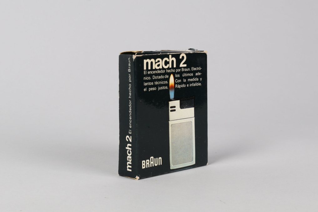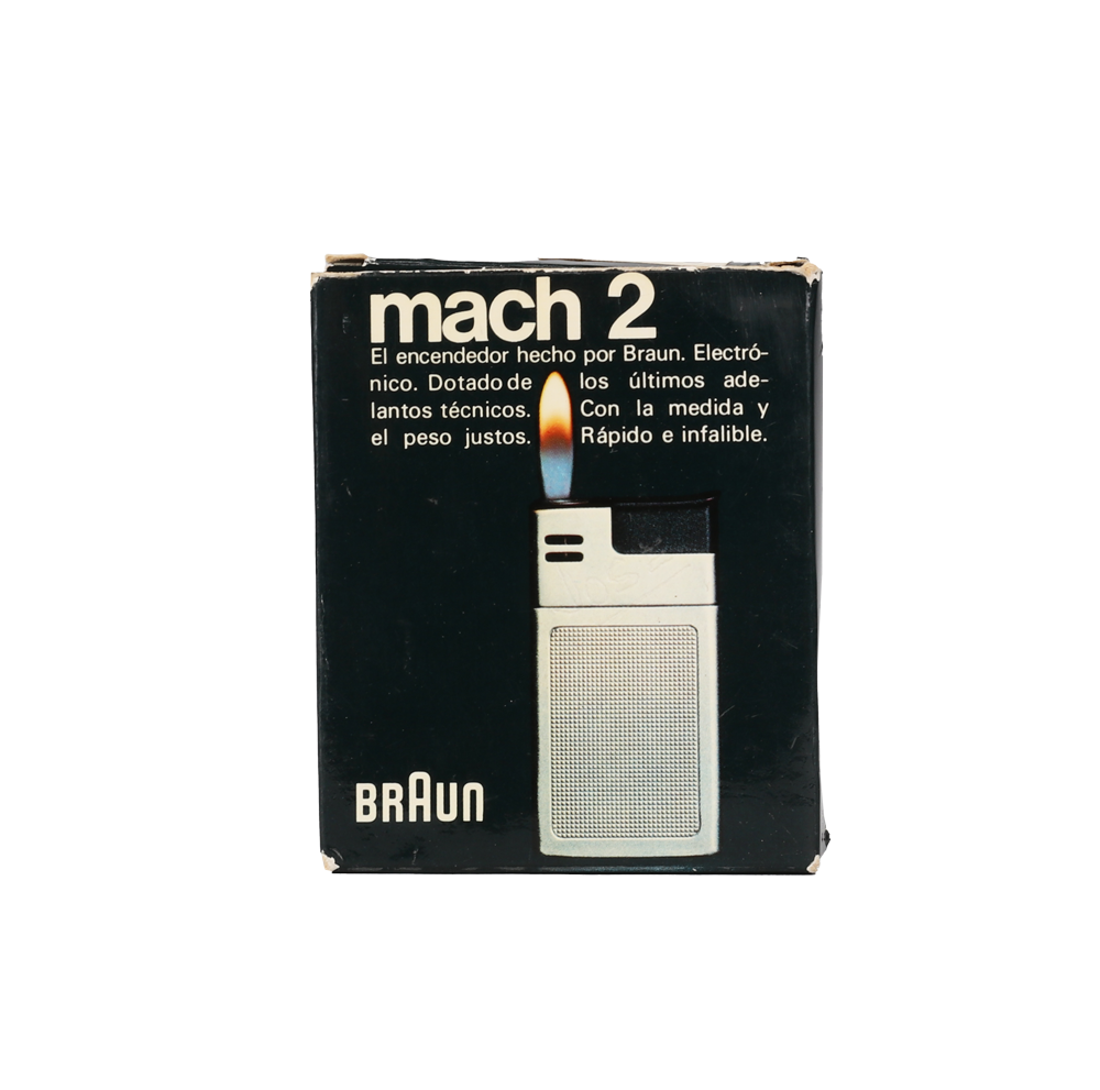 Original classic BRAUN Mach 2 pocket lighter (Taschenfeuerzeug) made in Germany. Designed by Dieter Rams & Florian Seiffert in 1971. Material: Chrome plated metal with plaid structure in beautiful preserved condition. The lighter comes with in its rare original packaging box, including user manual and outer paper packaging. Functionality not tested. (size box: W 9 x L7,5 x H 2 cm).
