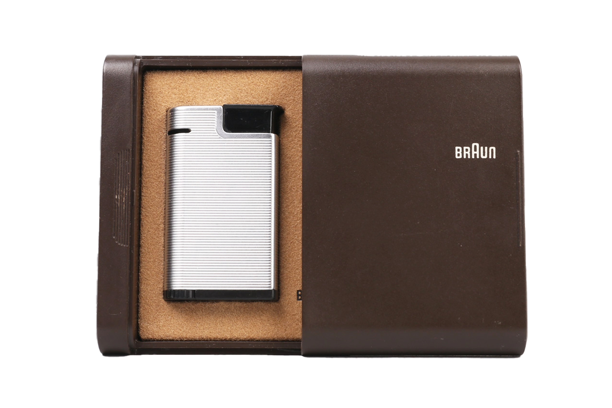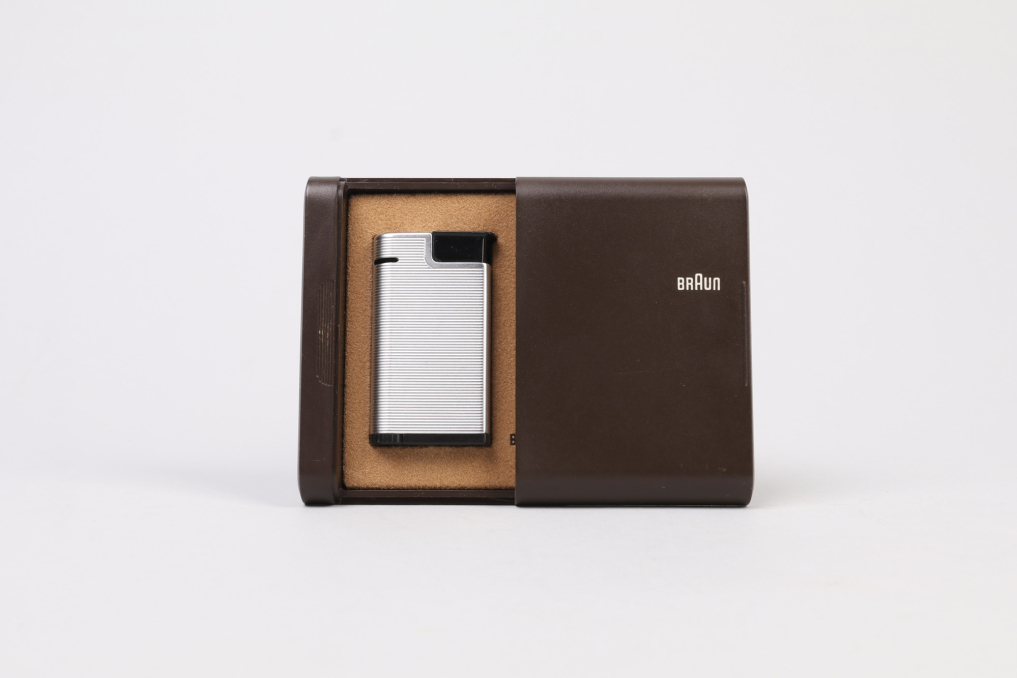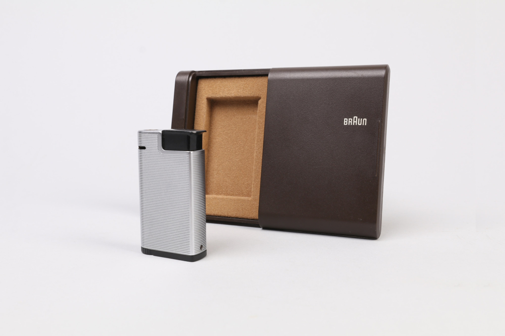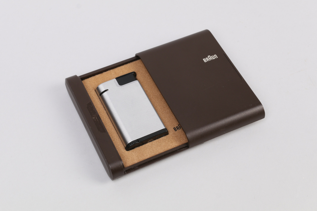 Original design classic pocket lighter Mach 2 by BRAUN in Frankfurt, Germany. Designed by legendary Dieter Rams / Seiffert in 1972. Material: silver brushed metal + plastic cover. Condition: Very good! Comes inside original plastic packaging box (size box: W 9 x L7,5 x H 2 cm).