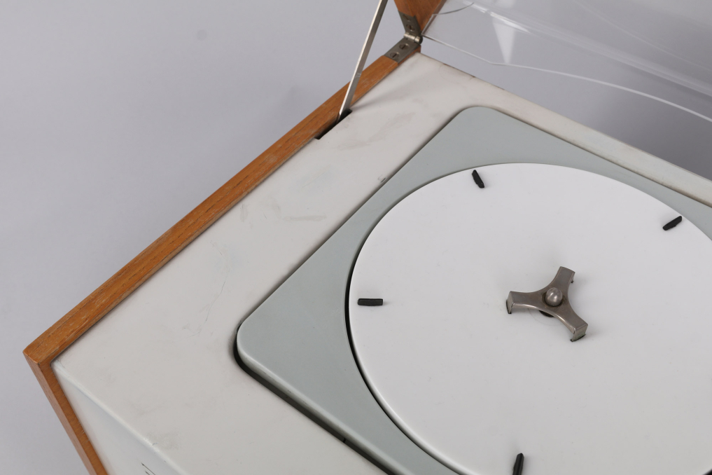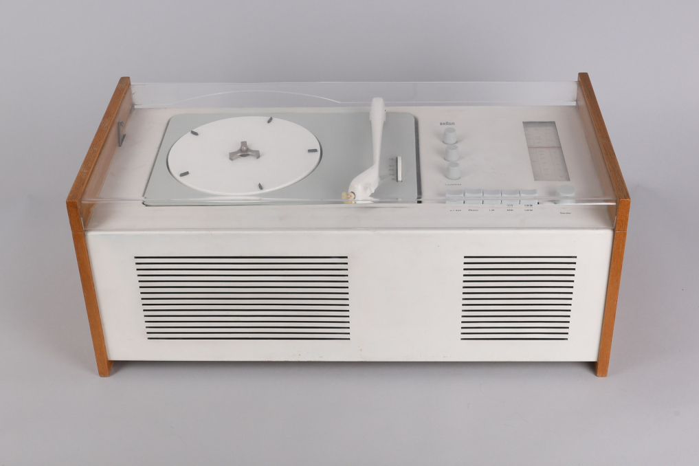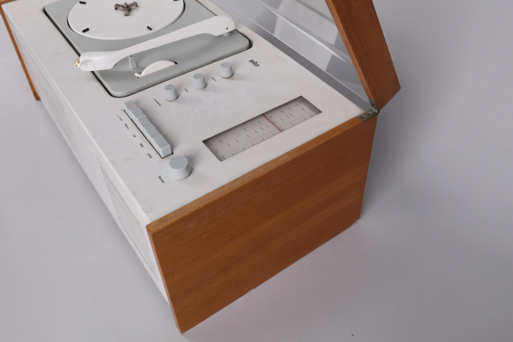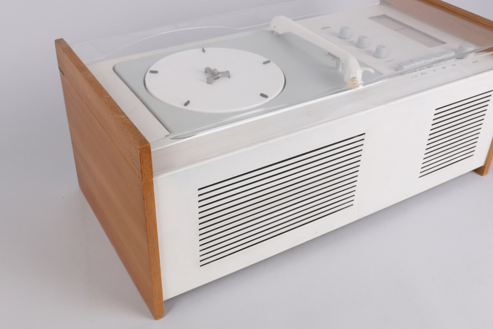 The legendary Braun SK 5 has been designed by Hans Gugelot + Dieter Rams, in 1958. It is equipped with a vinyl player, radio unit and a built-in Braun speaker box. The SK5 is an absolute design classic that you will find in MOMA and other museums. The radio part has been extended for longwave reception (LW). The PC3 SV turntable has been equipped with a stereo crystal pickup system and thus prepared for stereo playback (SV). The SK 5 remains a mono system. Condition: Good condition ; please refer to images: Small crack in the left back of the transparent cover and small missing piece of wood on the back bottom foot. The SK5 has been carefully cleaned; the paint has some small visible color corrections from previous owner as you can see on the images. Both, the speaker and transistor, as well as the vinyl player are functional. All parts original! Sold as a prestige design collectible, not intended for daily use!