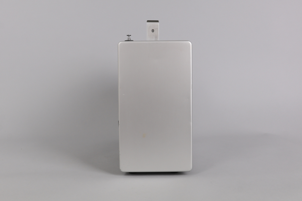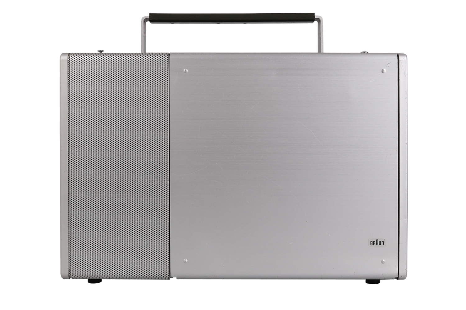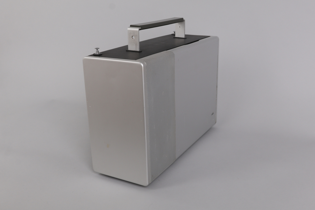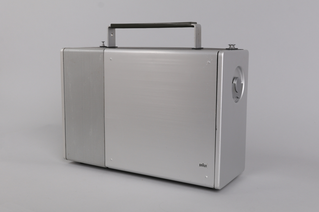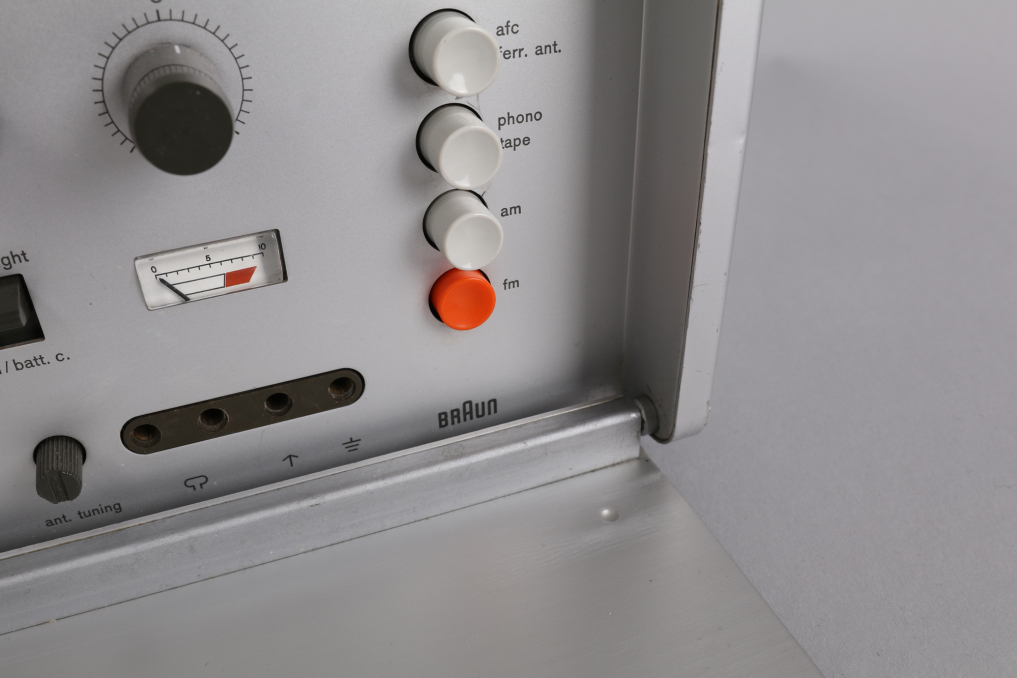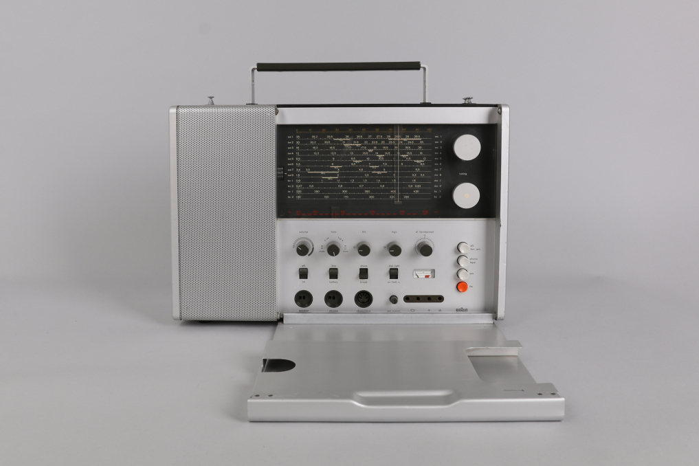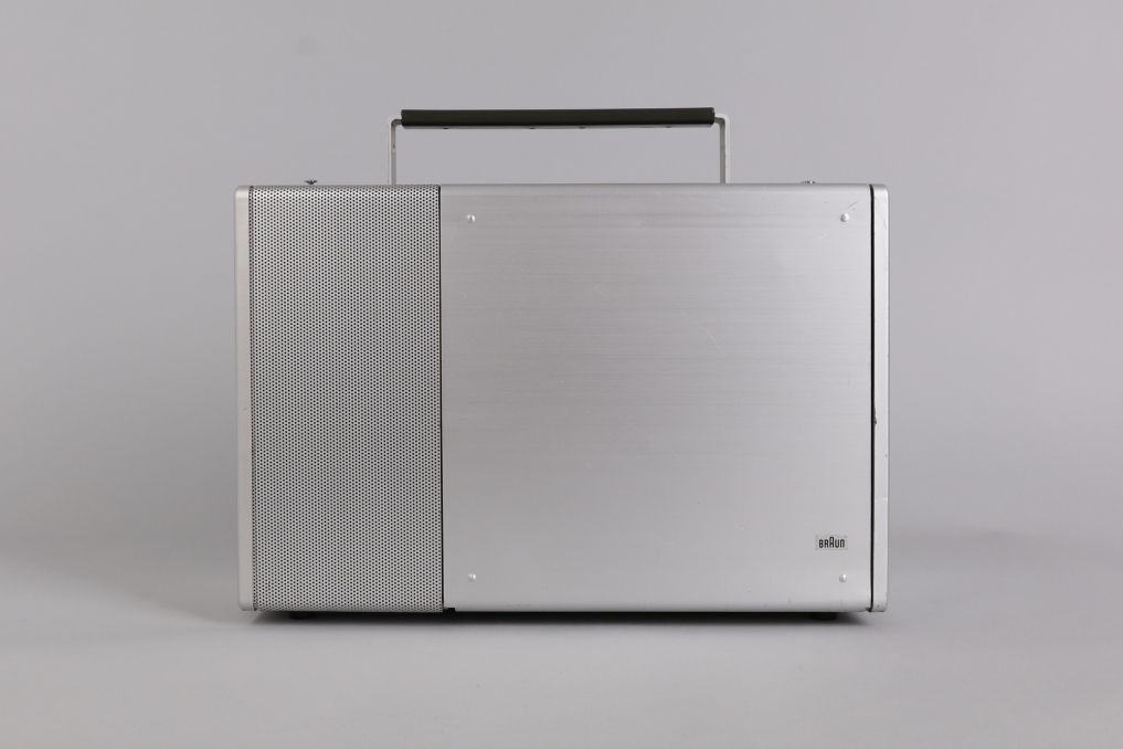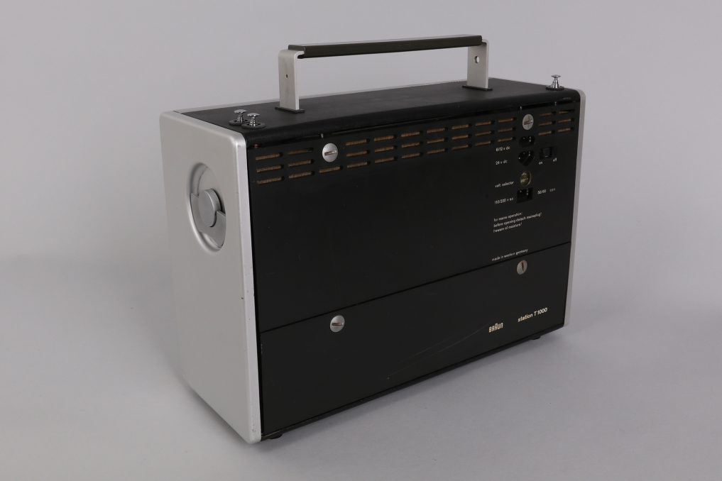 The Braun T 1000 world receiver, introduced in 1964 under the direction of Dieter Rams, remains one of the most iconic and technically ambitious radios of its time. With its clean aluminum housing, modular layout, and intuitive drum dial for switching between short, medium, and long wave bands, it reflects a design philosophy rooted in clarity and precision. Equipped with 12 overlapping AM frequency bands, including 8 shortwave, and advanced features such as manual gain control, BFO, and selectable bandwidth, the T 1000 continues to impress even by today’s standards. This example is fully functional and in very good condition, with minor wear visible on the brushed aluminum front. Operates on 6 batteries (not included); original manual not included. A benchmark of mid-century German engineering—form, function, and fidelity in perfect alignment.