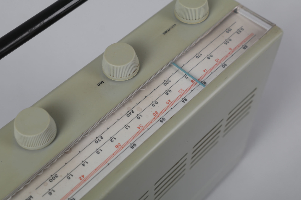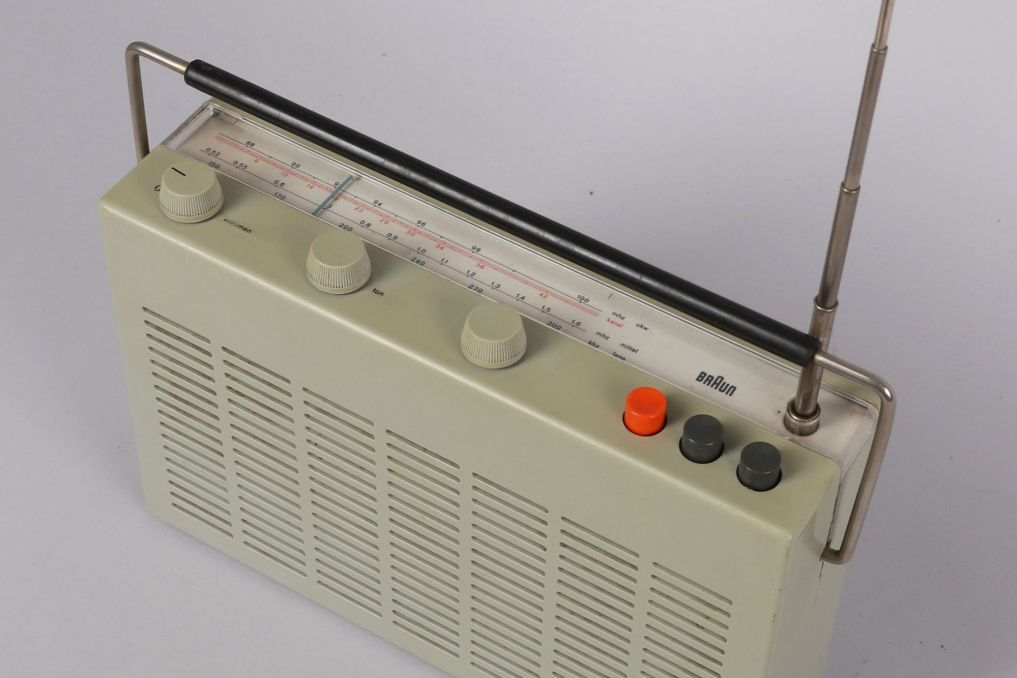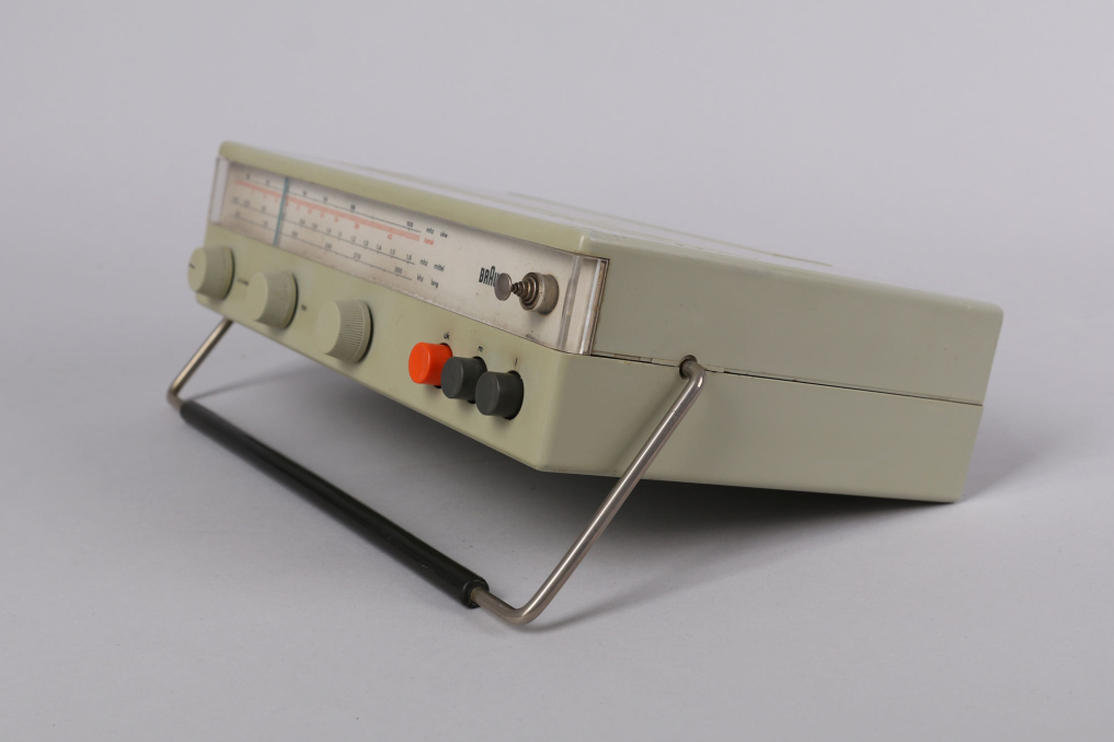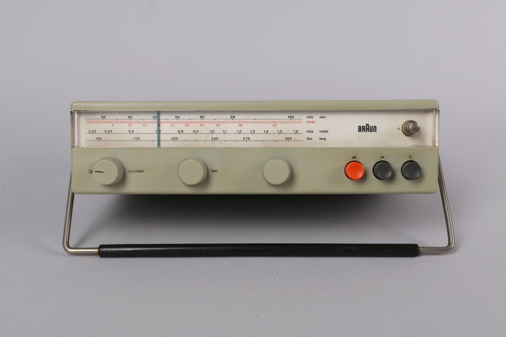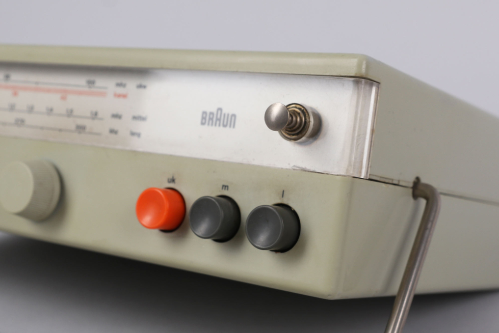Beautiful design classic Braun T 52 radio designed in Germany by Dieter Rams (1962–1964). The iconic transistor in light grey color has an adjustable metal handle and an antenna that can be pulled out. The radio can be operated with 6 x 1.5V batteries (not included). The Braun T52 is in great condition and fully operational. Please note that the radio although functional is sold as a collectors item and not meant to be used frequently due to its age.