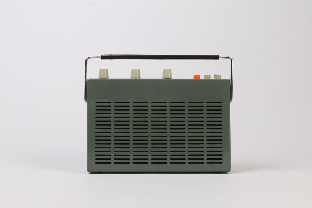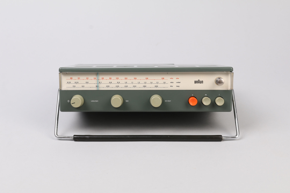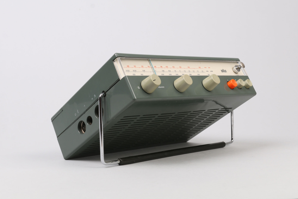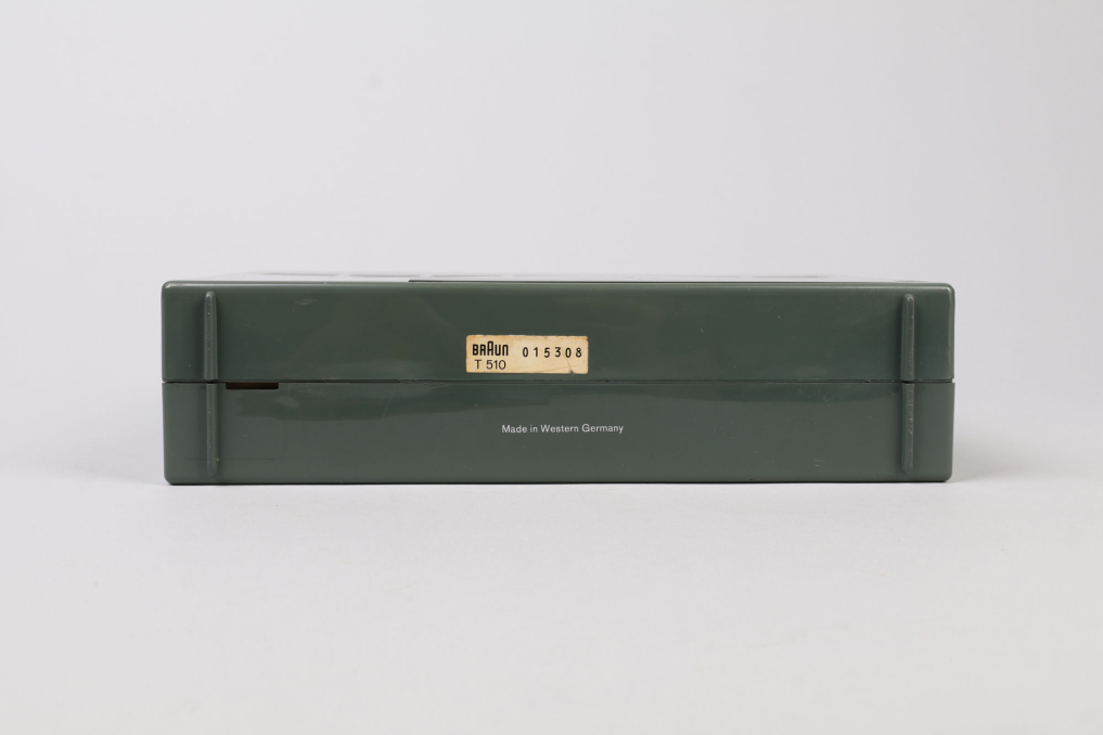 Beautiful design classic Braun T 52 radio designed in Germany by Dieter Rams (1962–1964). The iconic transistor is made of dark graphite plastic (rare!) and has an adjustable metal handle. The original antenna can be pulled out and is adjustable. The radio can be operated with 6 x 1.5V batteries (not included). The radio is in great outer condition and appears to be operational - it has not been tested to full extent! Please note that the radio is sold as a collectible item and not intended for (daily) usage!