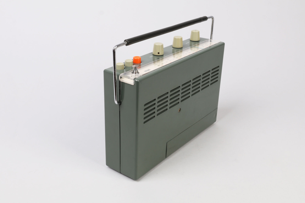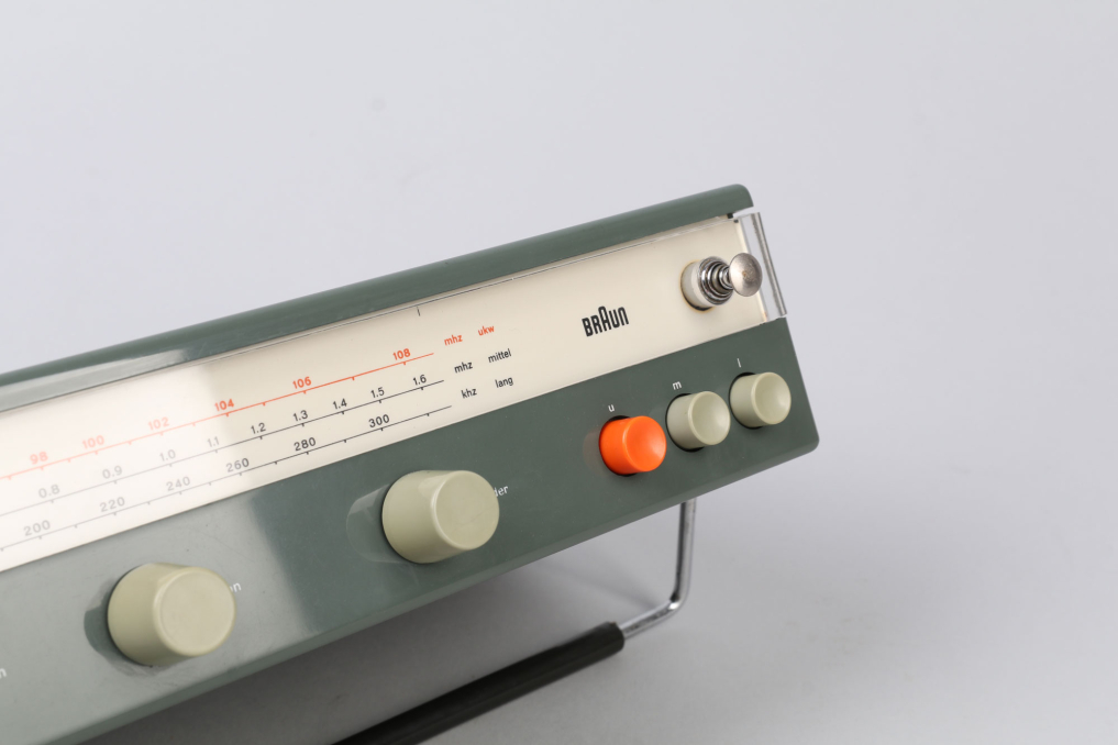 Beautiful design classic Braun T 540 radio designed in Germany by Dieter Rams (1962–1964). The iconic transistor is made of dark graphic plastic (rare!) and has an adjustable metal handle. The original antenna can be pulled out and is adjustable. The radio can be operated with 6 x 1.5V batteries (not included). The radio is in rarely great condition with only minor scratches and technically working and operational, the only downside is the knob operating the blue needle sometimes get stuck affecting ability to change stations! The battery cover is intact which is often times a known defect of the Braun T radio series. A wonderful classic for every collector.