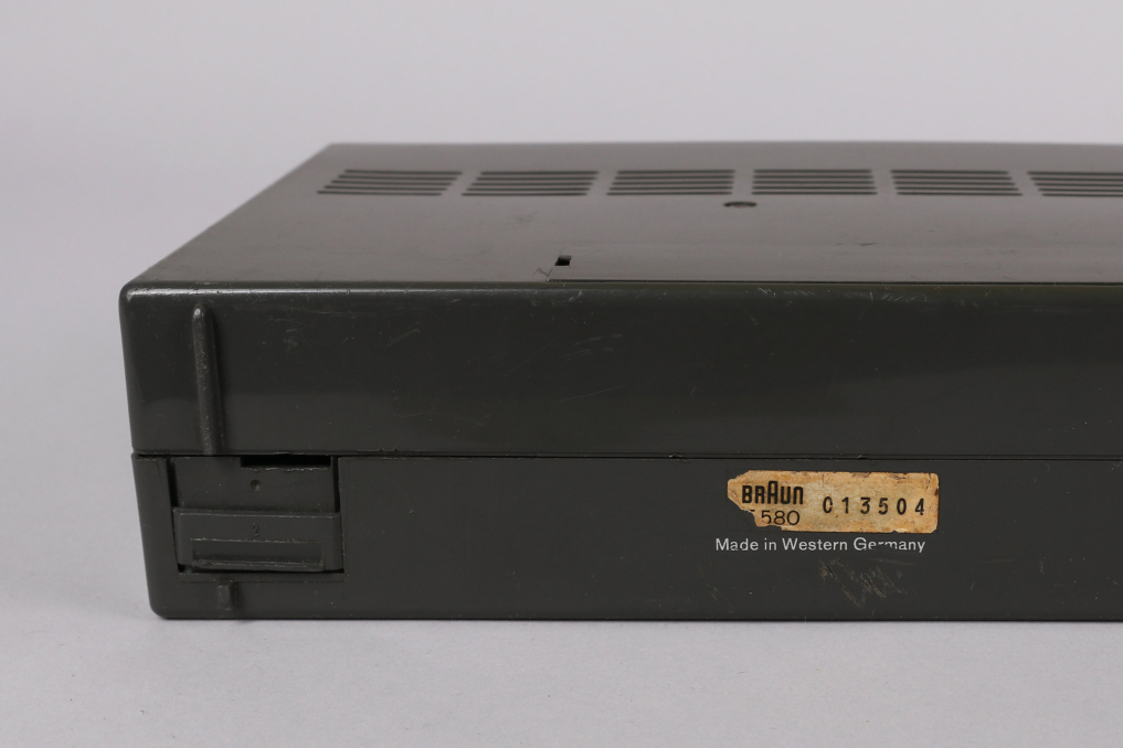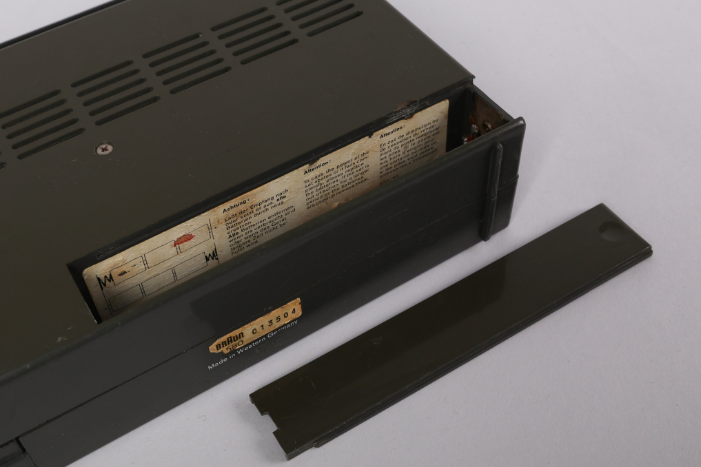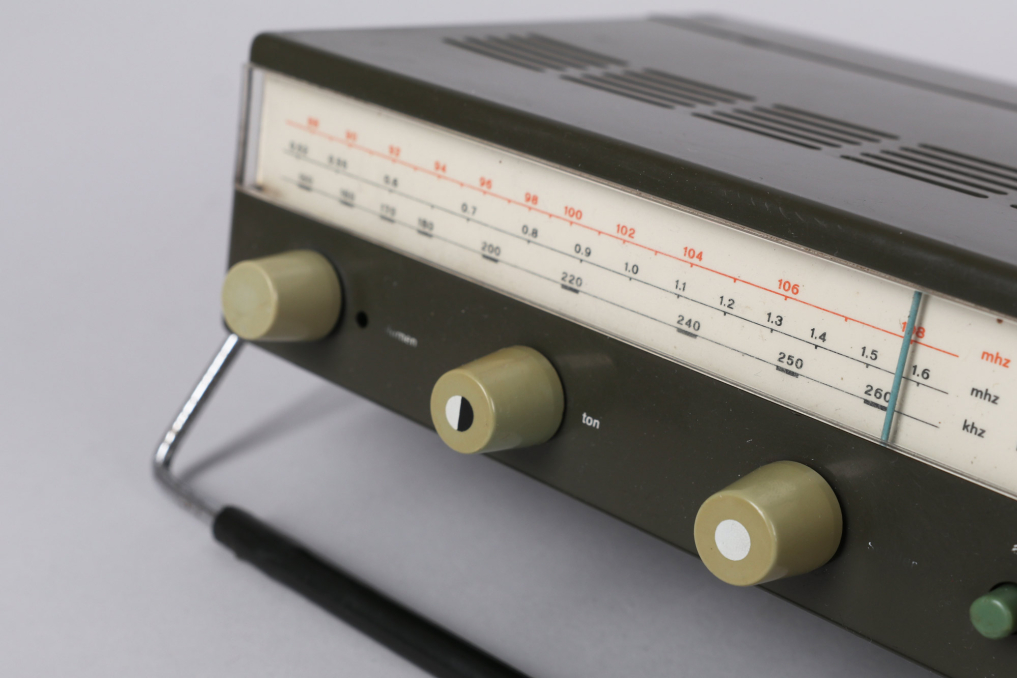 Beautiful design classic Braun T 580 radio designed in Germany by Dieter Rams (1962–1964). The rare and iconic transistor is made of dark graphite plastic (rare!) and has an adjustable metal handle. The antenna can be pulled out and is adjustable - however it can not be pulled into radio unit fully. The radio is in a good outer condition with minor scratches but no broken pieces. Currently it is missing a spring in the battery department and thus it has not been tested to full extent! Sold as an iconic collectible item.