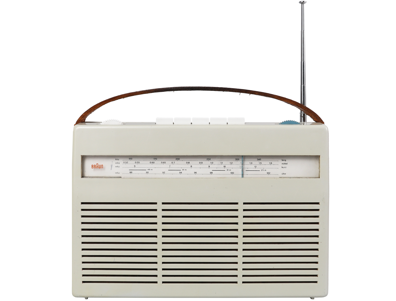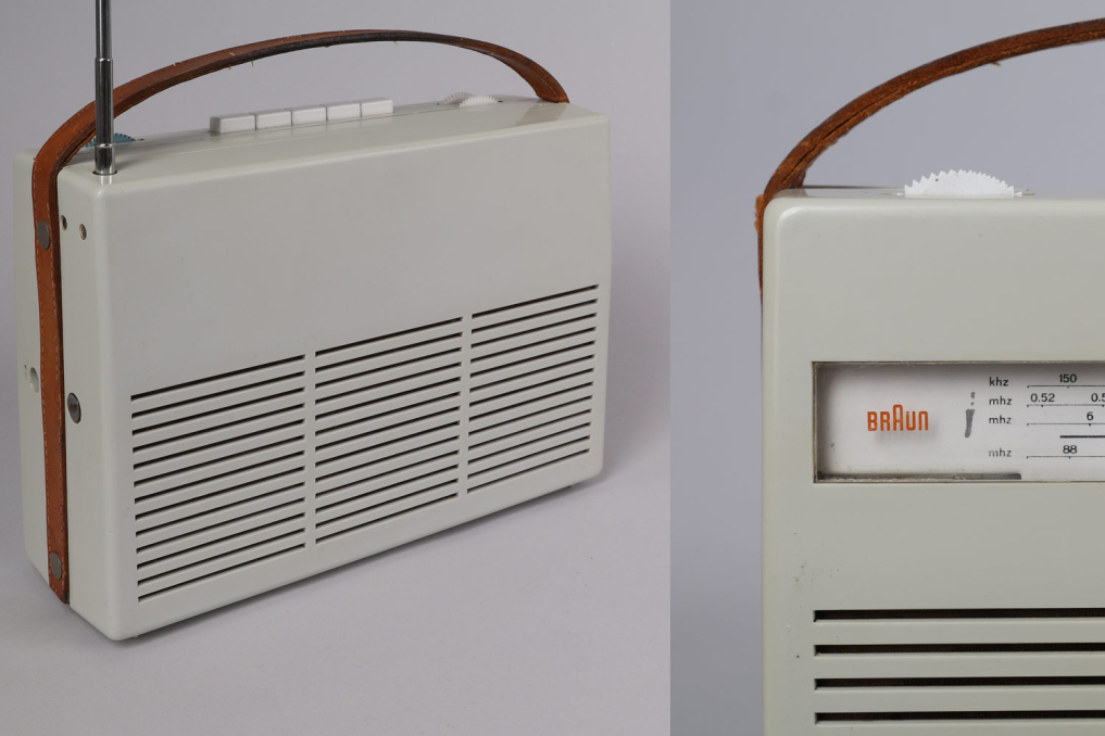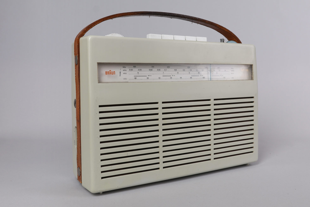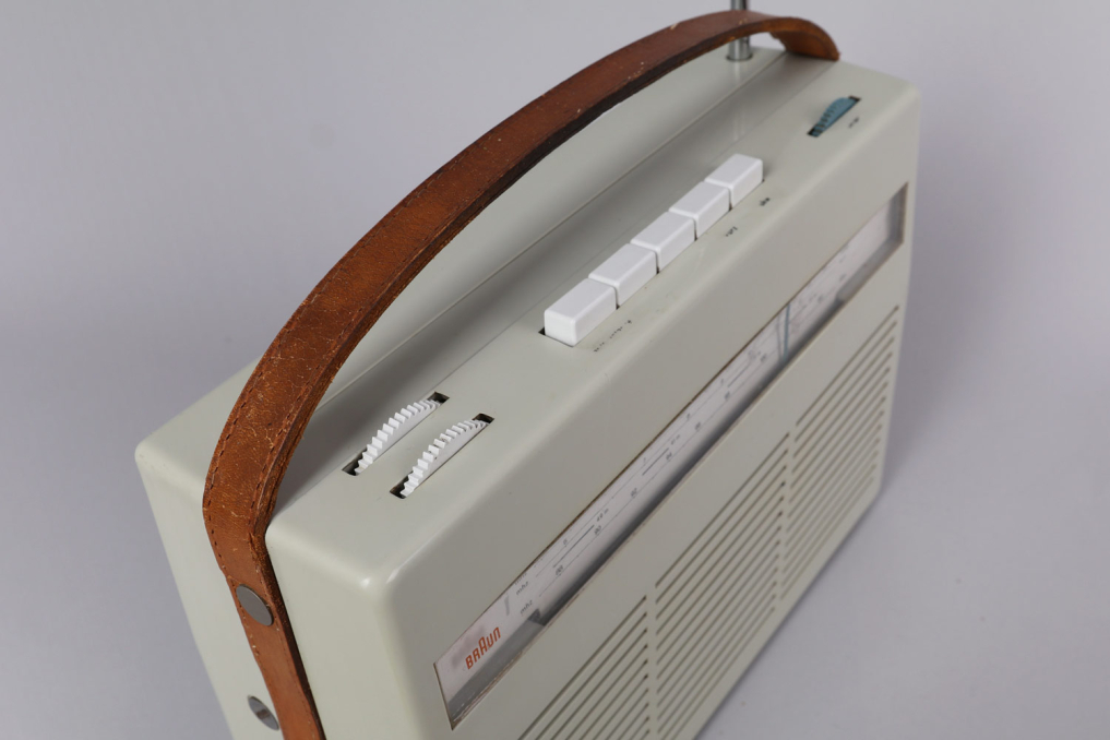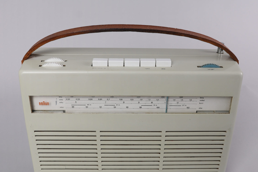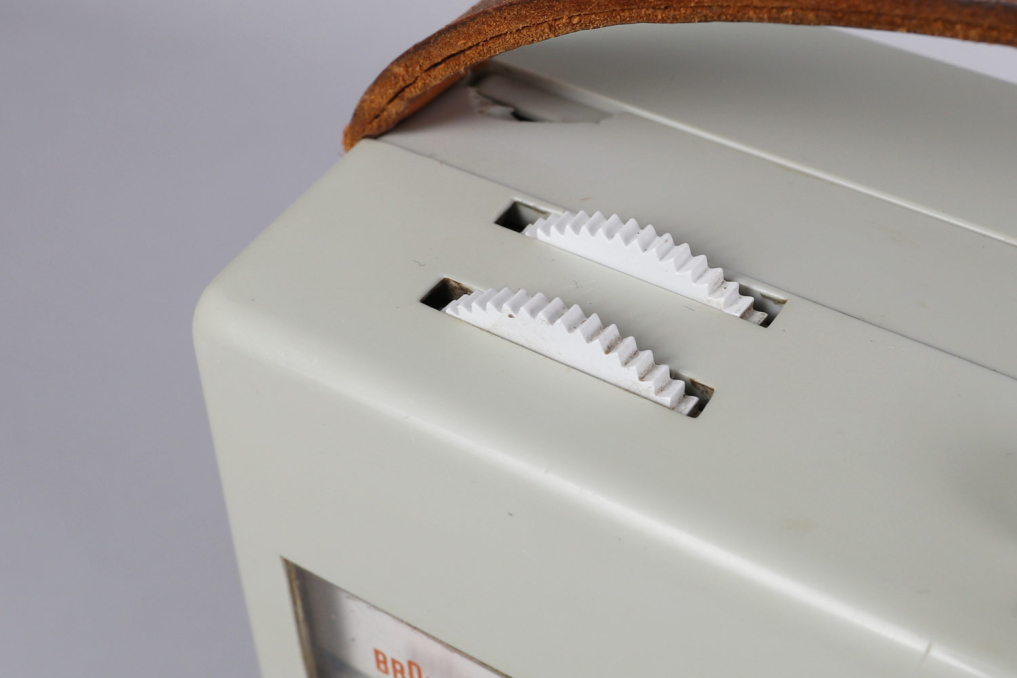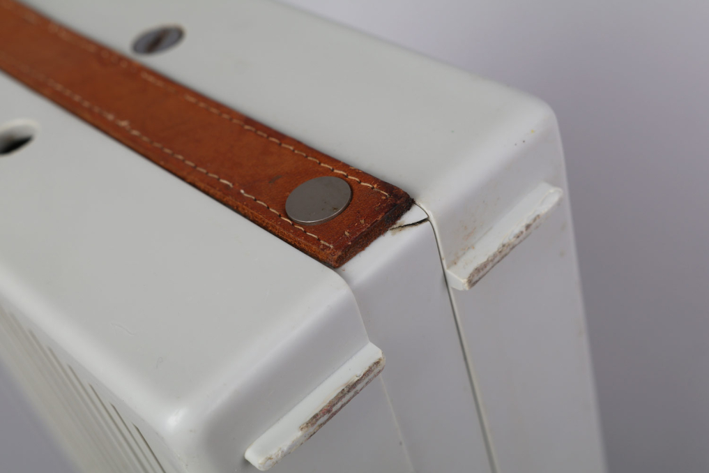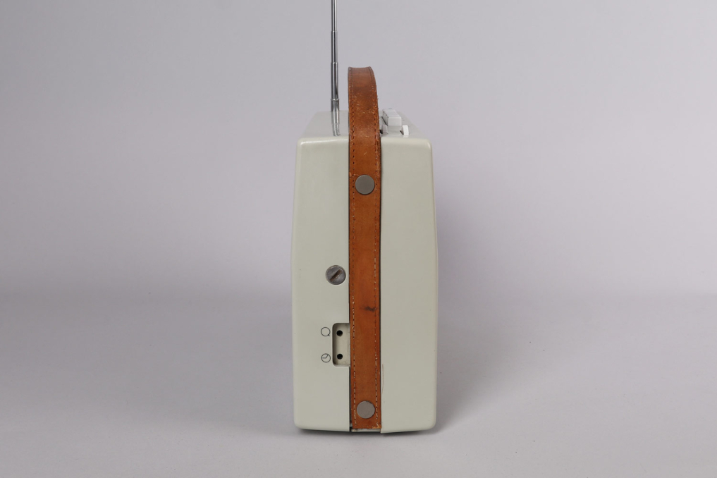 Beautiful and very rare design classic radio “Kofferempfänger“ by Braun - Type T22 / T 22. Designed in Germany by Dieter Rams in 1957. The iconic & timeless radio is made of light-grey plastic and is held by a brown leather belt. Beautiful original working condition with small cracks on plastic (see images). The antenna can be pull out of the radio with adjustable size and possibility to rotate (last part has been reclaimed and glued together).