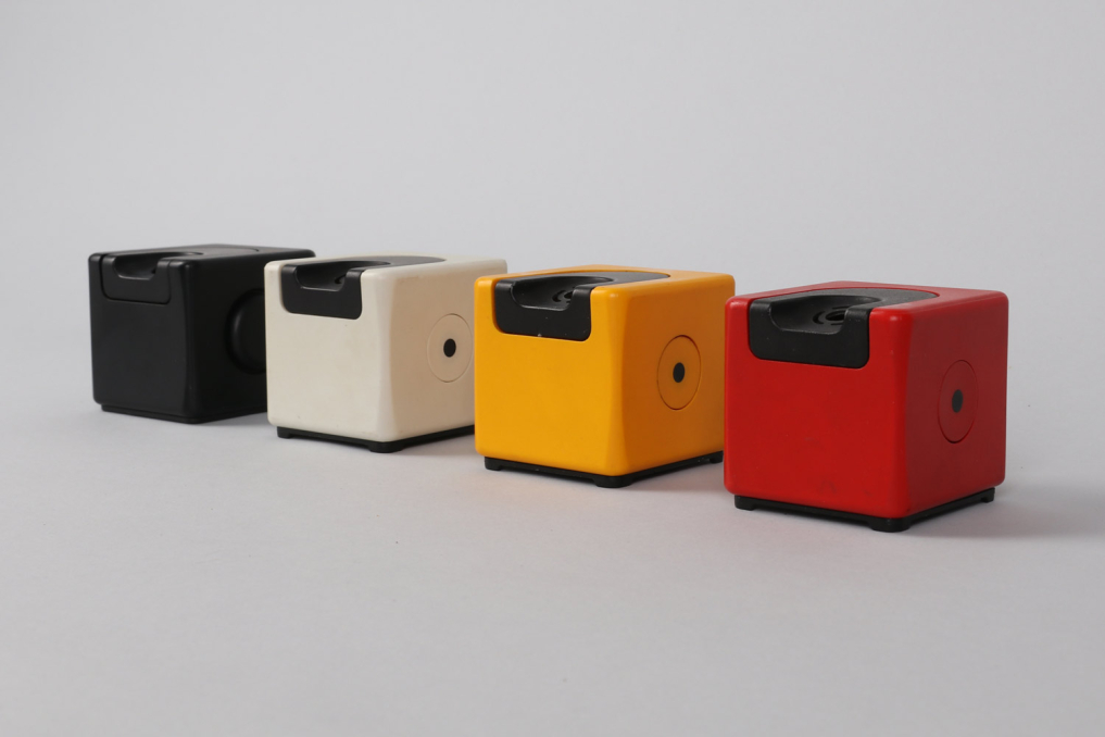 Yellow cubic Braun T4 domino table lighter designer by Dieter Rams in 1970 made of plastic with a metallic top. This particular model has a button on the side, with an electric trigger and can be refilled with gas on the bottom. This is where you also find the control of the flame intensity and batter compartment. The overall condition is good, the function is not proven. Please note we are selling the lighter as a collectible item.