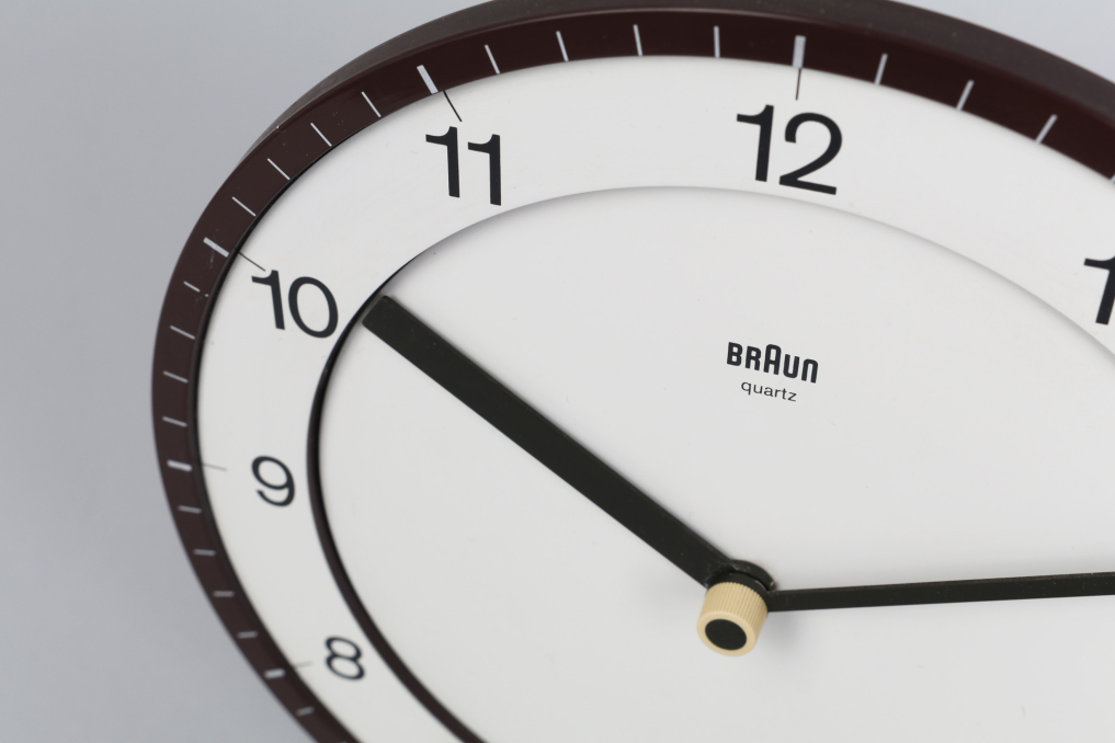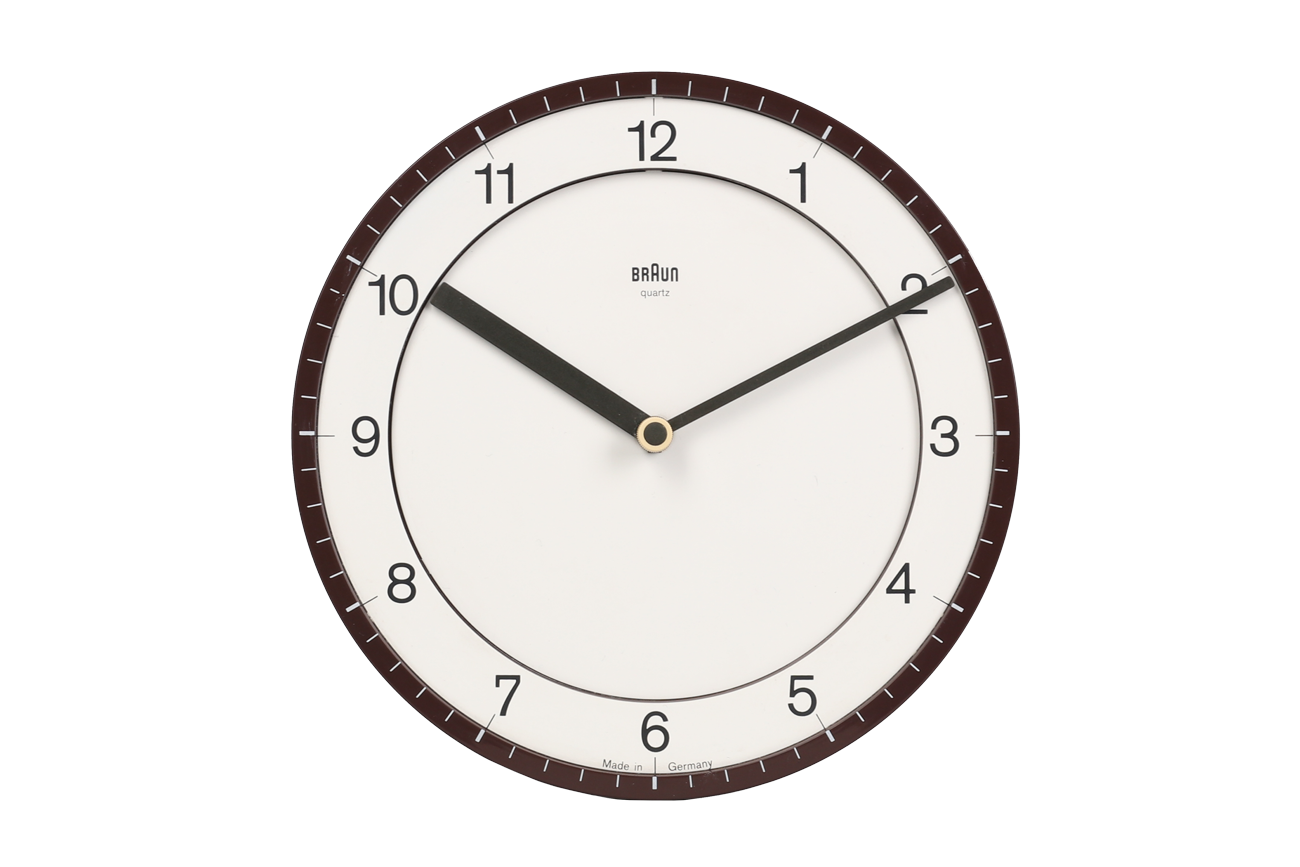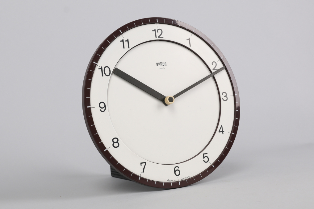 The Braun A 4861 / ABK 30 wall clock, designed in the early 1980s, is a precise and understated timekeeper that reflects the design principles of Dietrich Lubs and Dieter Rams. Its dark brown housing, clean sans-serif numerals, are iconic and form a visual language that is both utilitarian and timeless. With a 20 cm diameter, this quartz-powered wall clock was originally intended for institutional and office environments, yet today it stands as a modernist design object in its own right. This example is in excellent condition, fully functional, and retains its original high-contrast face and casing with only minimal signs of wear. A definitive piece from Braun’s golden era of product design—silent, sharp, and always on time.