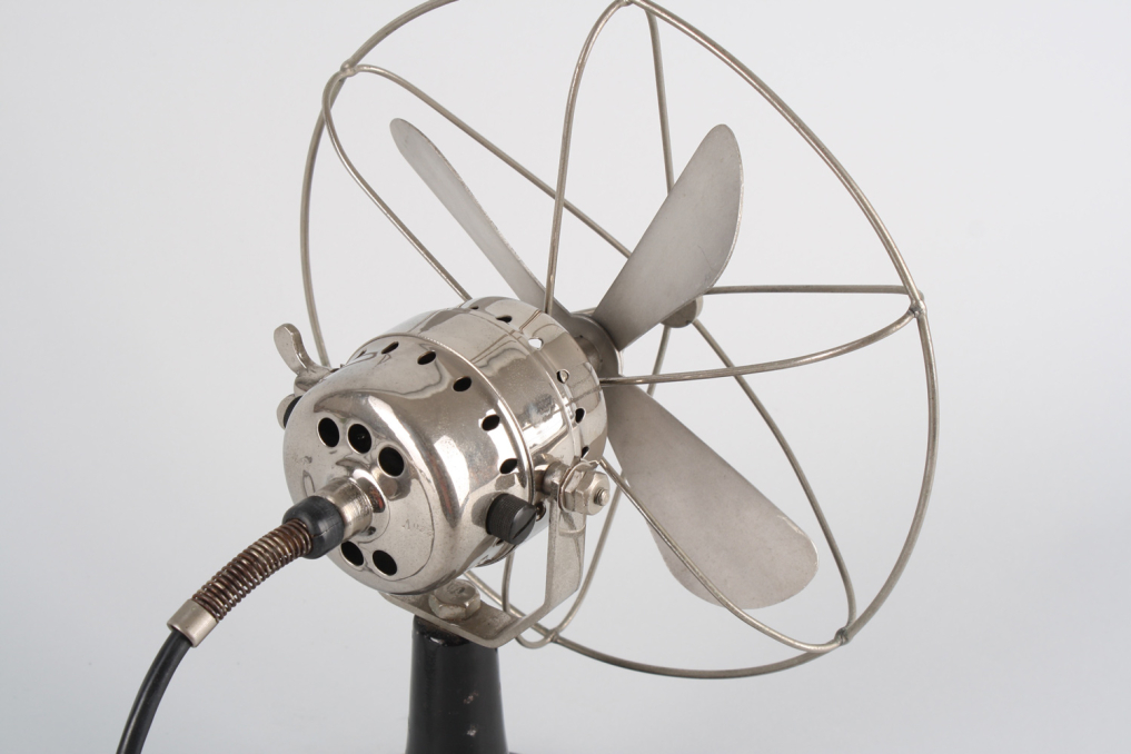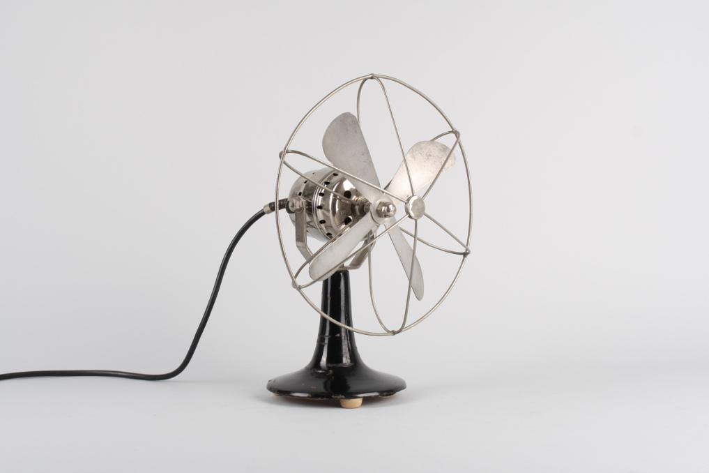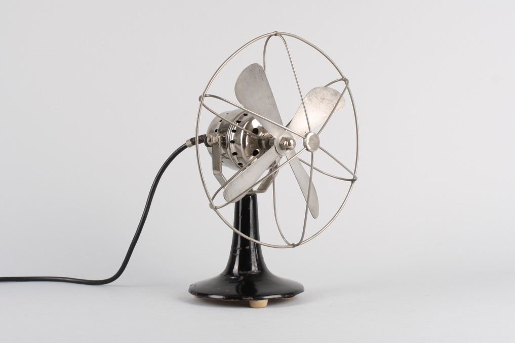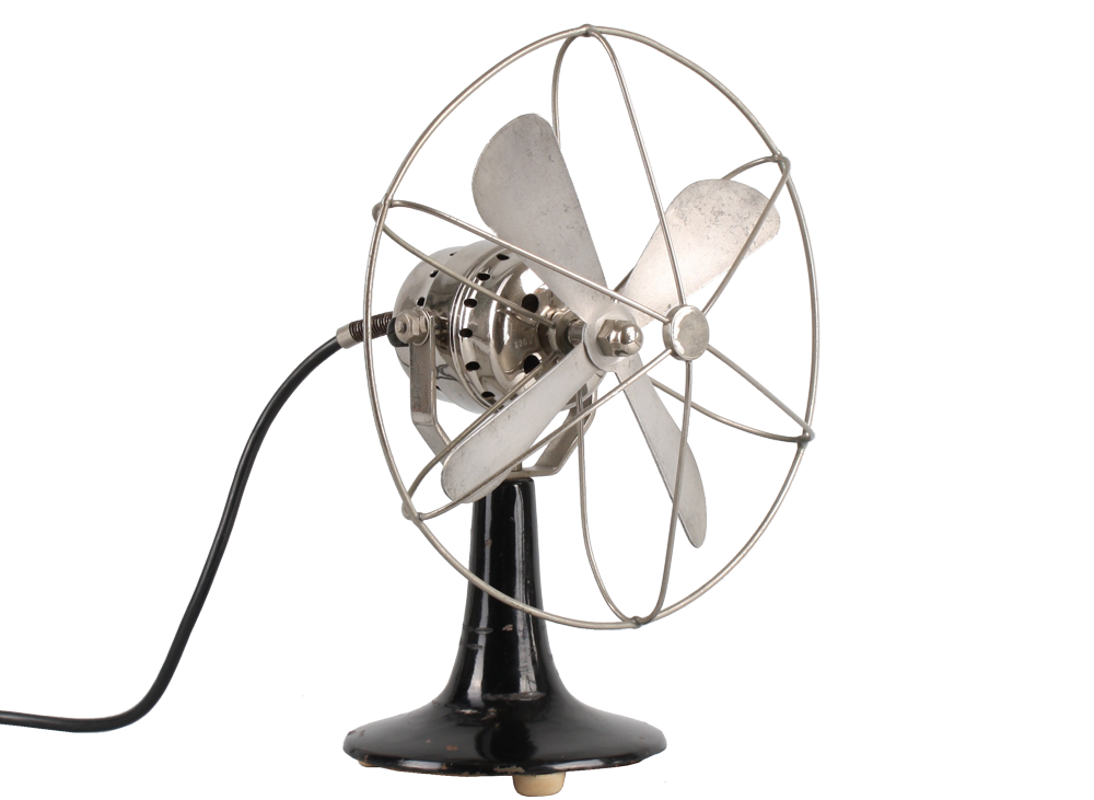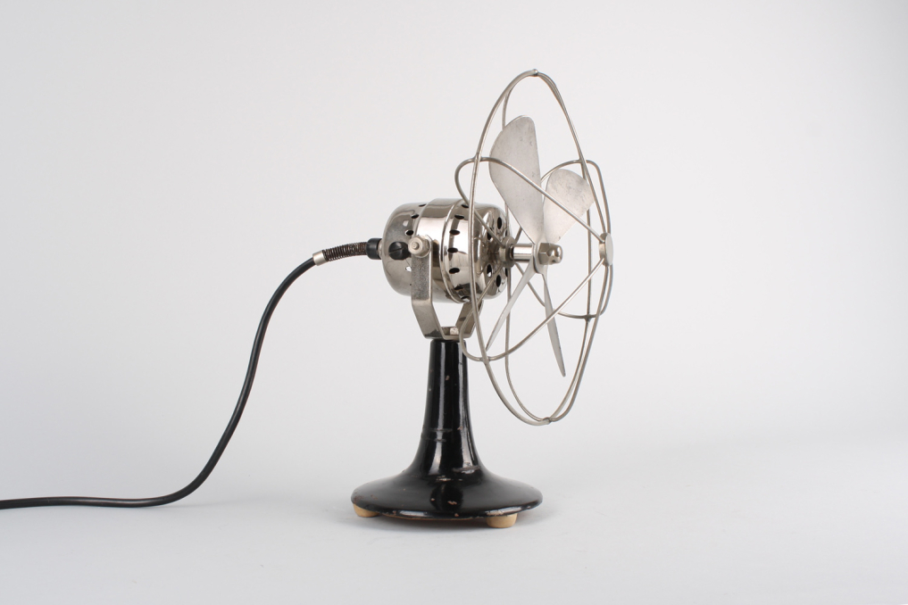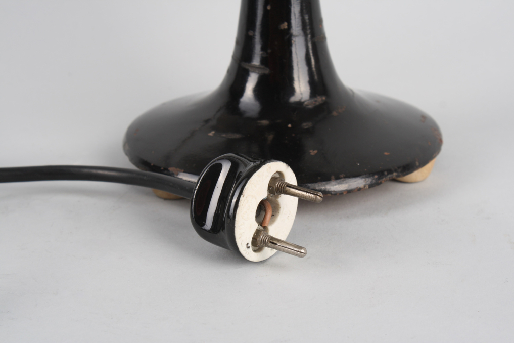 Beautiful vintage metal fan made by Calor in the 1930s (Bauhaus era). The bottom metal housing is painted in original black color and the top including the wire cage and fan comes in beautiful polished silver chrome. The industrial fan is equipped with original black cable and an ancient German plug made of ceramic (can not be used nowadays anymore). Fan is functioning (220 V), but is mainly intended for decoration purposes. Excellent original condition with very little patina.