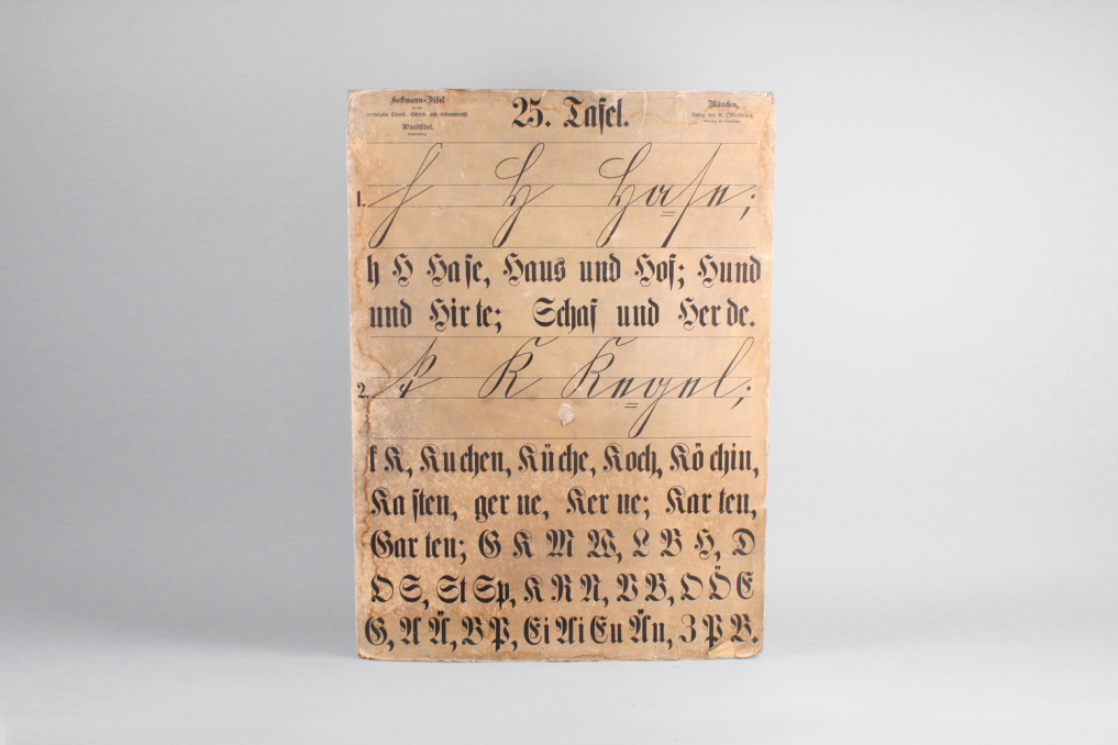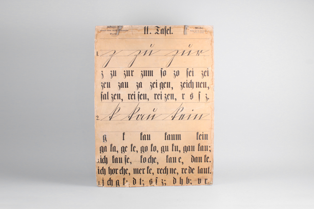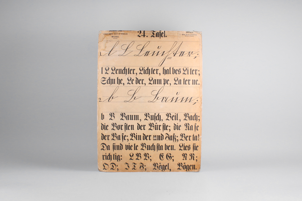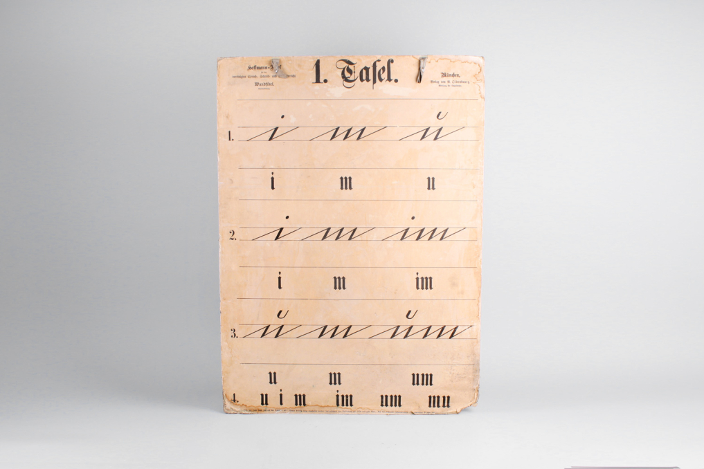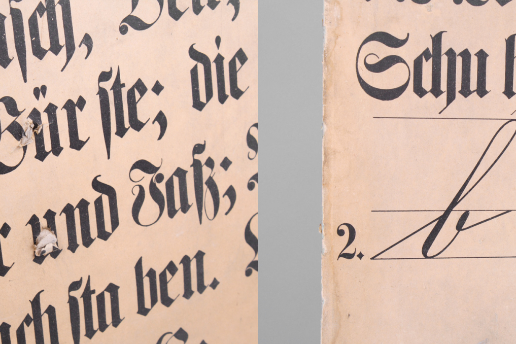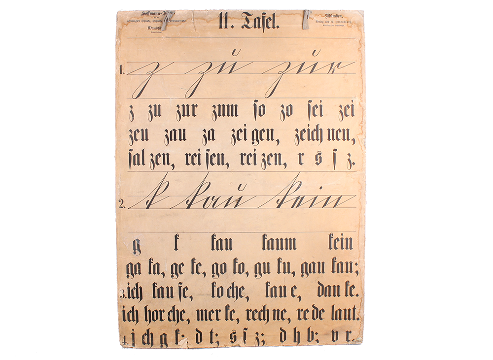 Beautiful vintage German school education poster board with broken type explanations including words and letters. Each cardboard is printed on both sides. Only sold as a set. Stunning capital lettering and typography – a true piece of art and design. Published R.Oldenbourg Verlag München by Röhr-Verlag München. Estimated time of print: 1910 - 1930. Printed on cardboard with beautiful patina (partly demaged paper) Very good condition due to stunning age.