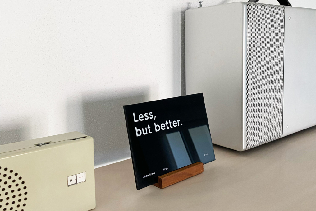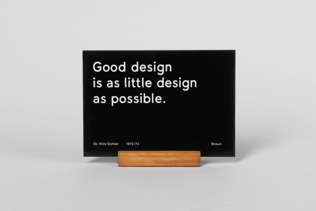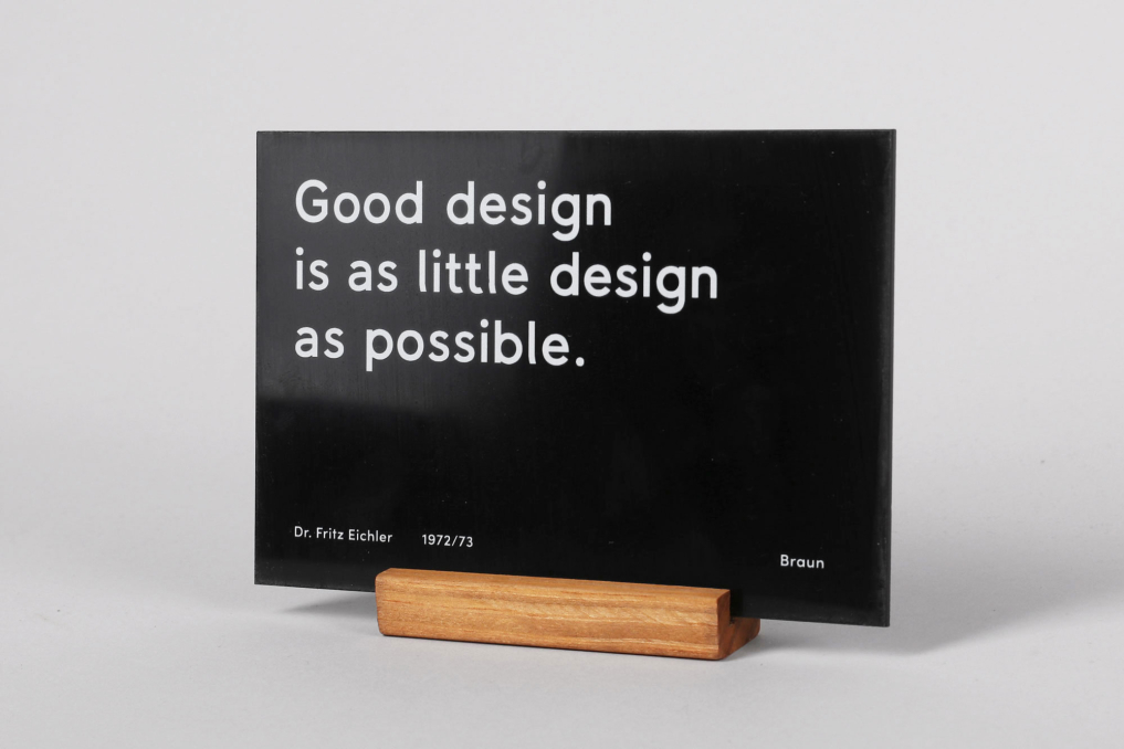 This Braun inspired desk display with the famous "Good design is as little design as possible" quote is printed in white on a black Acrylic and comes with a wooden base. Exclusively designed & produced by Only / Once. The display stand is a perfect addition to any Braun product collection. *NOTE: If you are more flexible on your delivery time, we can ship it for a cheaper rate - Please reach out via email info@onlyonceshop.com*
