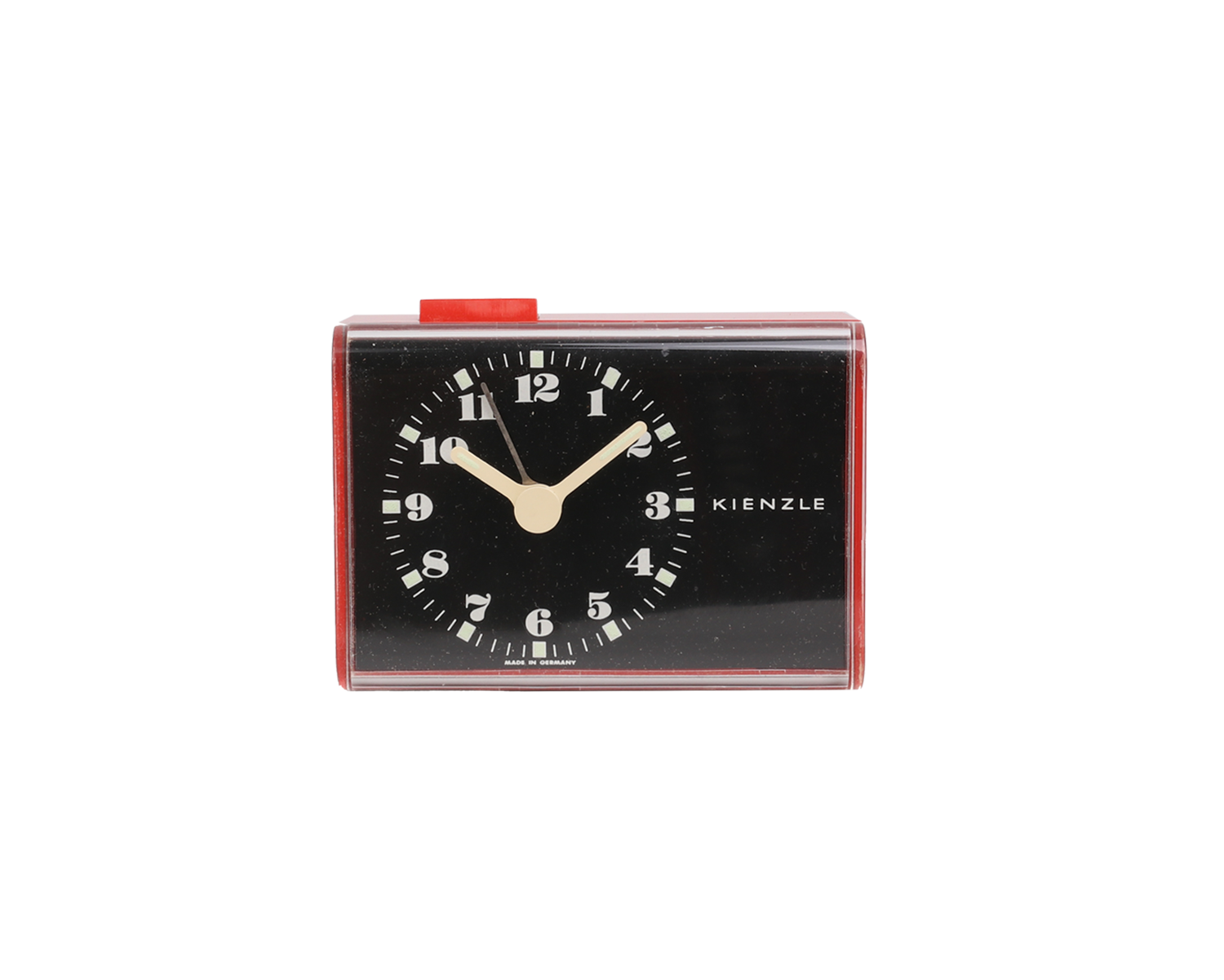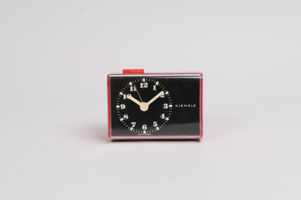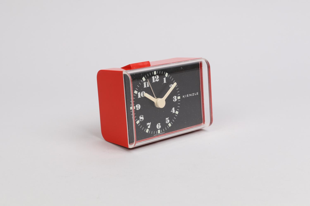 The compact Kienzle alarm clock is equipped with an alarm signal and a quiet quartz mechanism. Its beautiful timeless design fits well into every designers hole. Like most of the world's very best timepieces, this clock operates in the analog domain, with a sweep second hand. Elegant red color plastic housing. Requires one AA battery (not included). Excellent original condition (working).