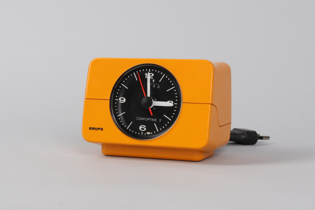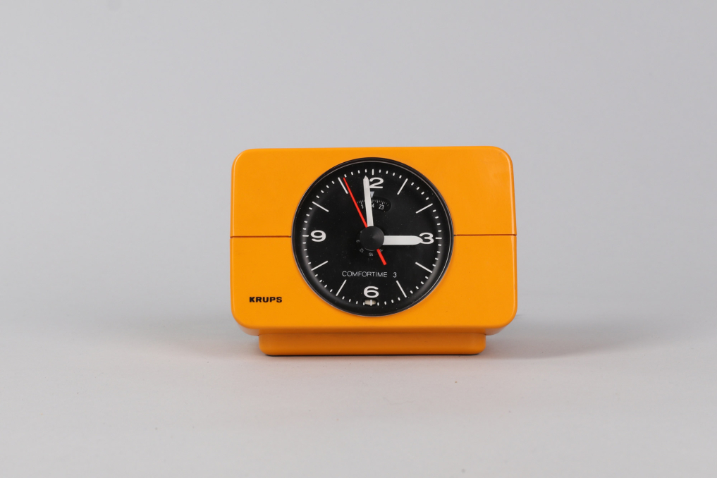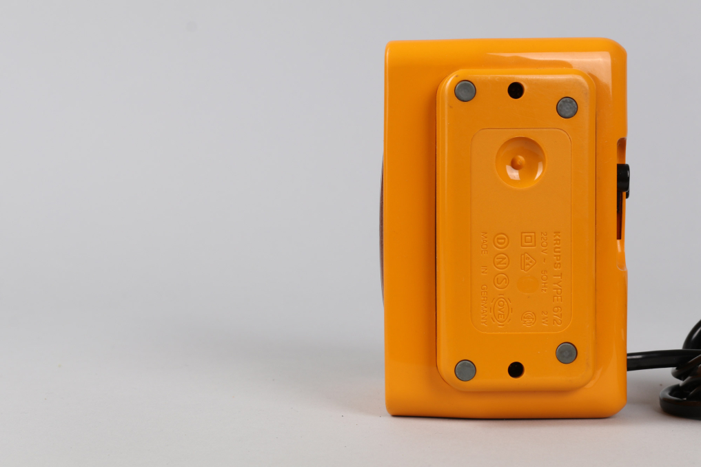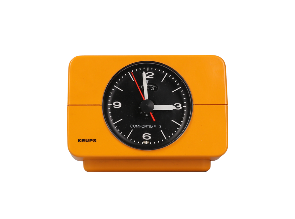 Krups Type 672 alarm clock in yellow color. Designed in 1970s. Made in Germany. Great working condition. A beautiful timeless clock. Runs on 220V (EU Plug)