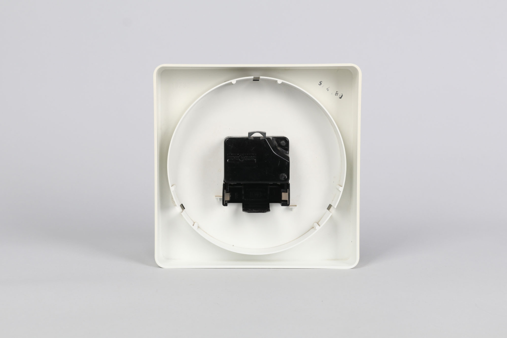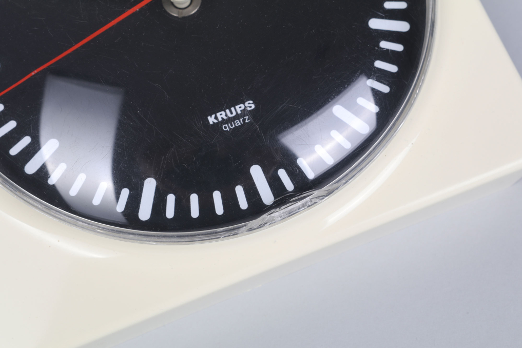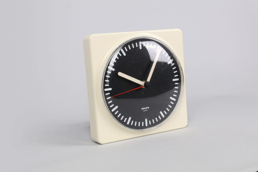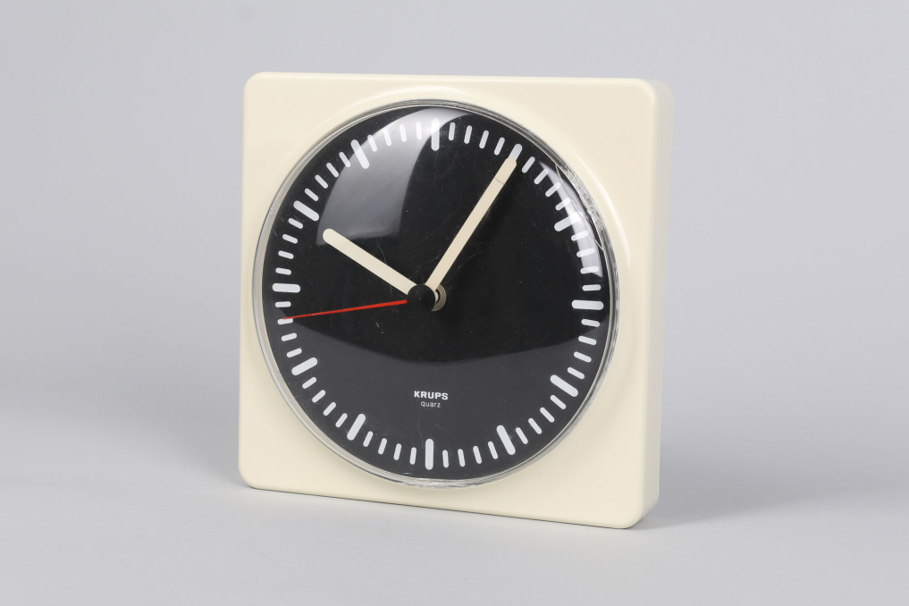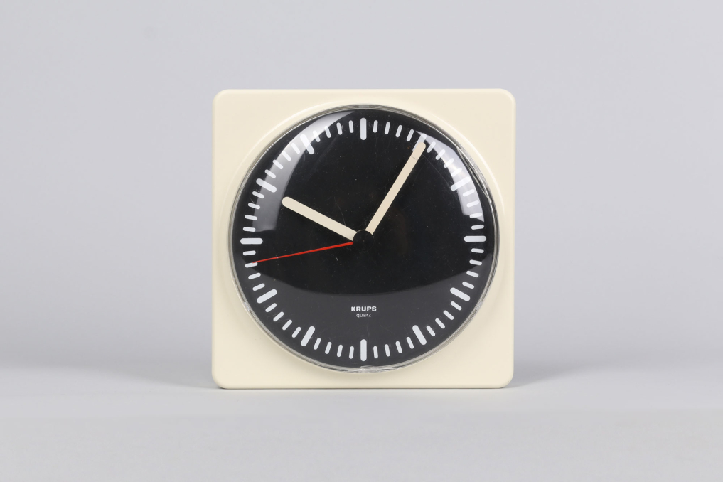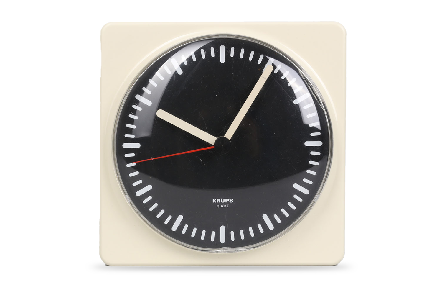 This Krups quartz clock from the 1970s showcases a timeless design with a bold black dial, contrasting white hour markers, and hands, accented by a striking red second hand. Its minimal aesthetic and functional precision reflect classic German craftsmanship. Perfect for adding a touch of vintage elegance to your space, this clock is a practical yet iconic piece of design history. On the right side and bottom the transparent plastic cover has a slight defect that is only visible if you look close enough.