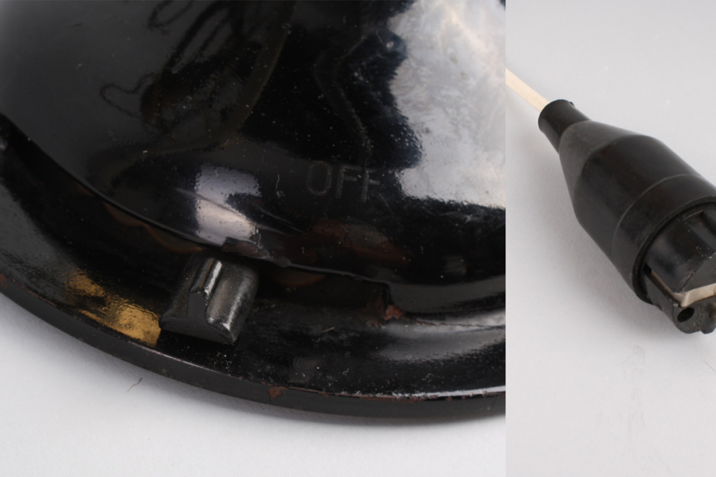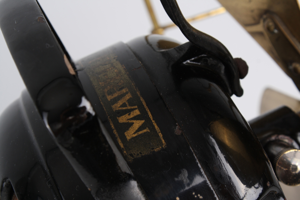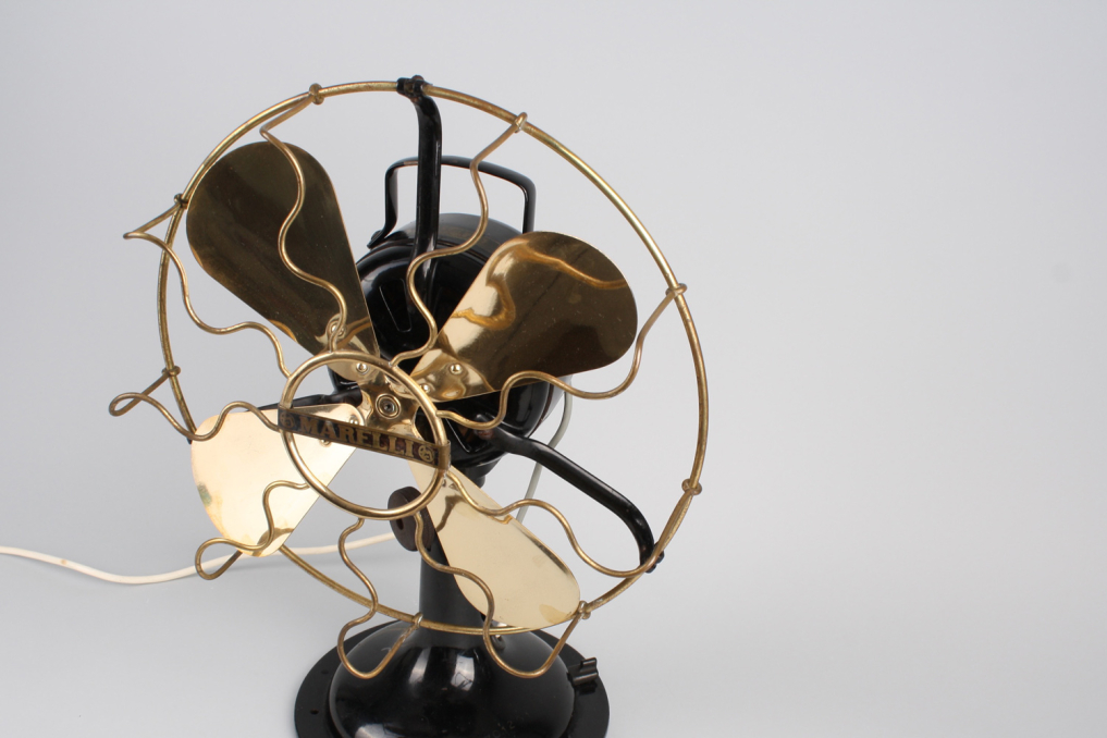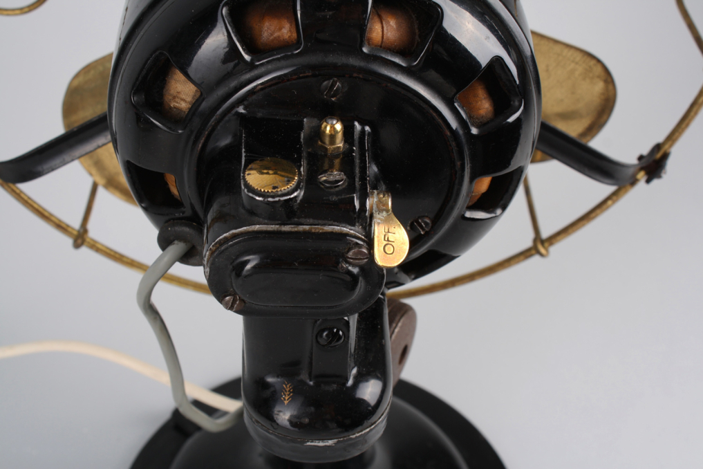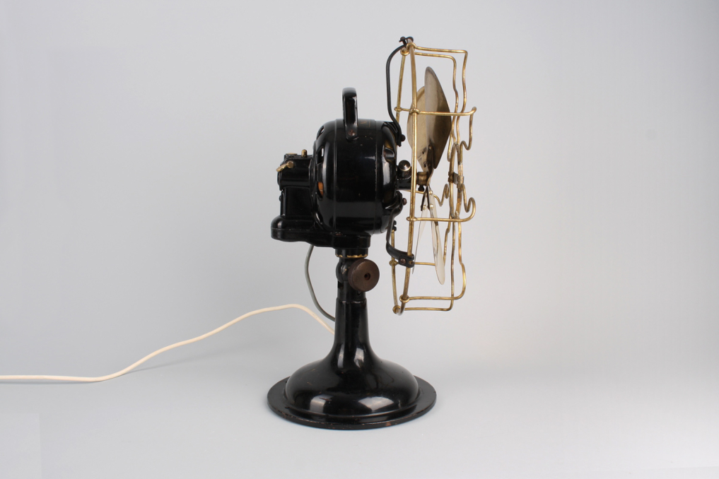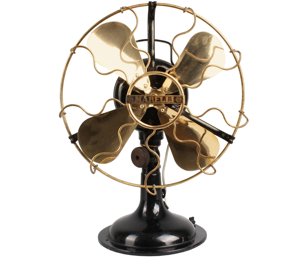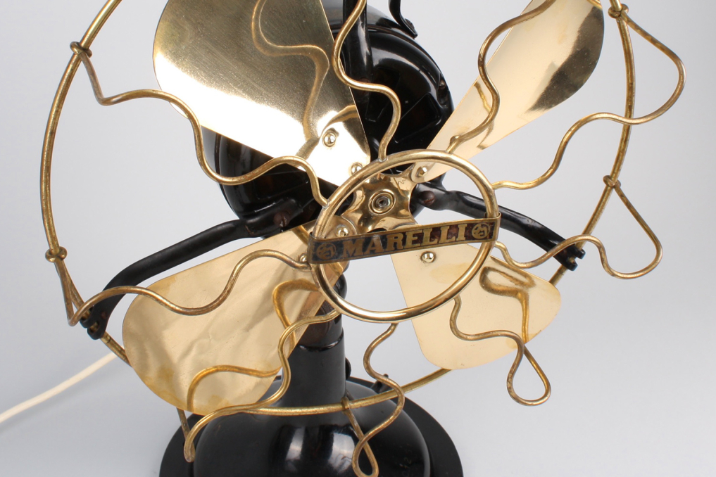 Beautiful original vintage heavy metal Marelli fan, designed and manufactured in Italy in 1930s - 1950s. The metal housing is in excellent original black color. The fan and iconic metal cage comes in beautiful polished gold - with almost no scratch and absolutely top condition . The industrial fan comes with white wire cable (220V) and german plug. Fan is functioning, and has built in rotation function. However due to age fan is mainly intended for decoration purposes. Excellent condition.