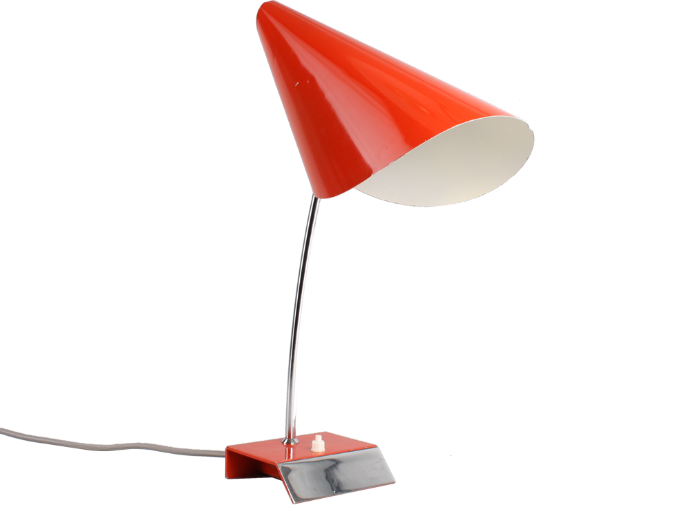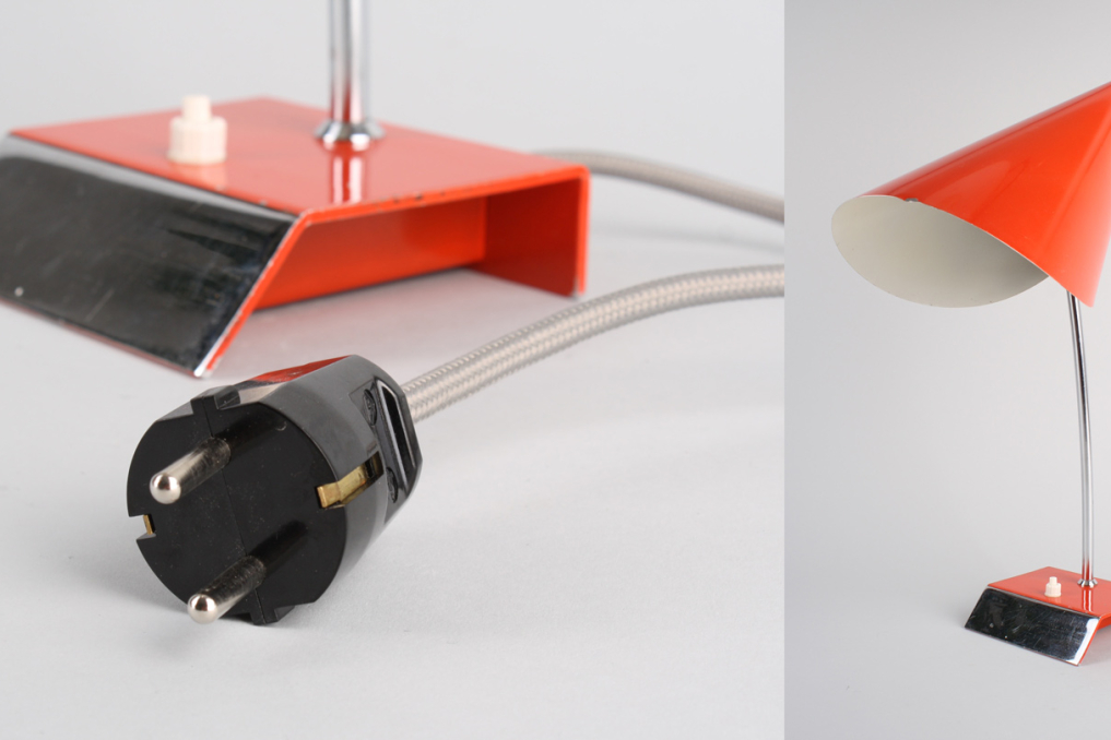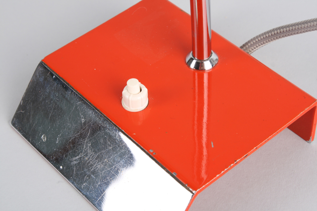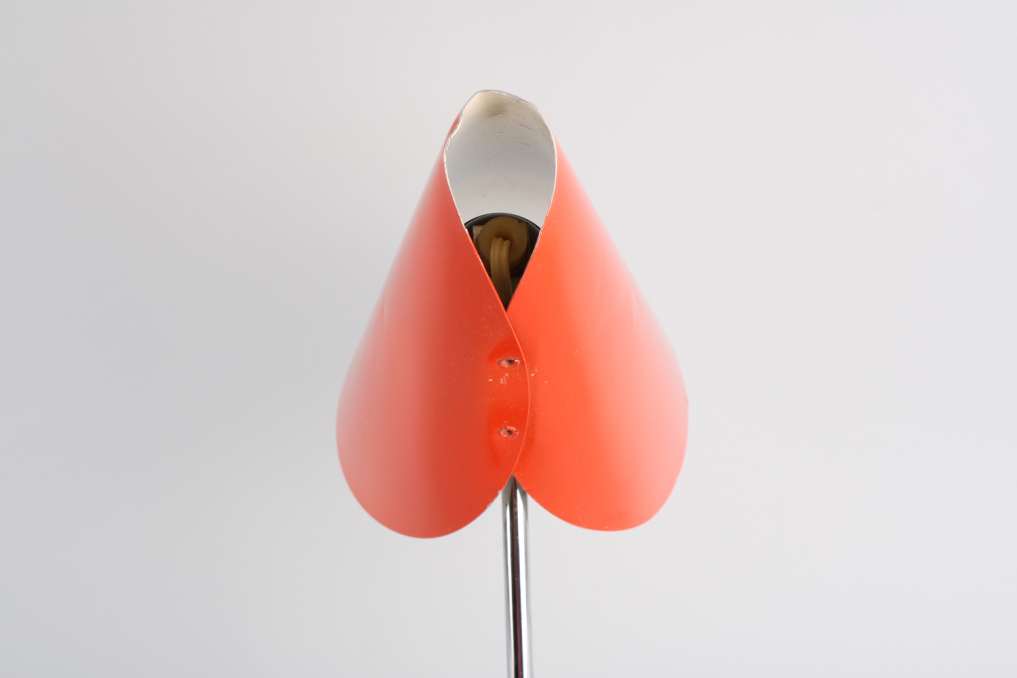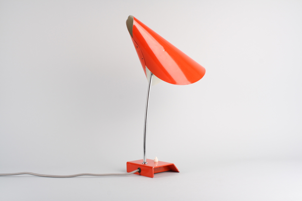 Beautiful original vintage table lamp designed by famous czech designer Josef Hurka and manufactured by Napako. Made in Czechoslovakia in 1950s. Materials used: orange painted metal with details made of chrome, new textile cable & German plug (220V). Excellent condition: Partly renovated original.