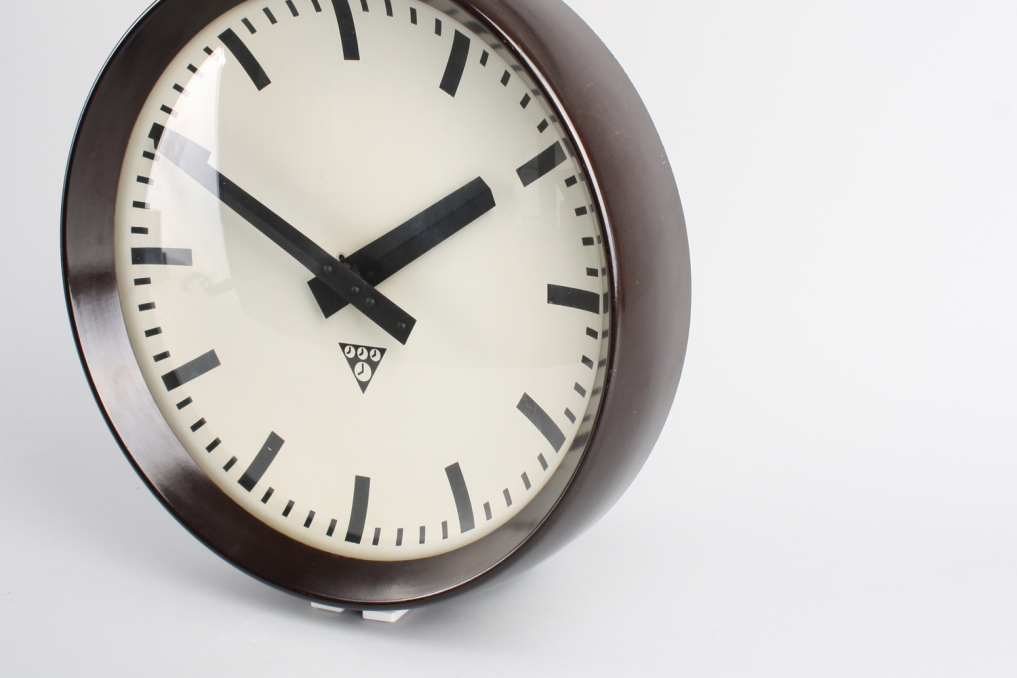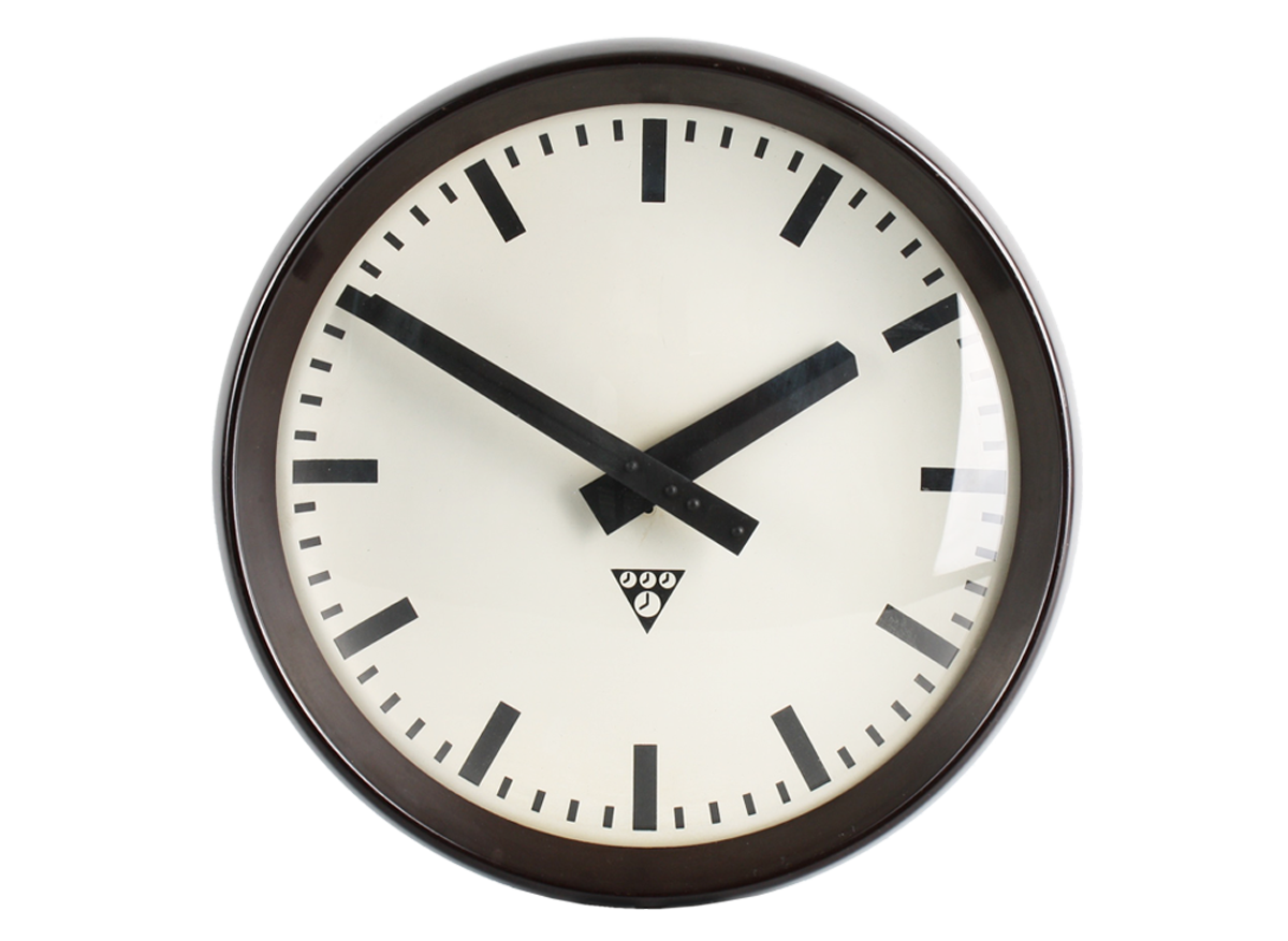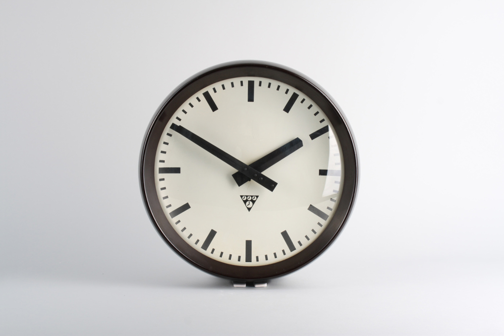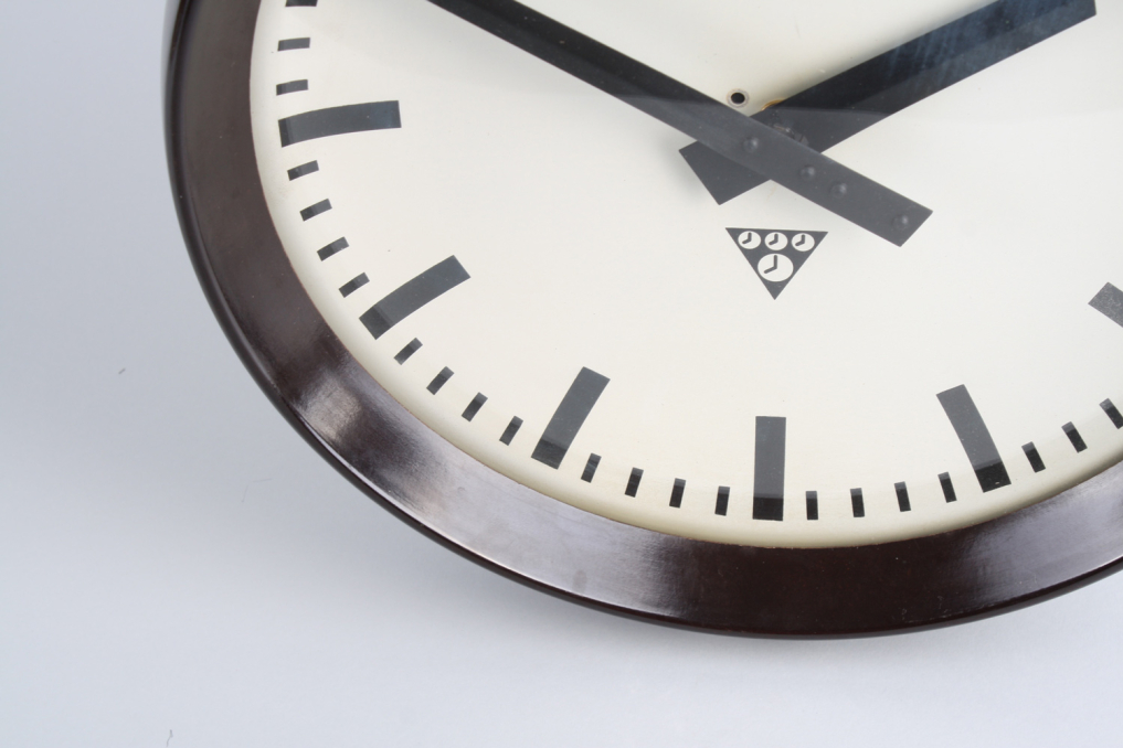 Vintage Pragotron industrial interior wall clock made of bakelite. The face is concave and made of aluminium & the glass cover is convex. Designed and made in Czechoslovakia in 1960s. Converted to battery-powered clockwork, 1 x AA battery. Excellent Condition: Partially renovated.