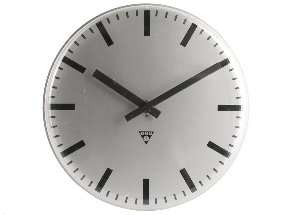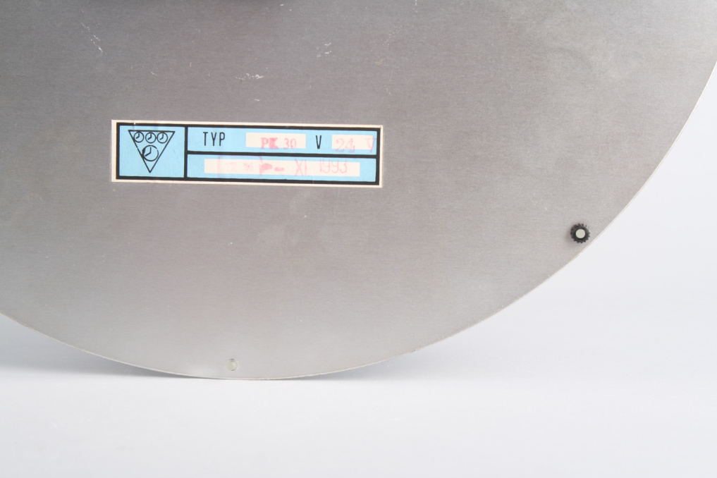 Vintage round Pragotron PK 30 interior wall clock made of aluminium, covered with transparent plastic. Designed and made in Czech Republic in 1993. Converted to battery-powered clockwork, 1 x AA battery. Excellent Condition: Partially renovated.