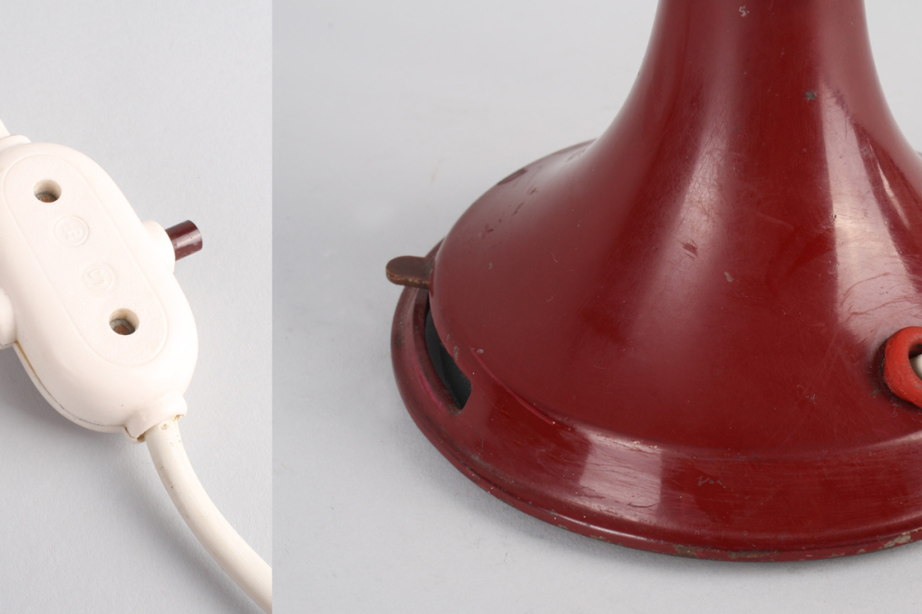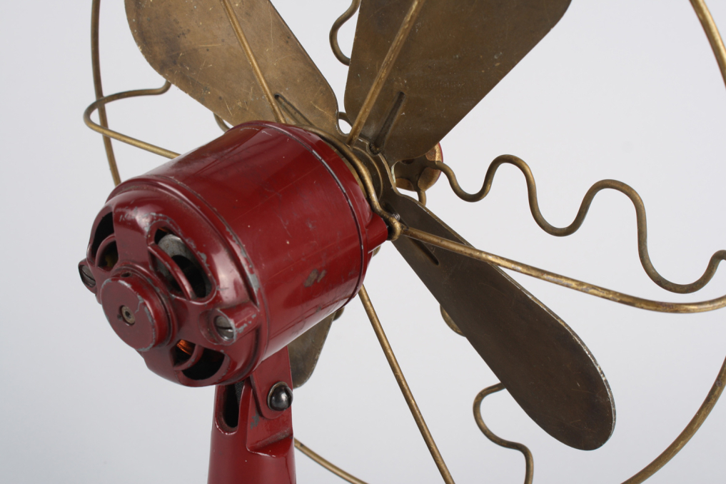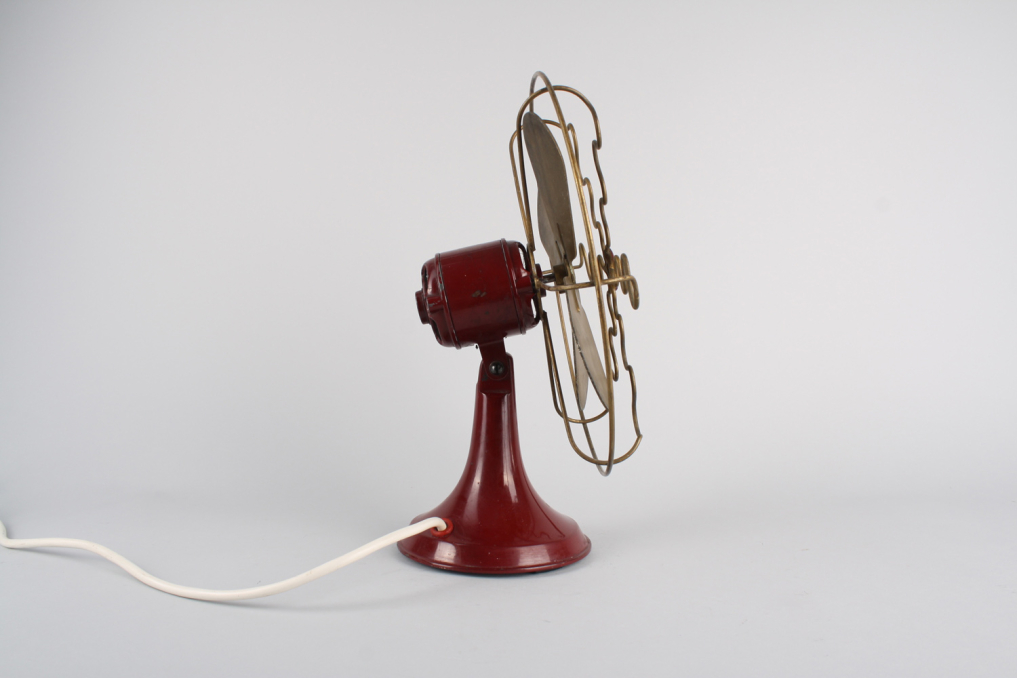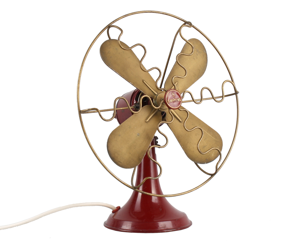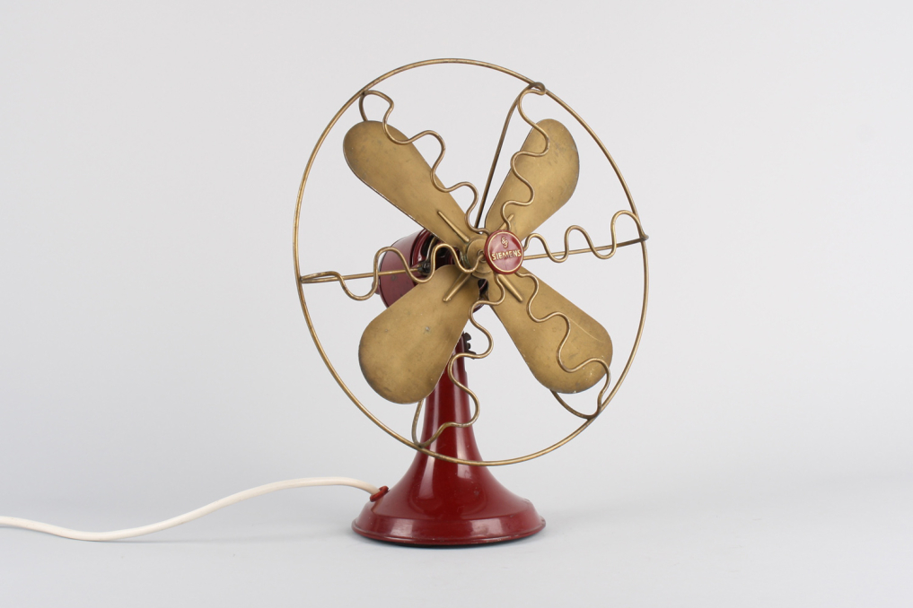 Beautiful original dark red metal Siemens & Schuckert fan, designed and manufactured in Germany in 1920s - 1930s during Bauhaus era. The metal housing is painted red and the iconic golden wire cage has the Siemens logo in the middle. The rotating is golden and made of metal. The industrial fan comes with white wire cable and German plug (220V). The fan might be operated through a switch on the bottom of the fan from Low, Medium to High Very good original condition with patina due to its age: partially reclaimed. Sold as decoration object. Working condition, but not intended for regular use due to 100 years of age.