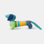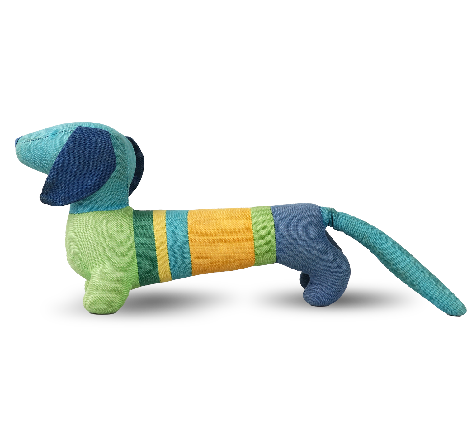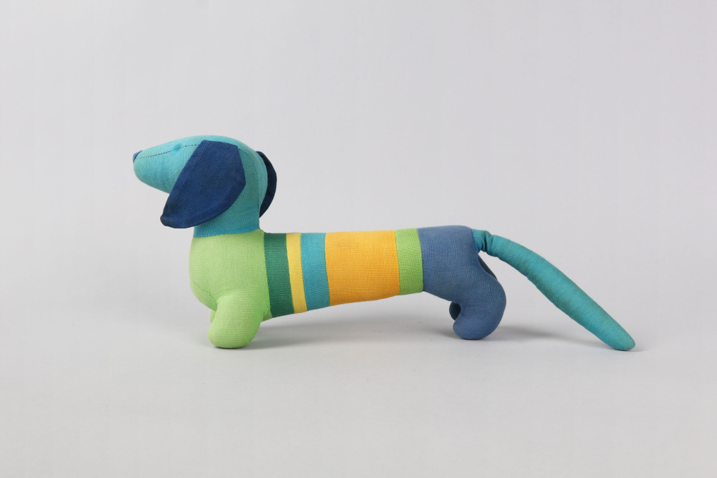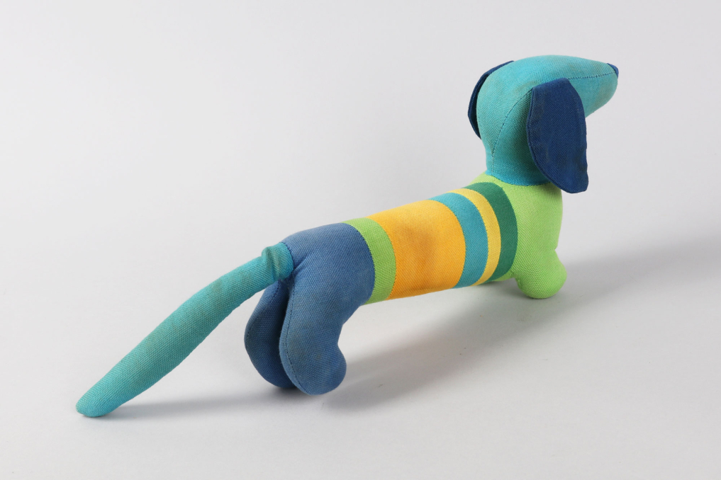 This 1972 Munich Olympic Games mascot, "Waldi", features the distinctive and iconic brand identity design of Otl Aicher. The mascot, a dachshund, is colored in green, blue, and yellow, representing agility and endurance. This dachshund is in well preserved condition with slight water stains patina indicative of its age (made in 1972). Originally missing its eyes, replica eyes made of felt are available on request. Waldi stands as the first official Olympic mascot, making it a notable collectible for enthusiasts of Olympic history. Please note that you are purchasing the dachshund without the collateral as shown on certain images.